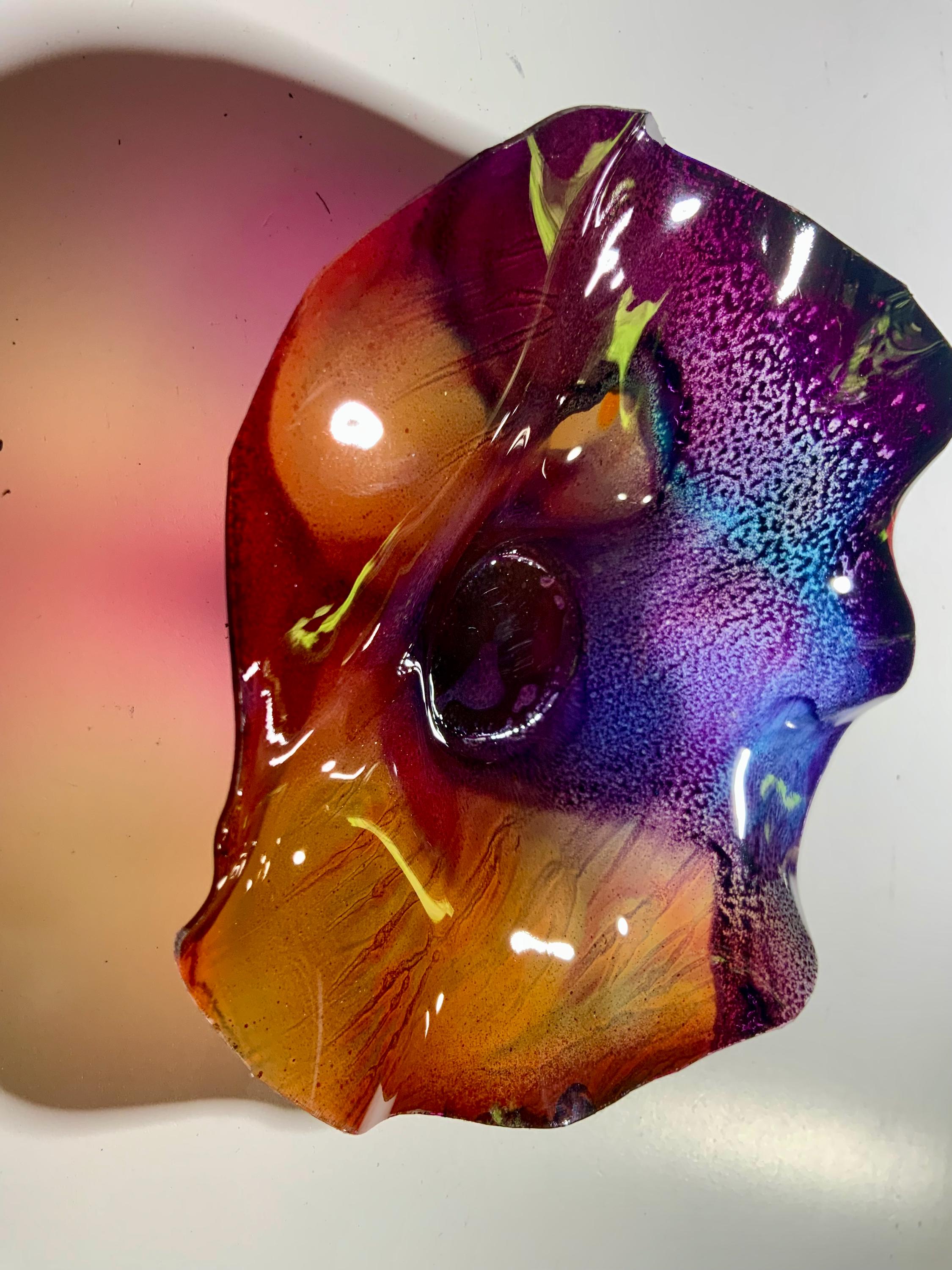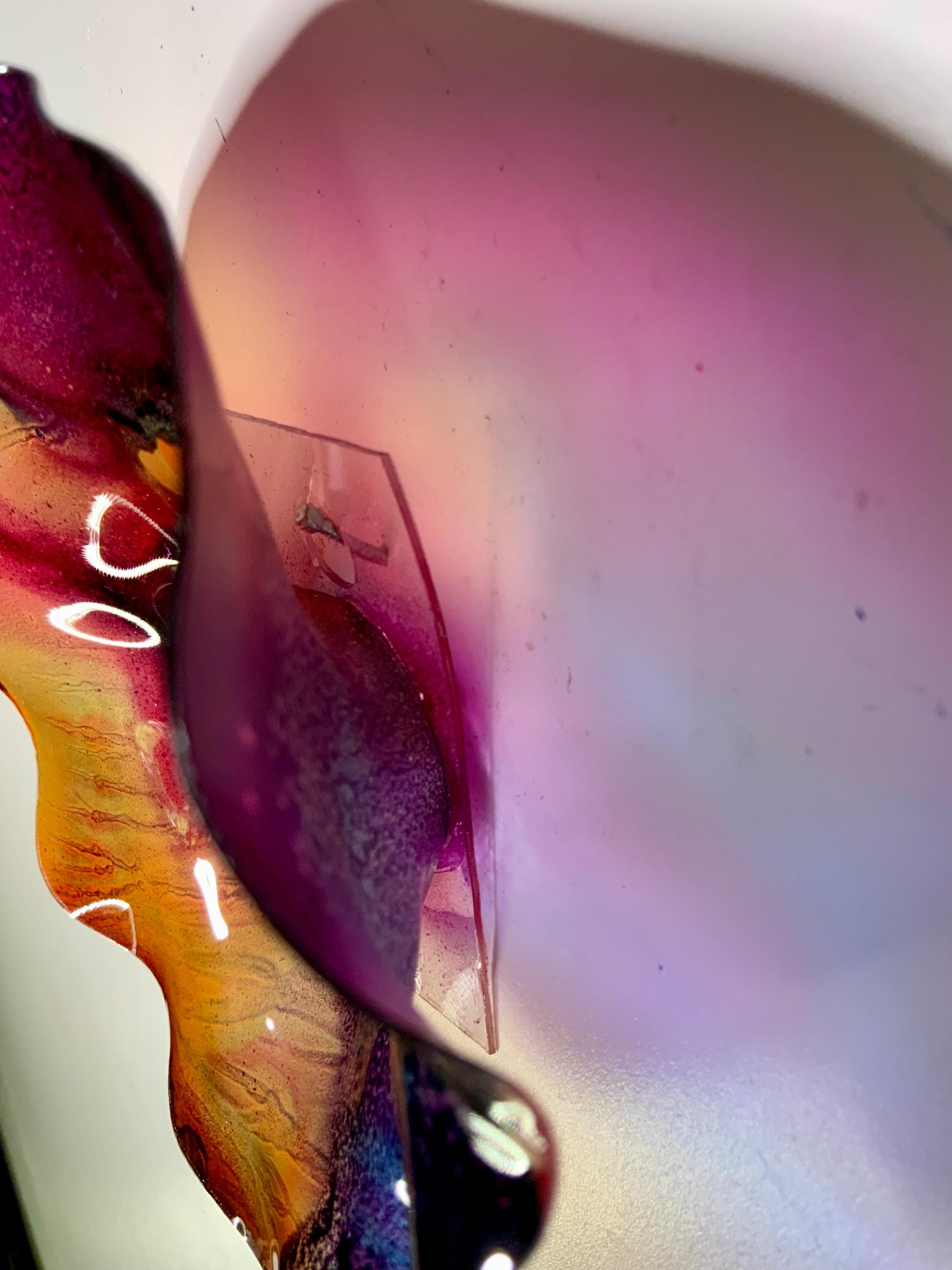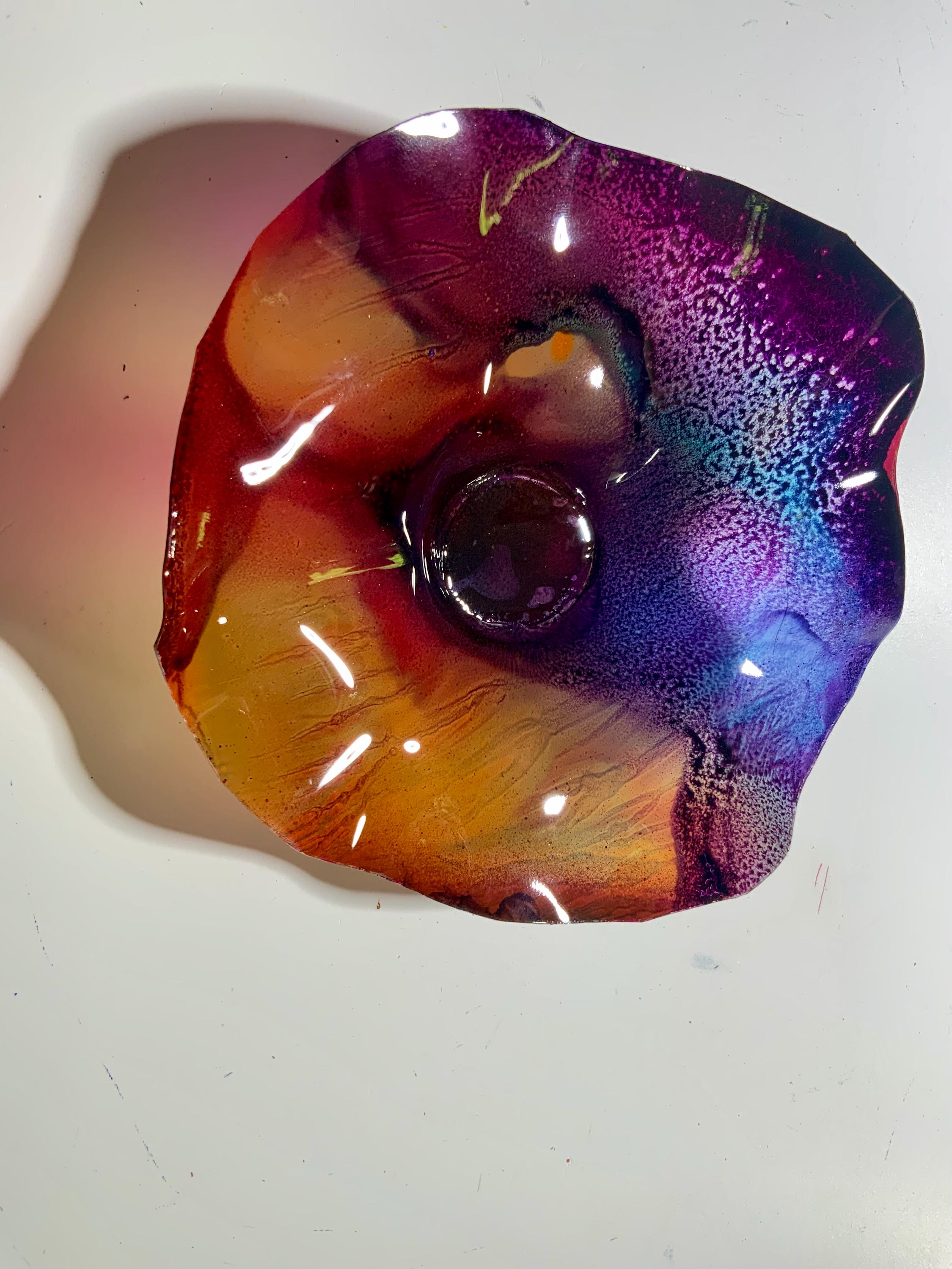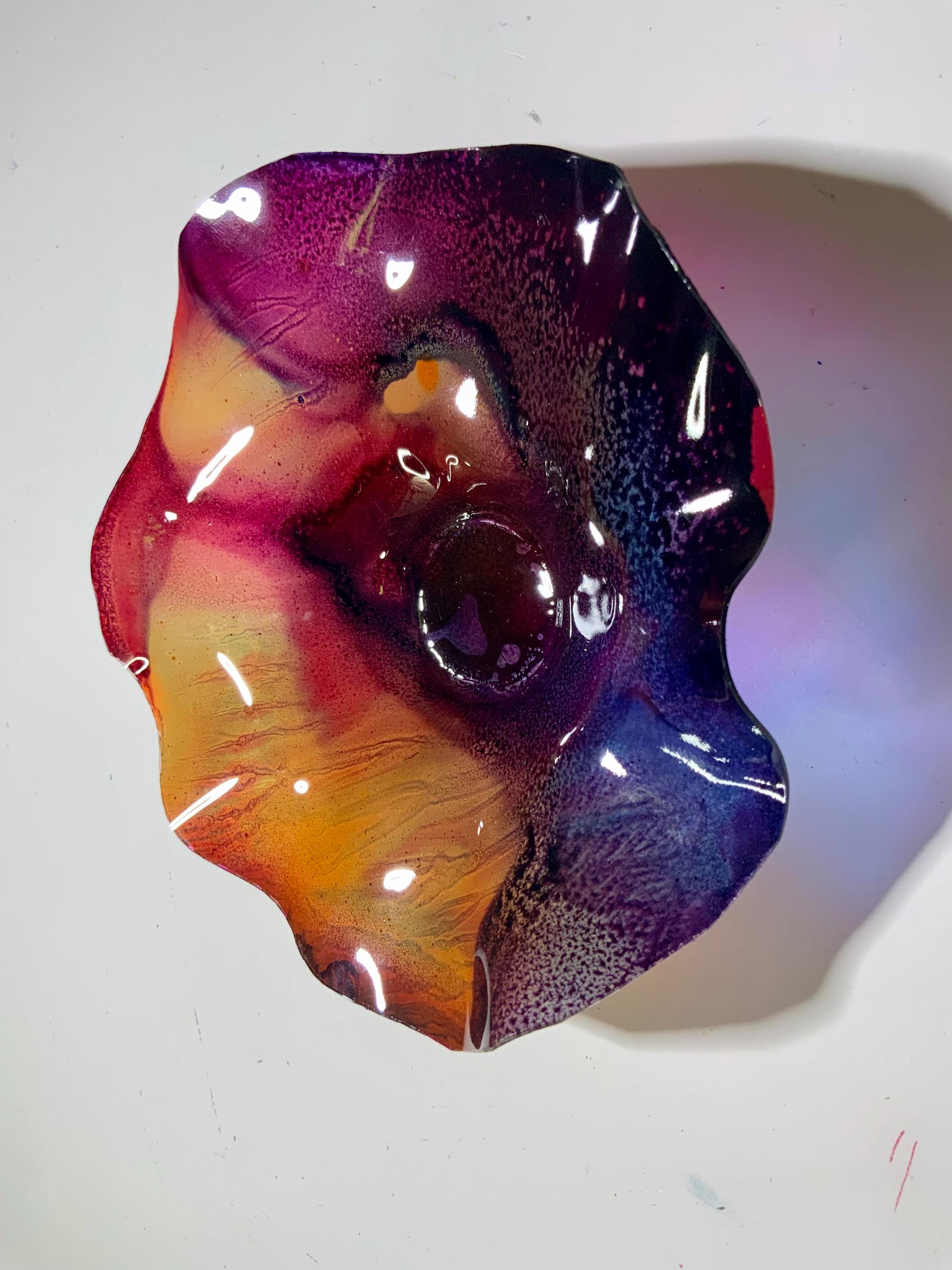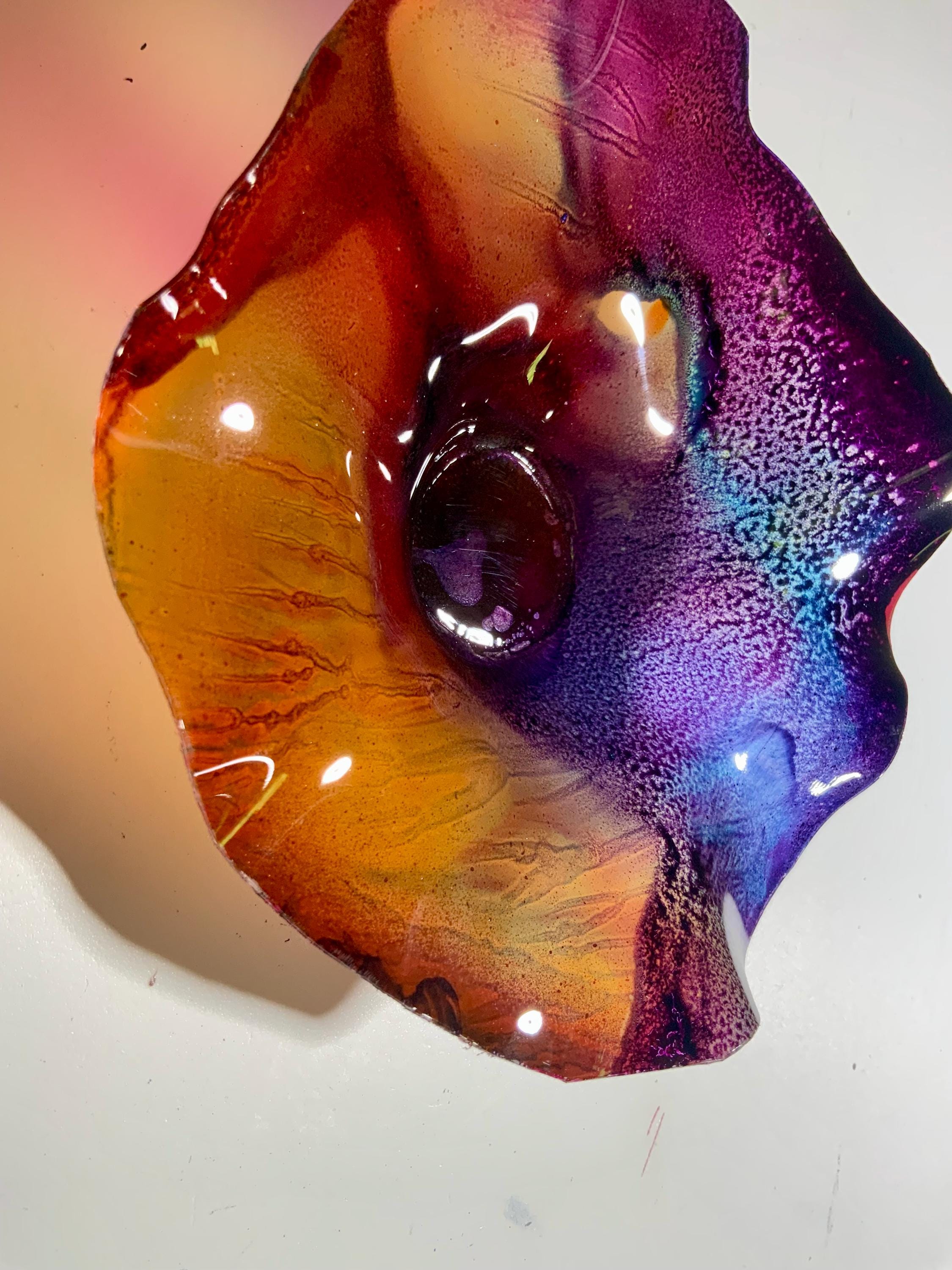 Radiant wall flower designer plate sculpture burgundy, purple, terracotta blend. The light filters through casting a colorful glow to the hanging surface.