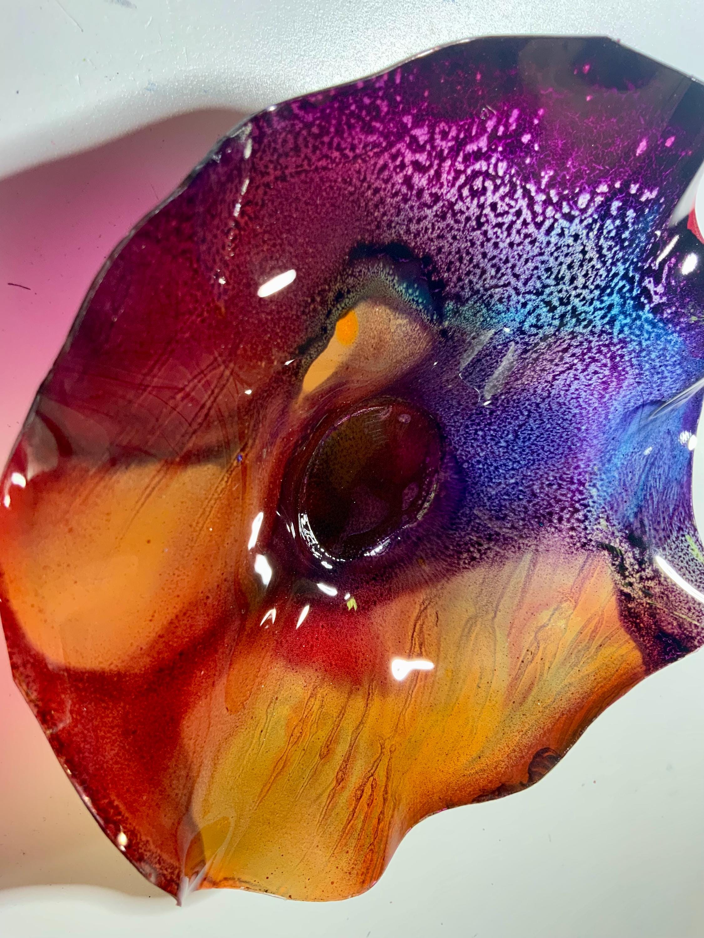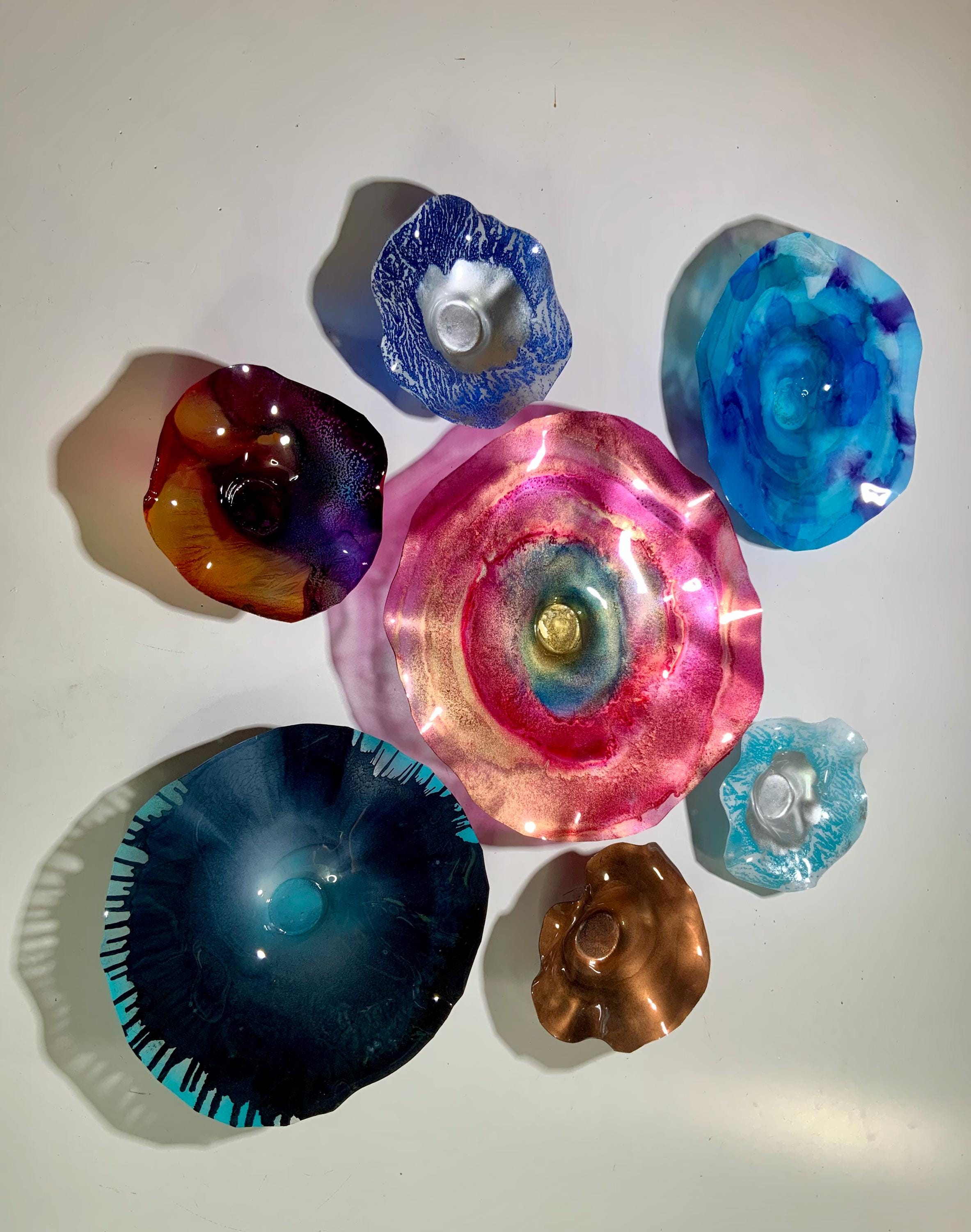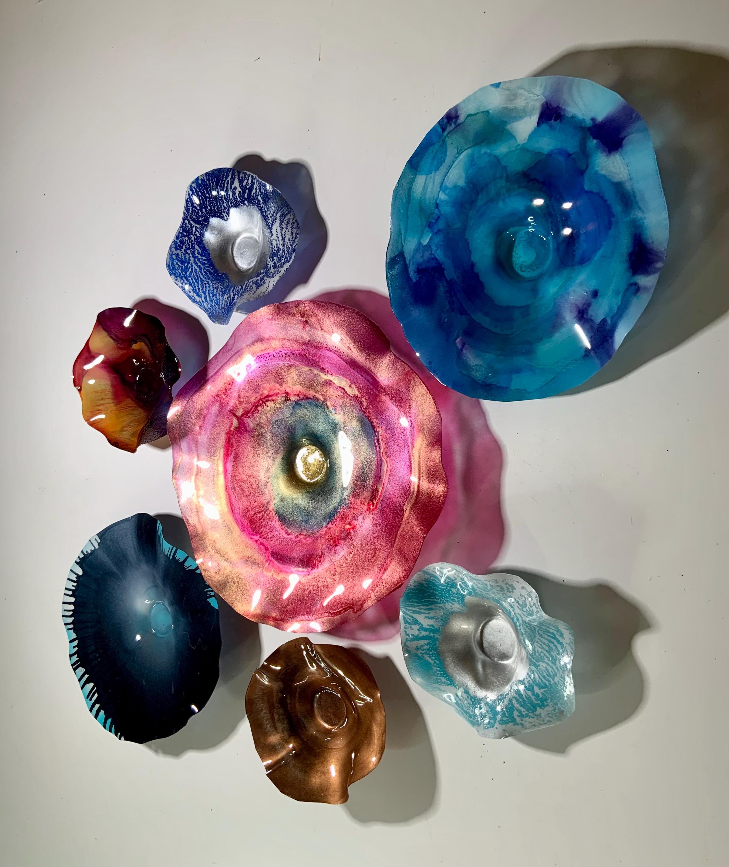 Each collectible piece is unique, no two are alike. This permanent, colorful, eye catching art looks and feels like glass. It shimmers in the light resembling water. They are very DURABLE AND LIGHTWEIGHT. These flowers are easy to hang ,are all weather and UV resistant. Great for indoor or outdoor decorating.