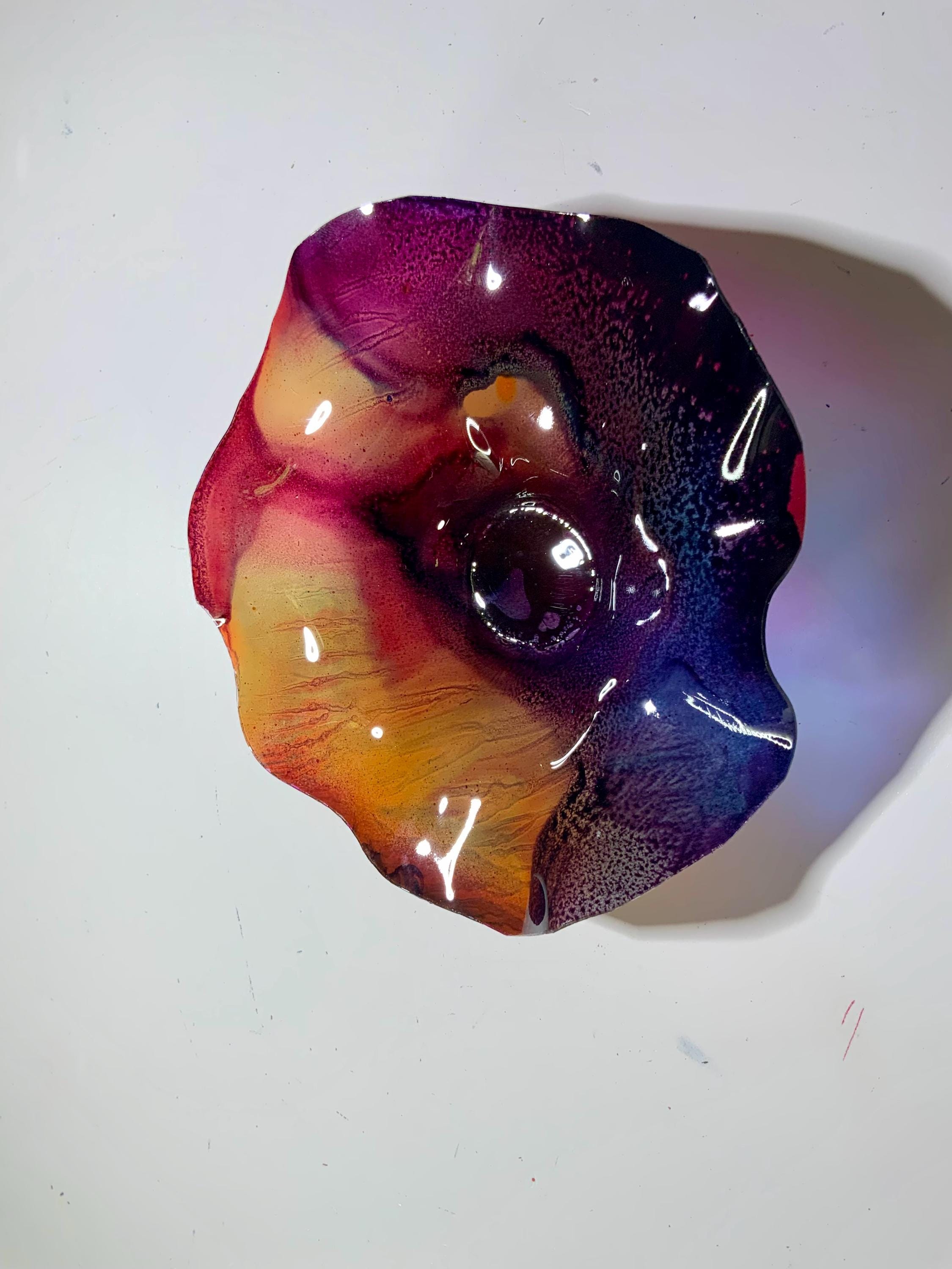 Extra Small wall flower 5” handmade recycled plastic/boho home burgundy/purple/terracotta indoor outdoor art/looks like glass/designer plate