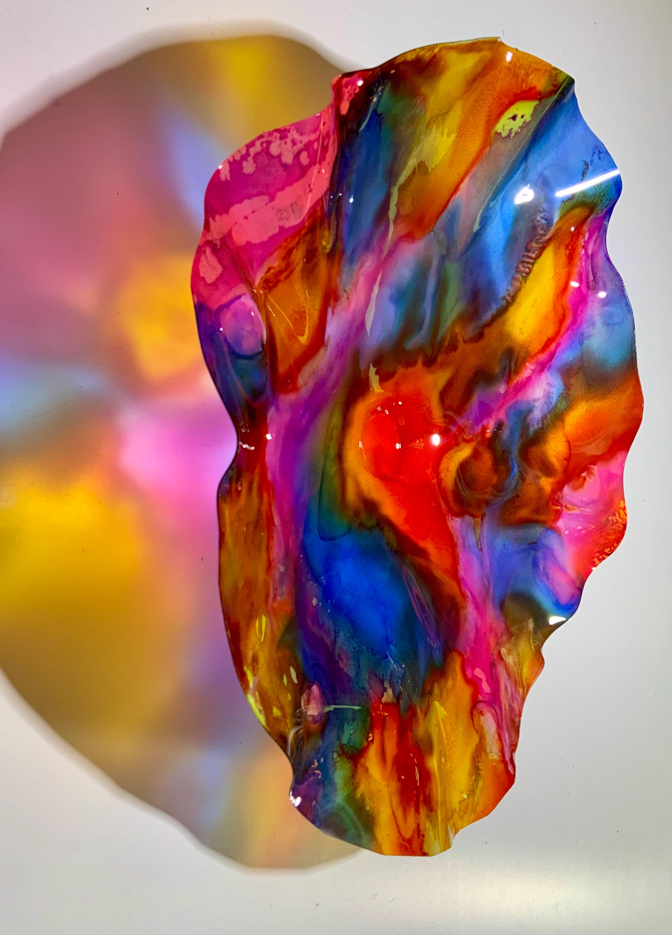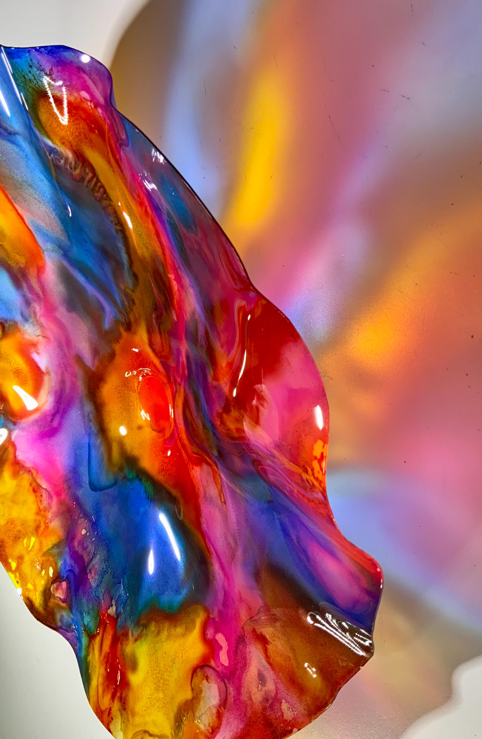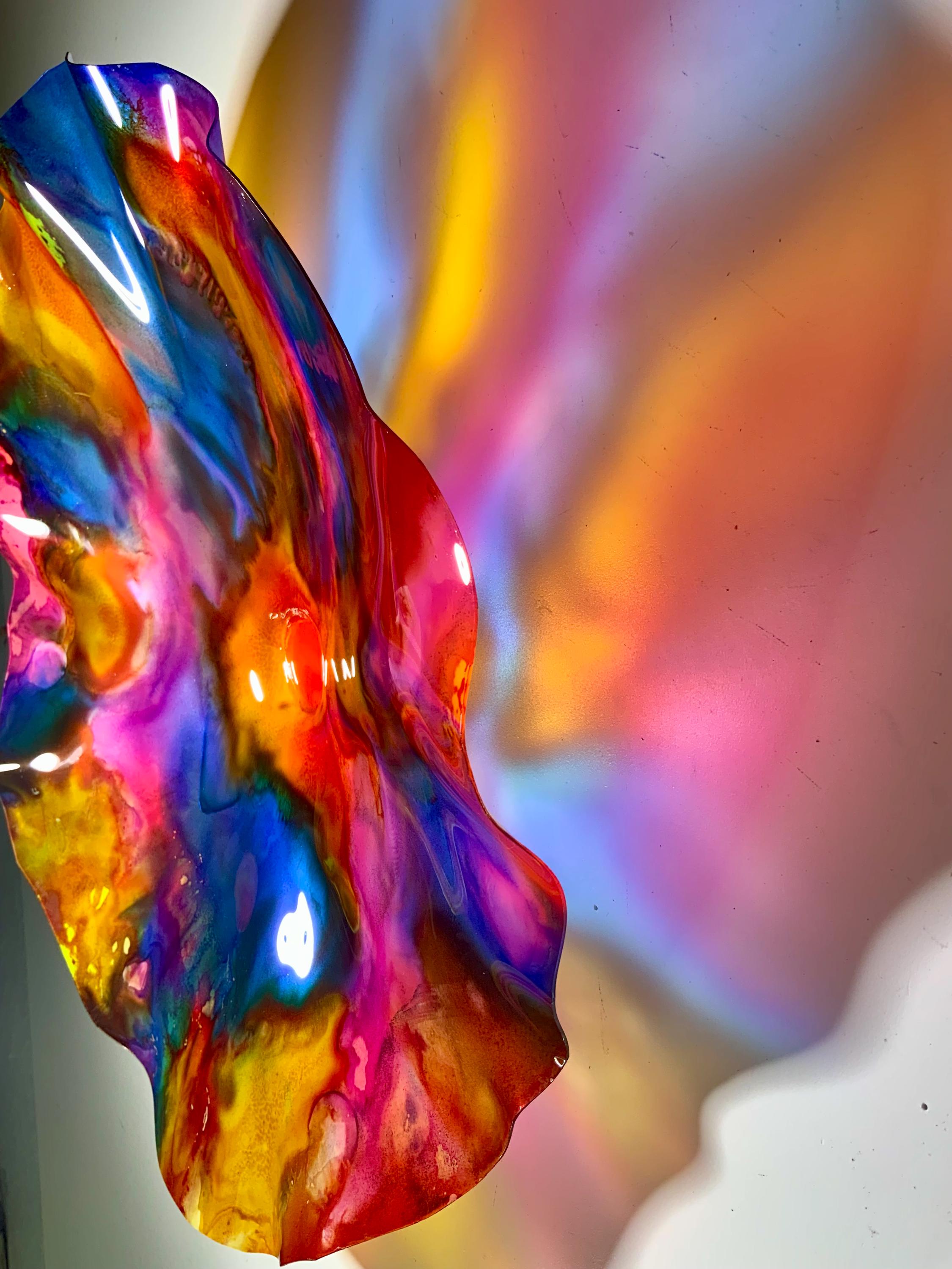 Stunningly beautiful rainbow of color. Blend of orange with blue, yellow, pink, red and green wall flower sculpture. This eye popper will add light and joy to any space. The light passes thru casting colorful effects on the hanging surface.
