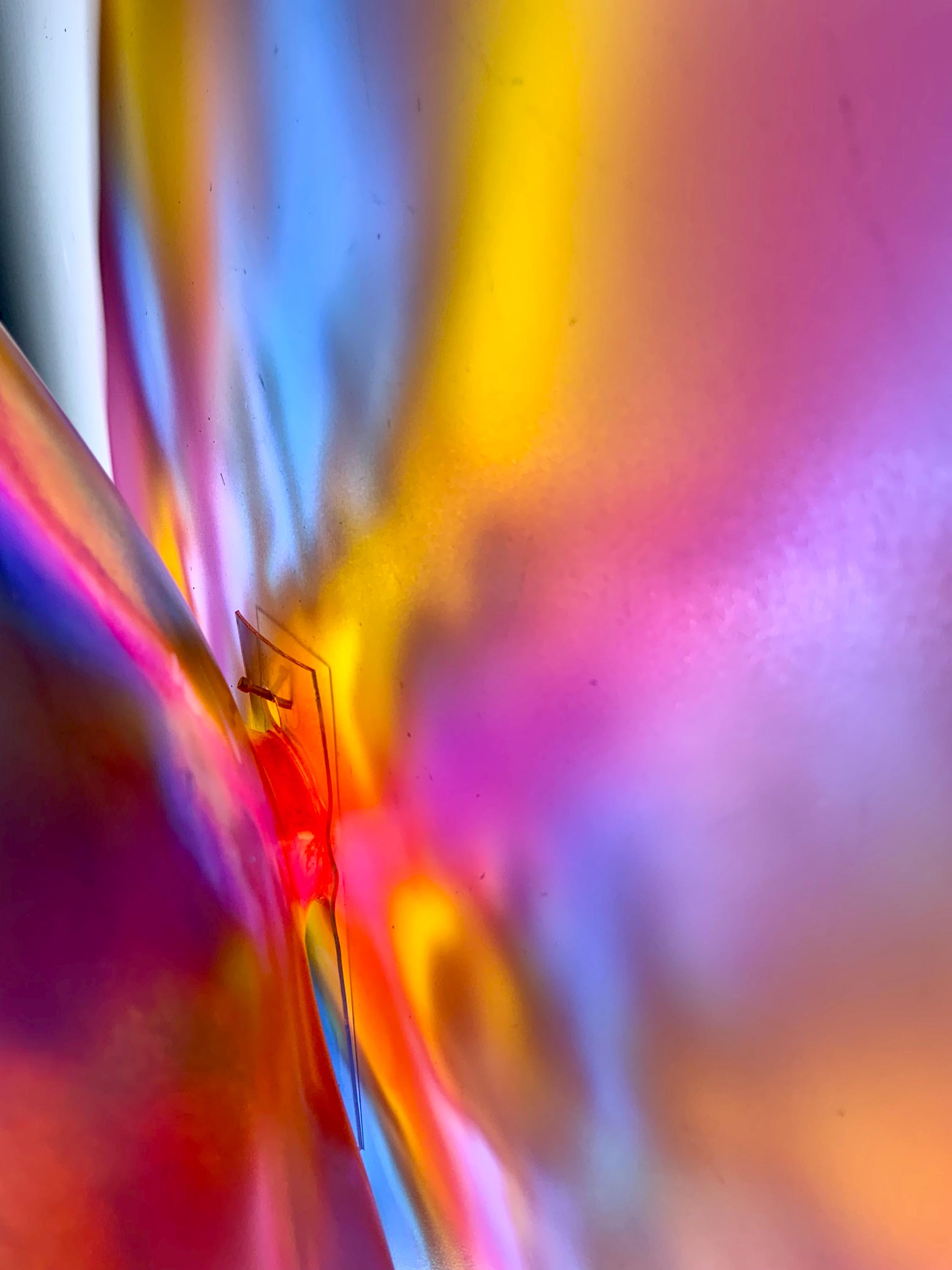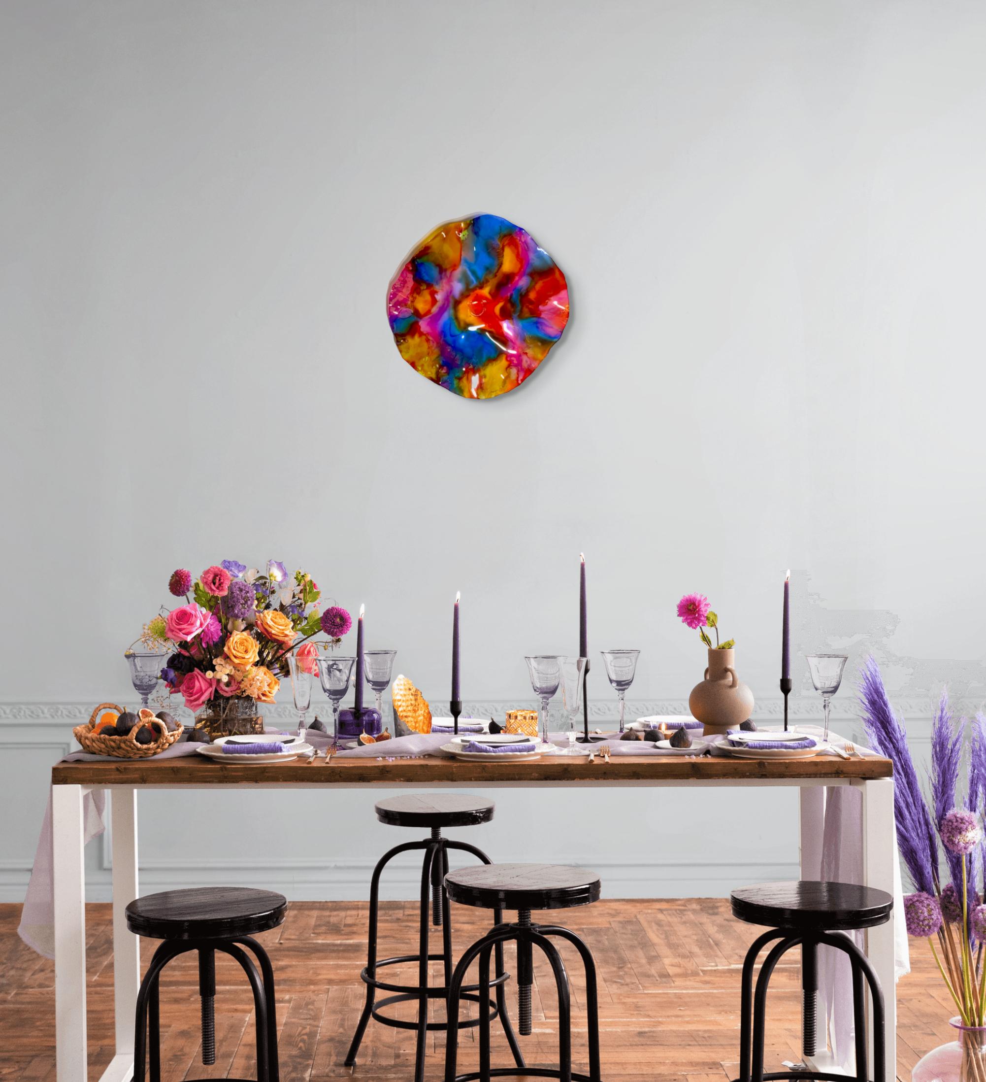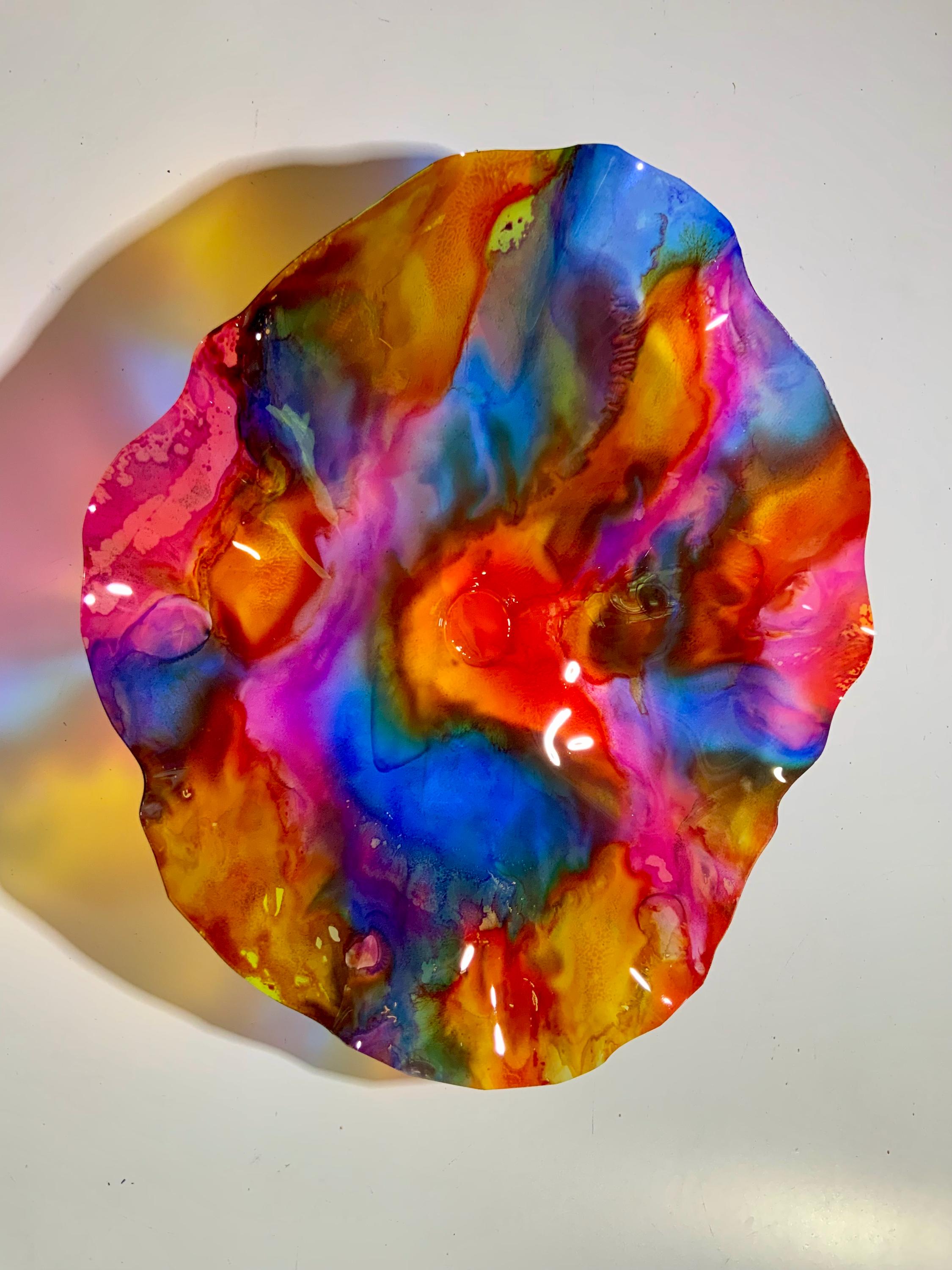 Stunningly beautiful rainbow of color. Blend of orange with blue, yellow, pink, red and green wall flower sculpture. This eye popper will add light and joy to any space. The light passes thru casting colorful effects on the hanging surface.