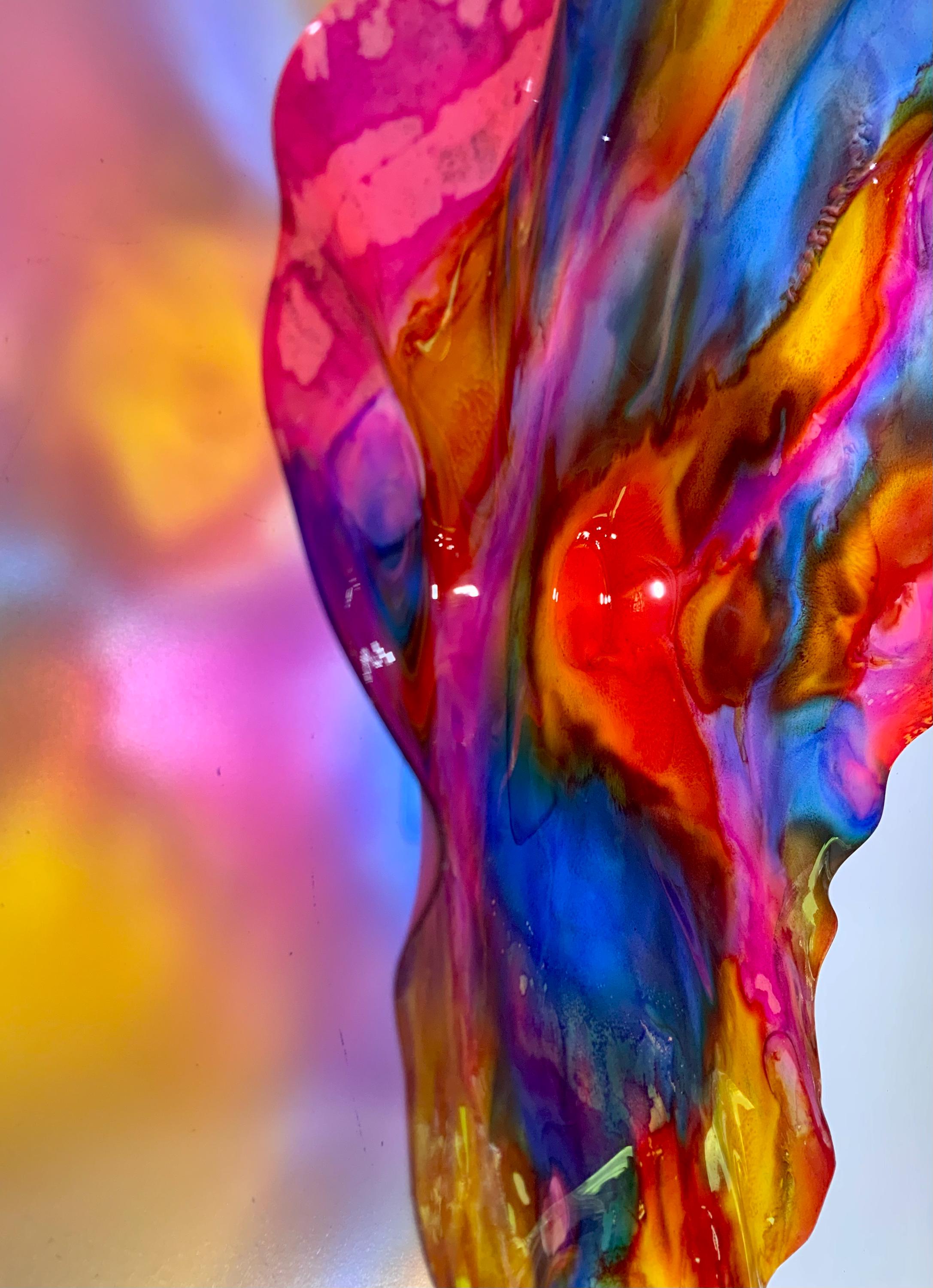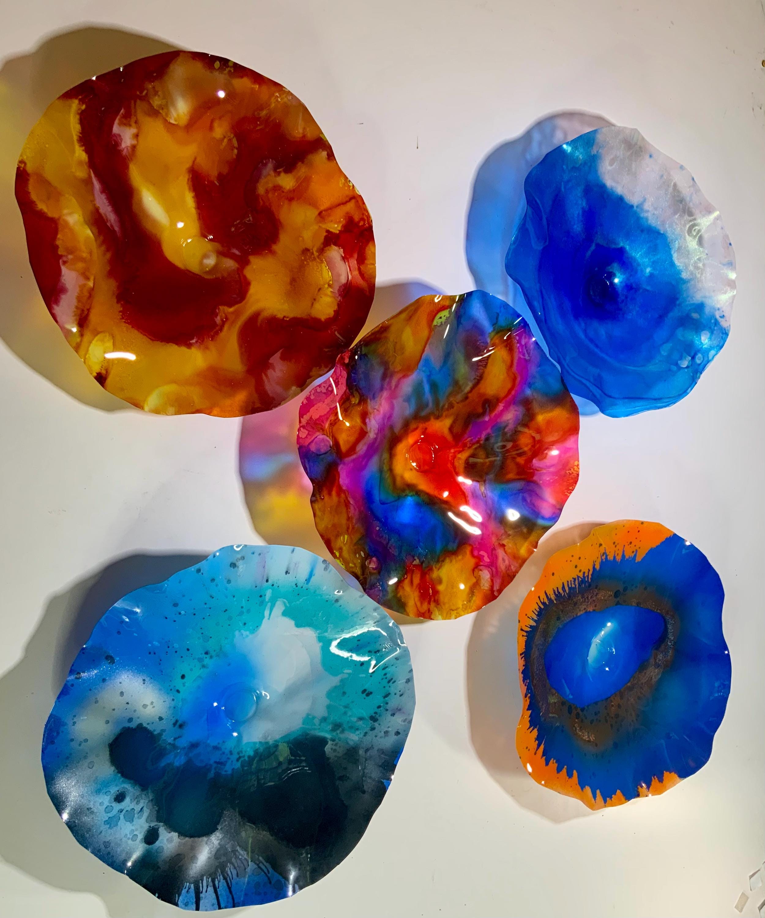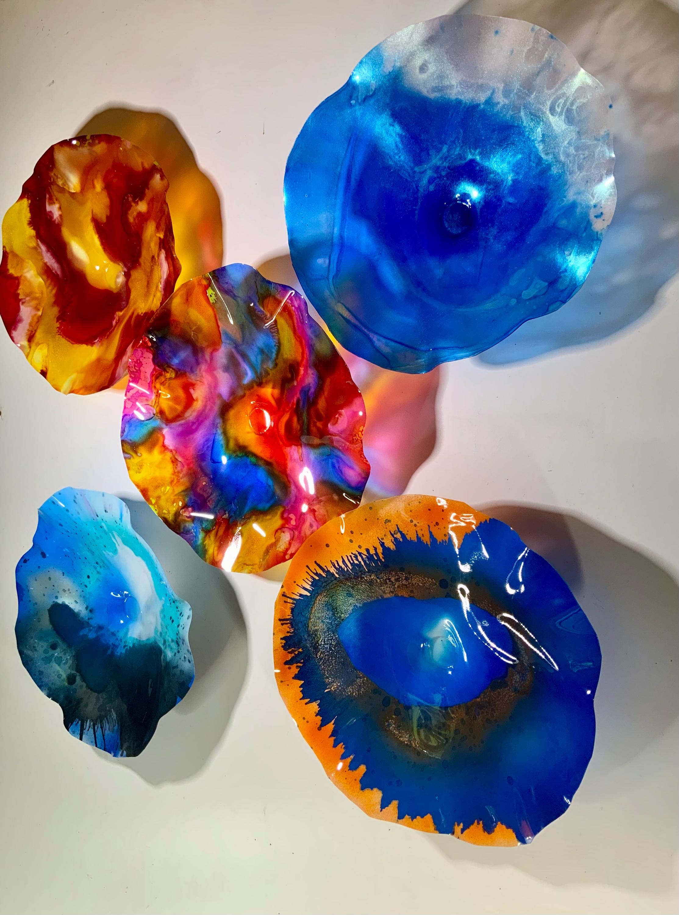 Each collectible piece is unique, no two are alike. This permanent, colorful, eye catching art looks like glass. It shimmers in the light resembling water. They are very DURABLE AND LIGHTWEIGHT. These flowers are easy to hang, are all weather and UV resistant.. Great for indoor or outdoor decorating.