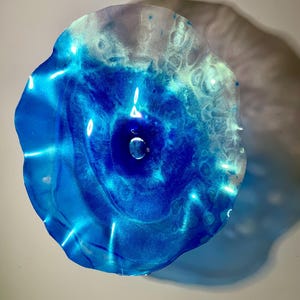Each collectible piece is unique, no two are alike. This permanent, colorful, eye catching art looks like glass. It shimmers in the light resembling water. They are very DURABLE AND LIGHTWEIGHT. These flowers are easy to hang, all weather , and will not fade in the sun. Great for indoor or outdoor decorating.