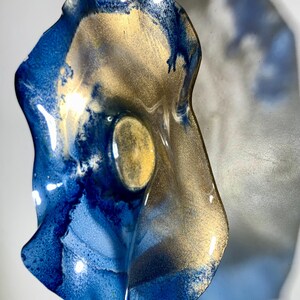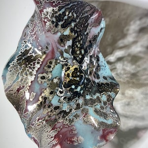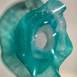 Each collectible piece is unique, no two are alike. This permanent, colorful, eye catching art looks and feels like glass. It shimmers in the light resembling water. They are very DURABLE AND LIGHTWEIGHT. These flowers are easy to hang ,are all weather and UV resistant. Great for indoor or outdoor decorating.