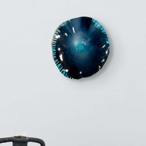 Recycled plastic coastal home small wall flower handmade sculpture 9” metallic teal/blue looks like glass/round art/beachy bedroom decor art