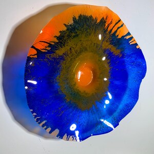Each collectible piece is unique, no two are alike. This permanent, colorful, eye catching art looks and feels like glass. It shimmers in the light resembling water. They are very DURABLE, AND LIGHTWEIGHT. These flowers are easy to hang, all weather and UV resistant. Great for indoor or outdoor decorating.