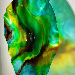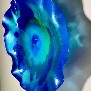 Each collectible piece is unique, no two are alike. This permanent, colorful, eye catching art looks like glass. It shimmers in the light resembling water. They are very DURABLE AND LIGHTWEIGHT. These flowers are easy to hang, are all weather and UV resistant.. Great for indoor or outdoor decorating.