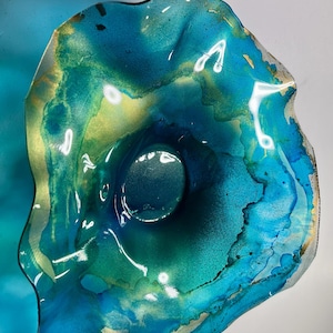 Each collectible piece is unique, no two are alike. This permanent, colorful, eye catching art looks and feels like glass. It shimmers in the light resembling water. They are very DURABLE AND LIGHTWEIGHT. These flowers are easy to hang, are all weather and UV resistant. Great for indoor or outdoor decorating.