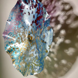 Each collectible piece is unique, no two are alike. This permanent, colorful, eye catching art looks like glass. It shimmers in the light resembling water. They are very DURABLE AND LIGHTWEIGHT. Great for indoor or outdoor decorating.