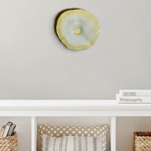 Handmade recycled plastic home decor Small Wall flower 9” aqua green;orange;gold funky wall hanging/looks like glass/Todd Lynd art