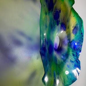 Each collectible piece is unique, no two are alike. This permanent, colorful, eye catching art looks and feels like glass. It shimmers in the light resembling water. They are very DURABLE AND LIGHTWEIGHT. This flower is easy to hang all weather and UV resistant. Great for indoor or outdoor decorating.