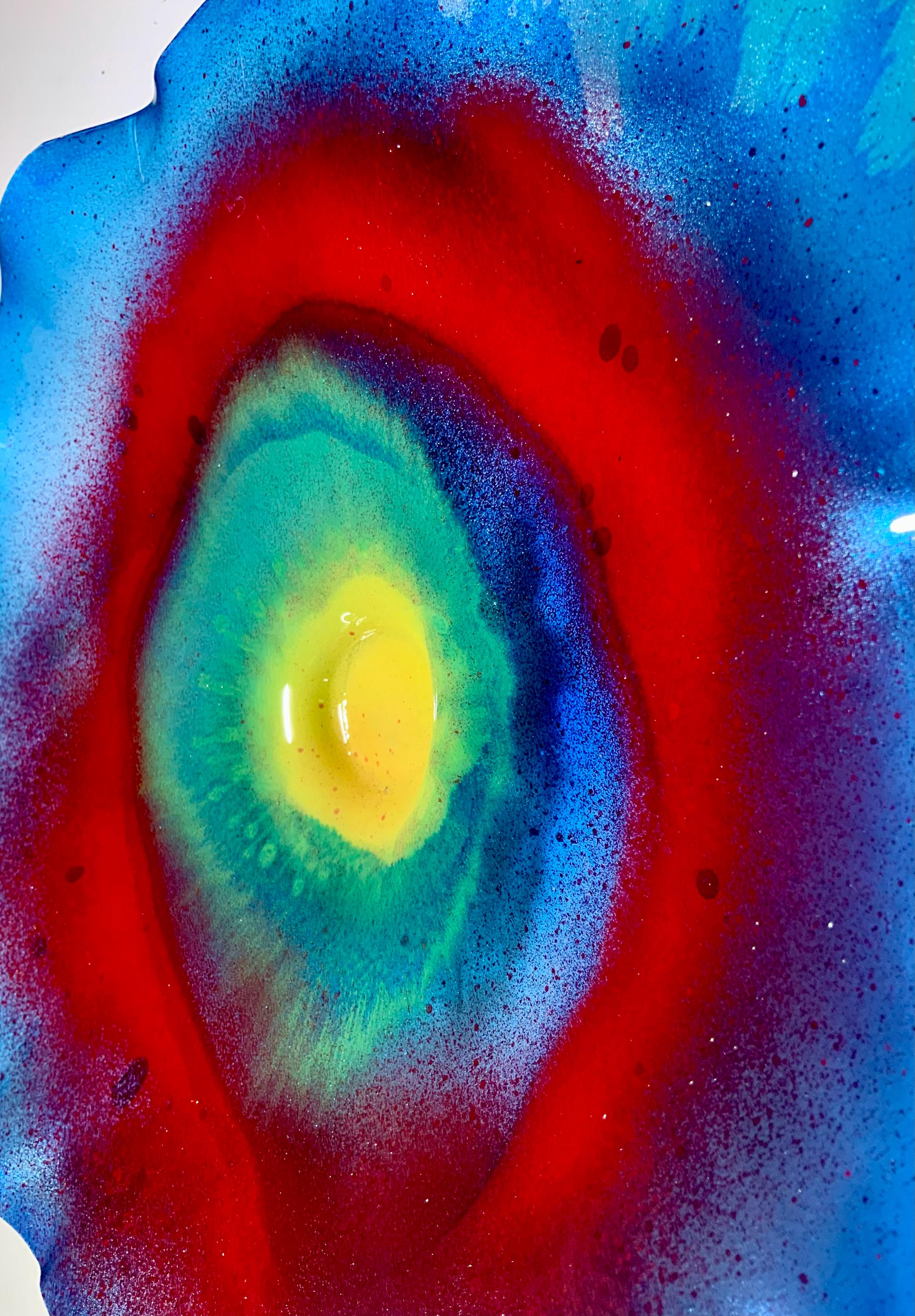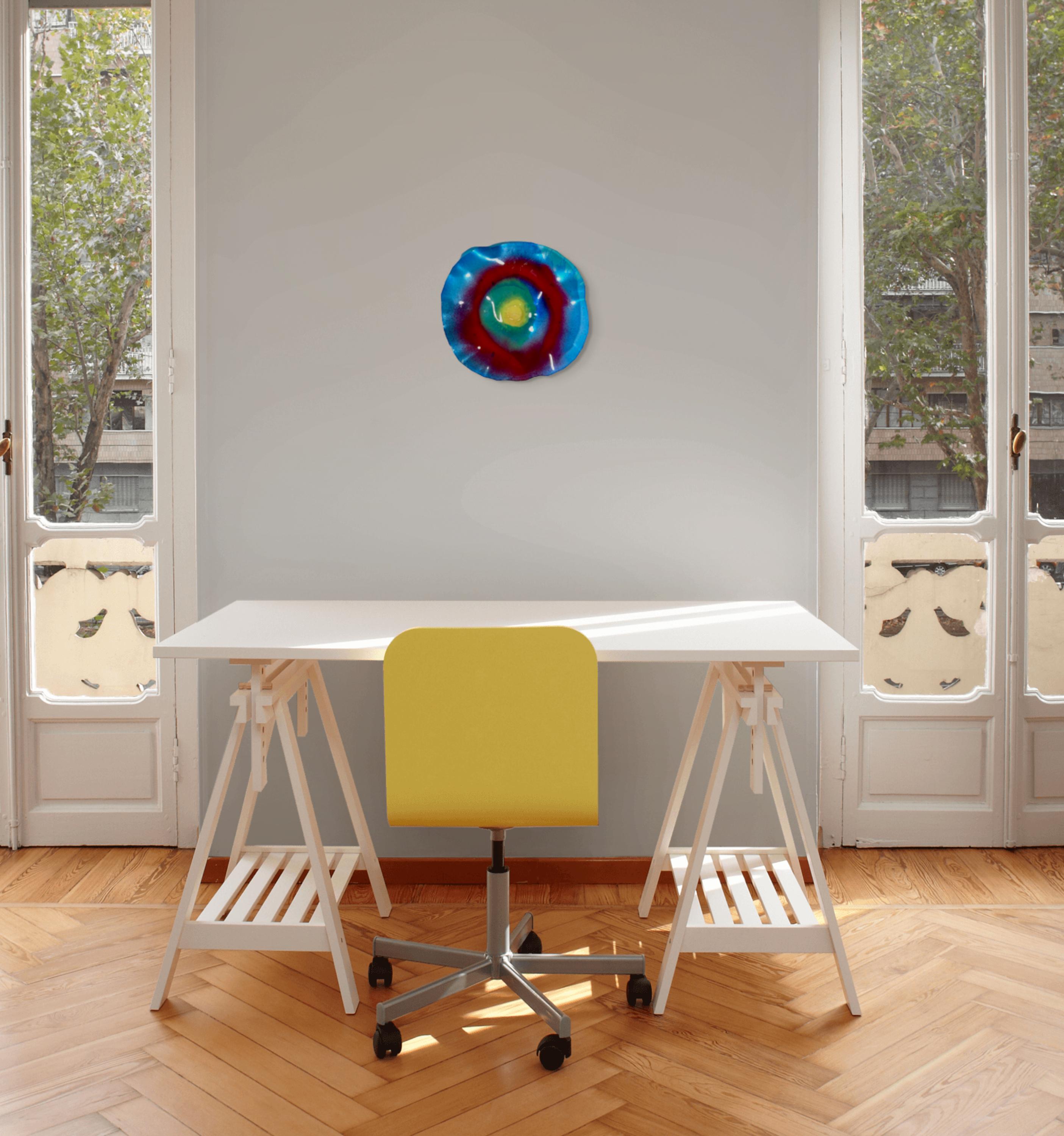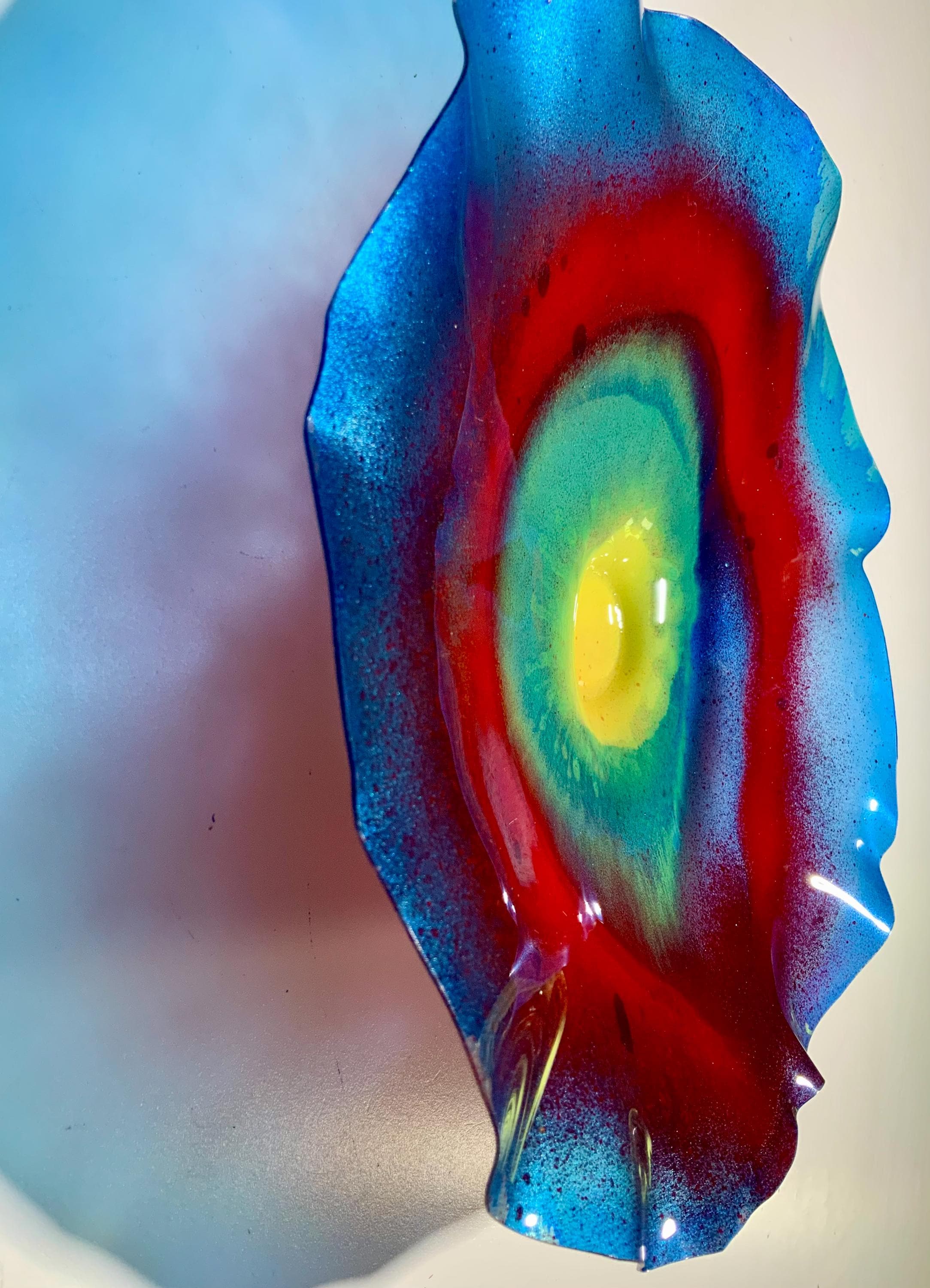 Wall flower colorful blue with red, green and a yellow center. The light filters through casting a colorful effect on the hanging surface.