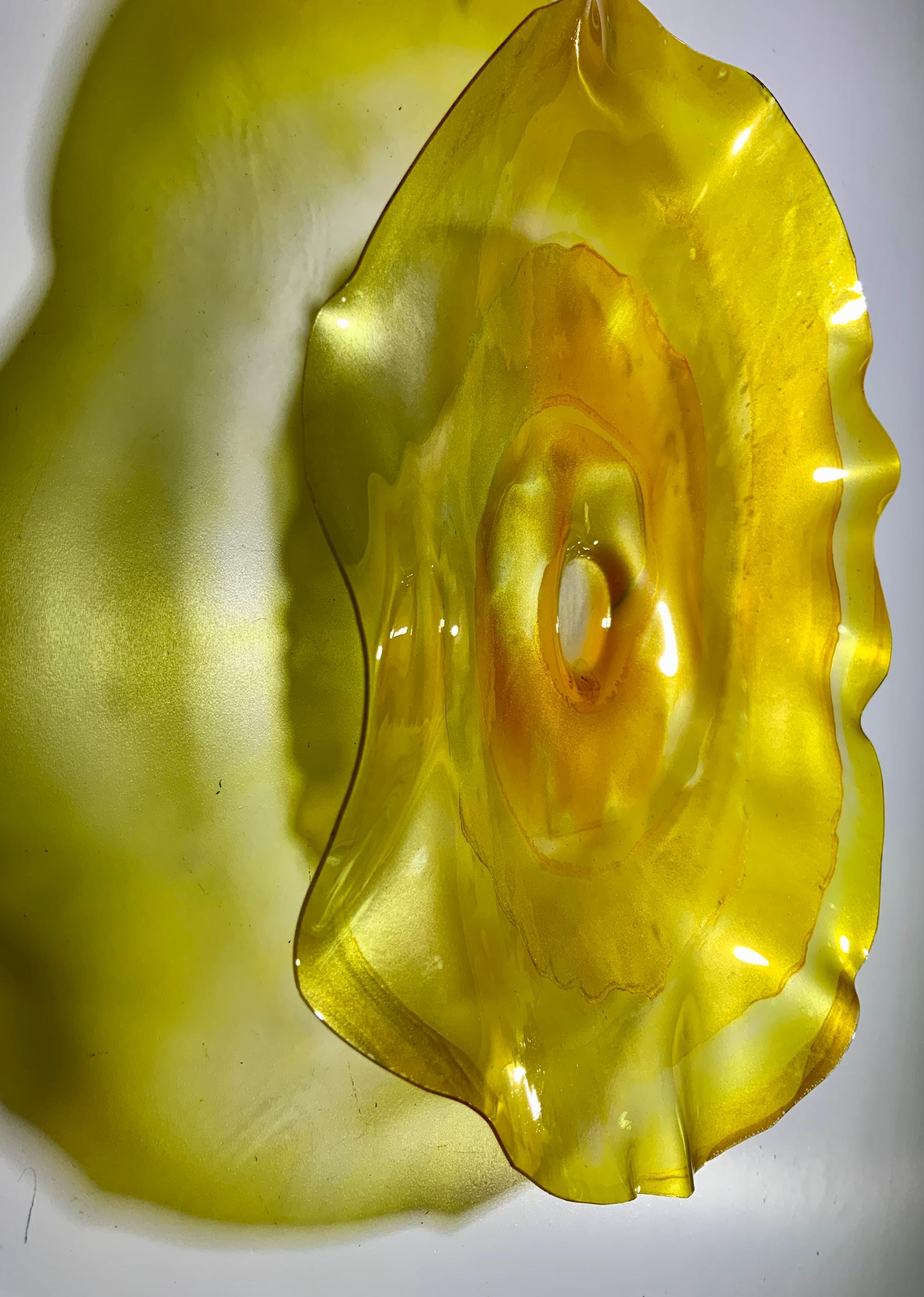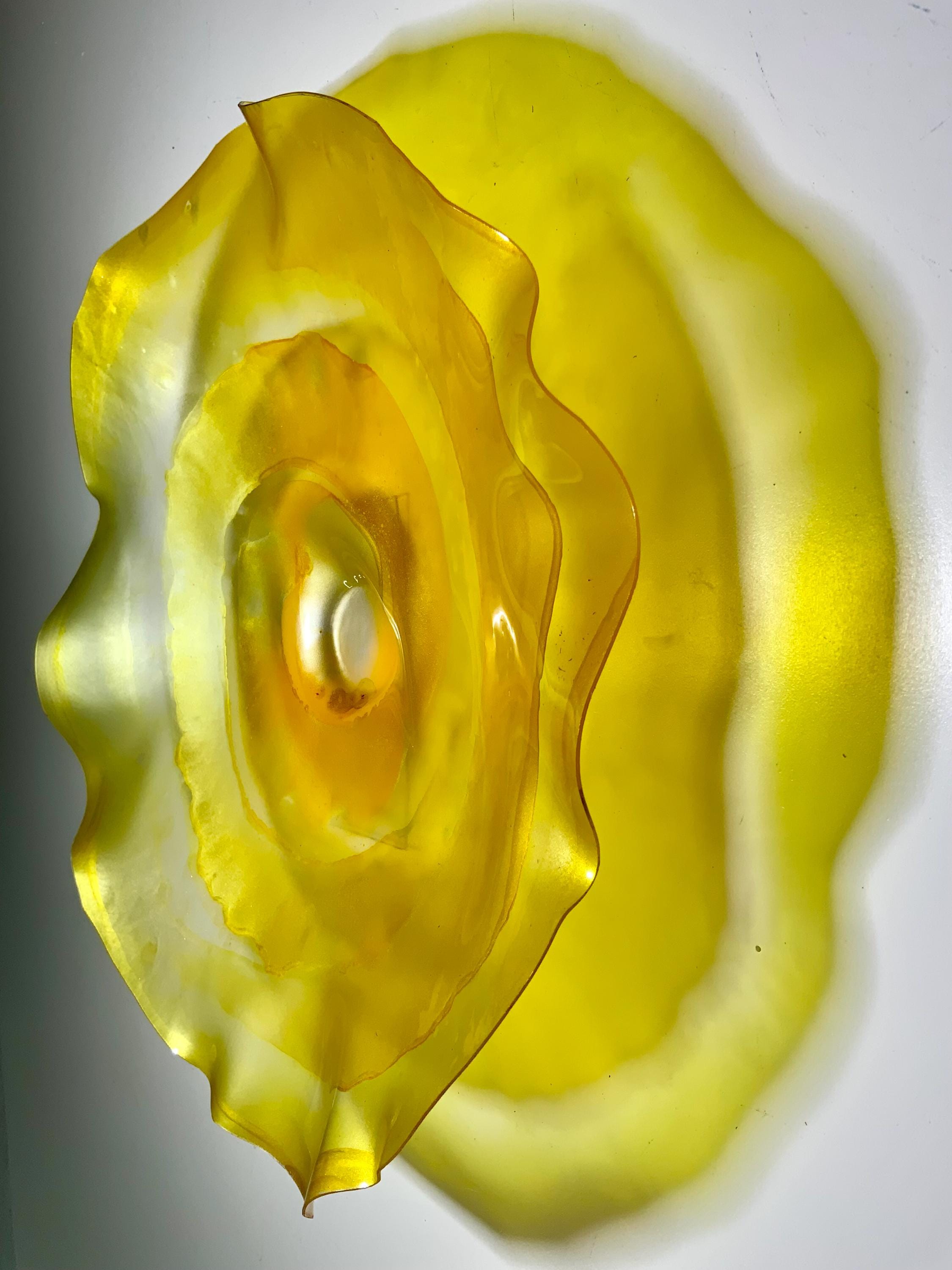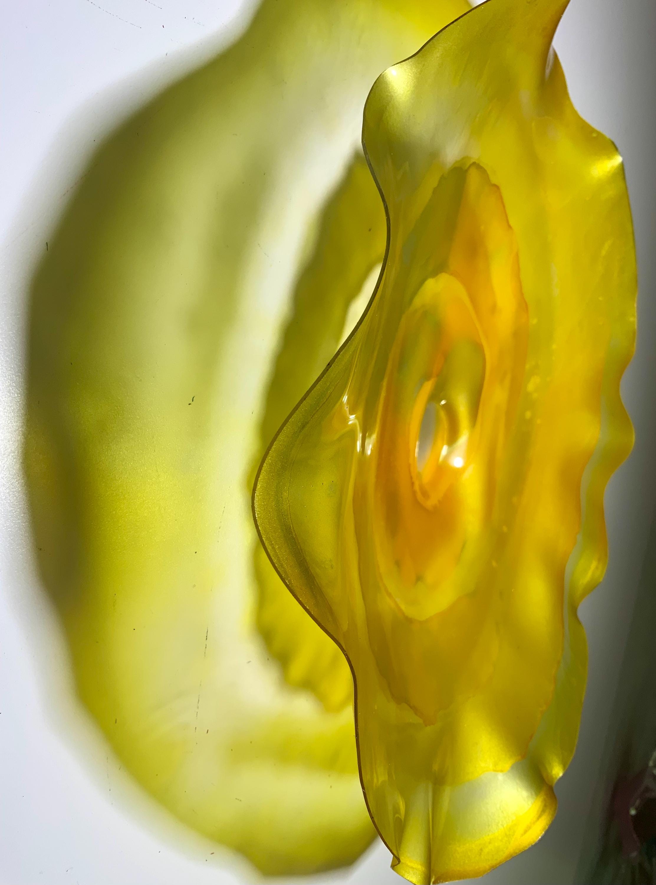 Wall flower stunning translucent golden yellow. The light filters through casting a colorful effect on the hanging surface.