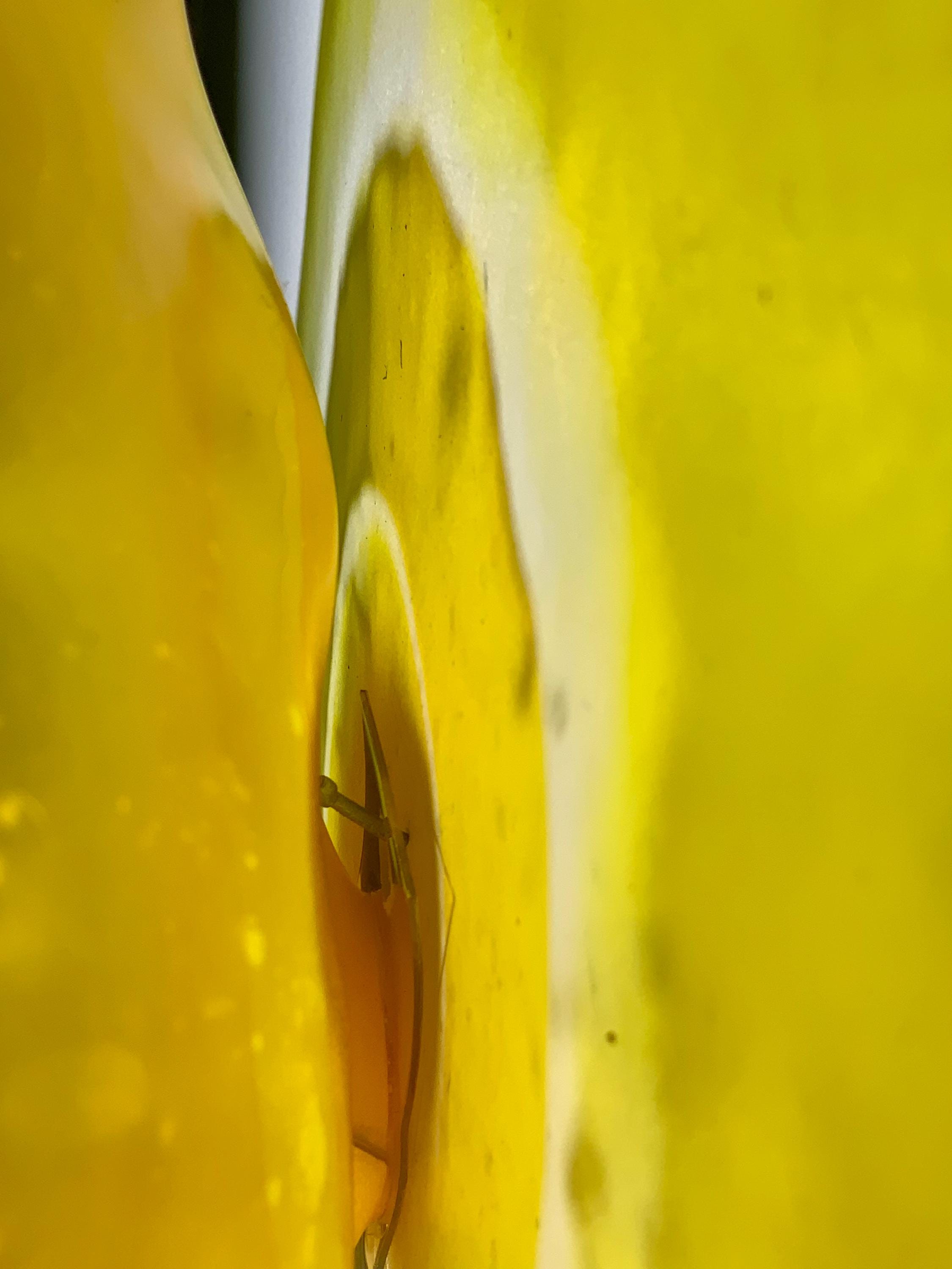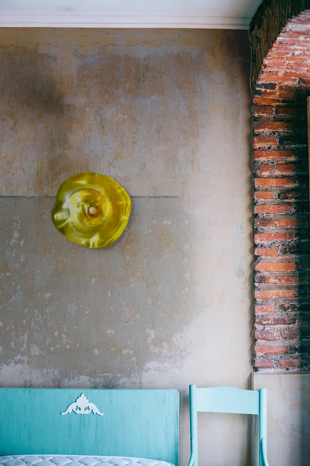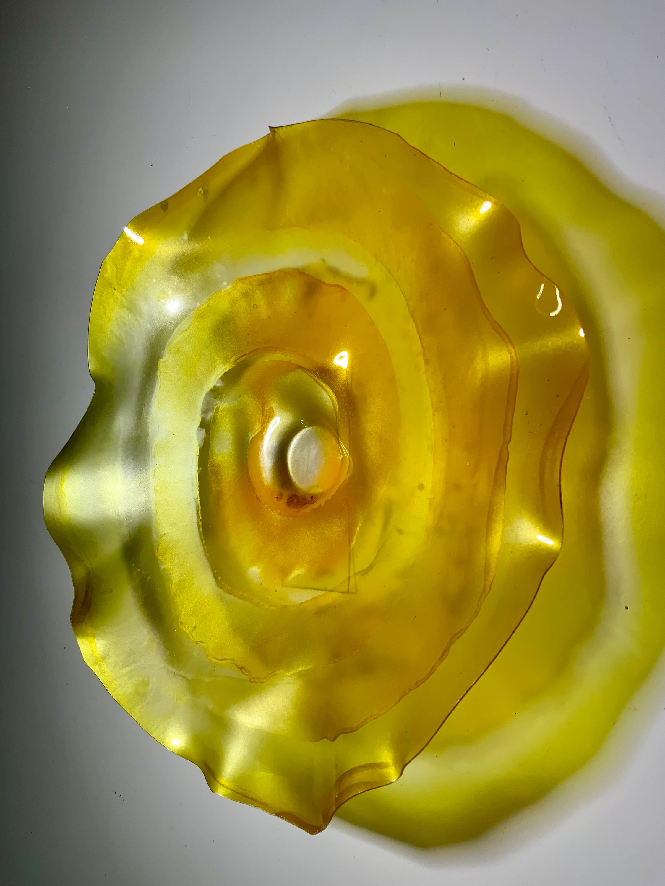 Wall flower stunning translucent golden yellow. The light filters through casting a colorful effect on the hanging surface.