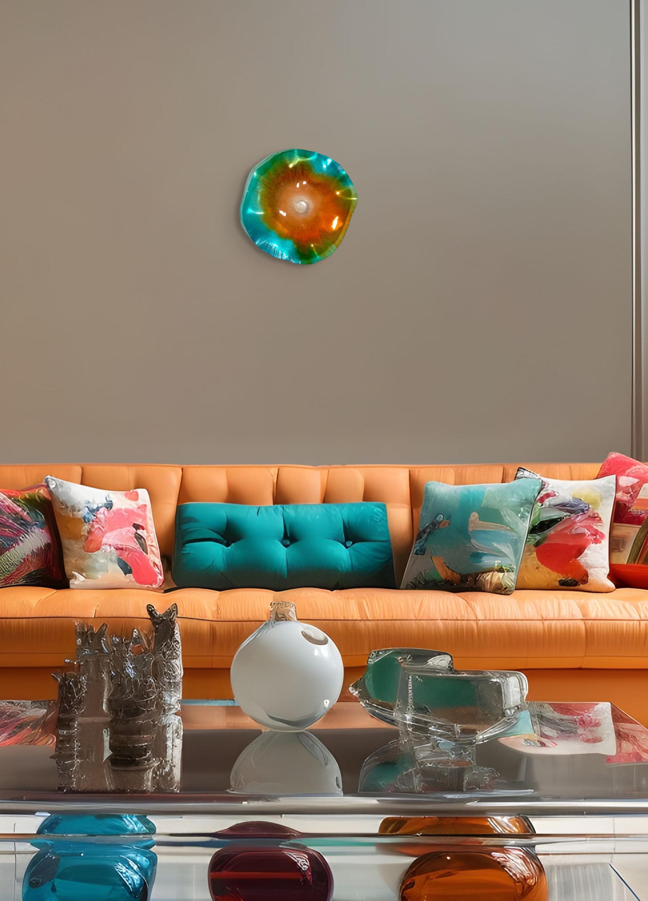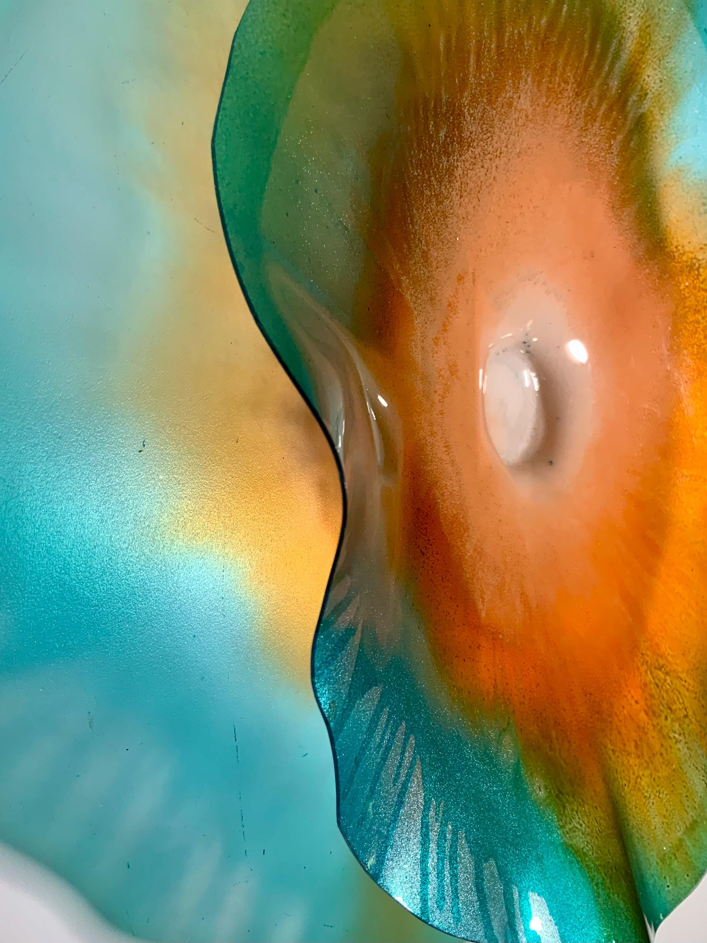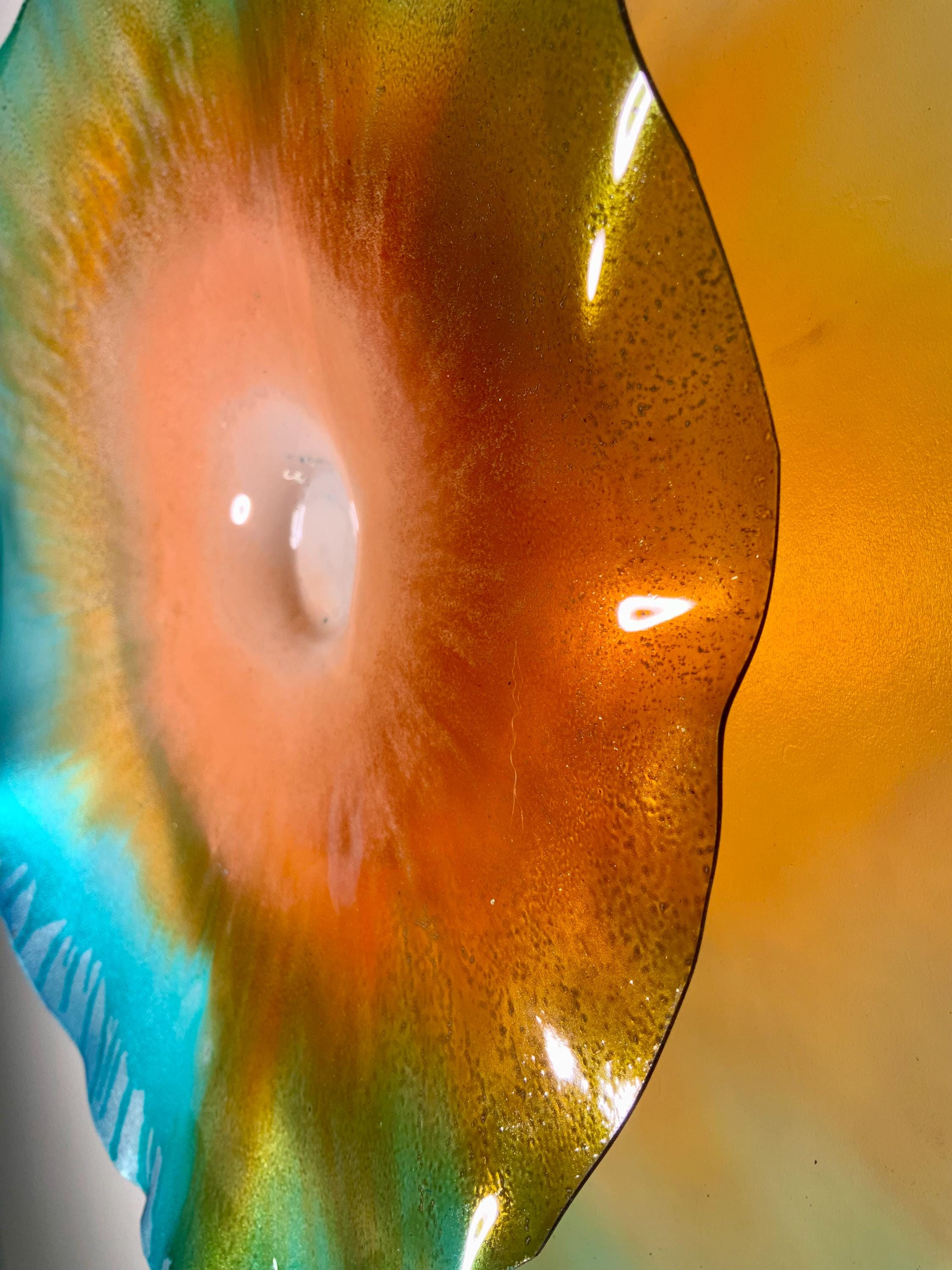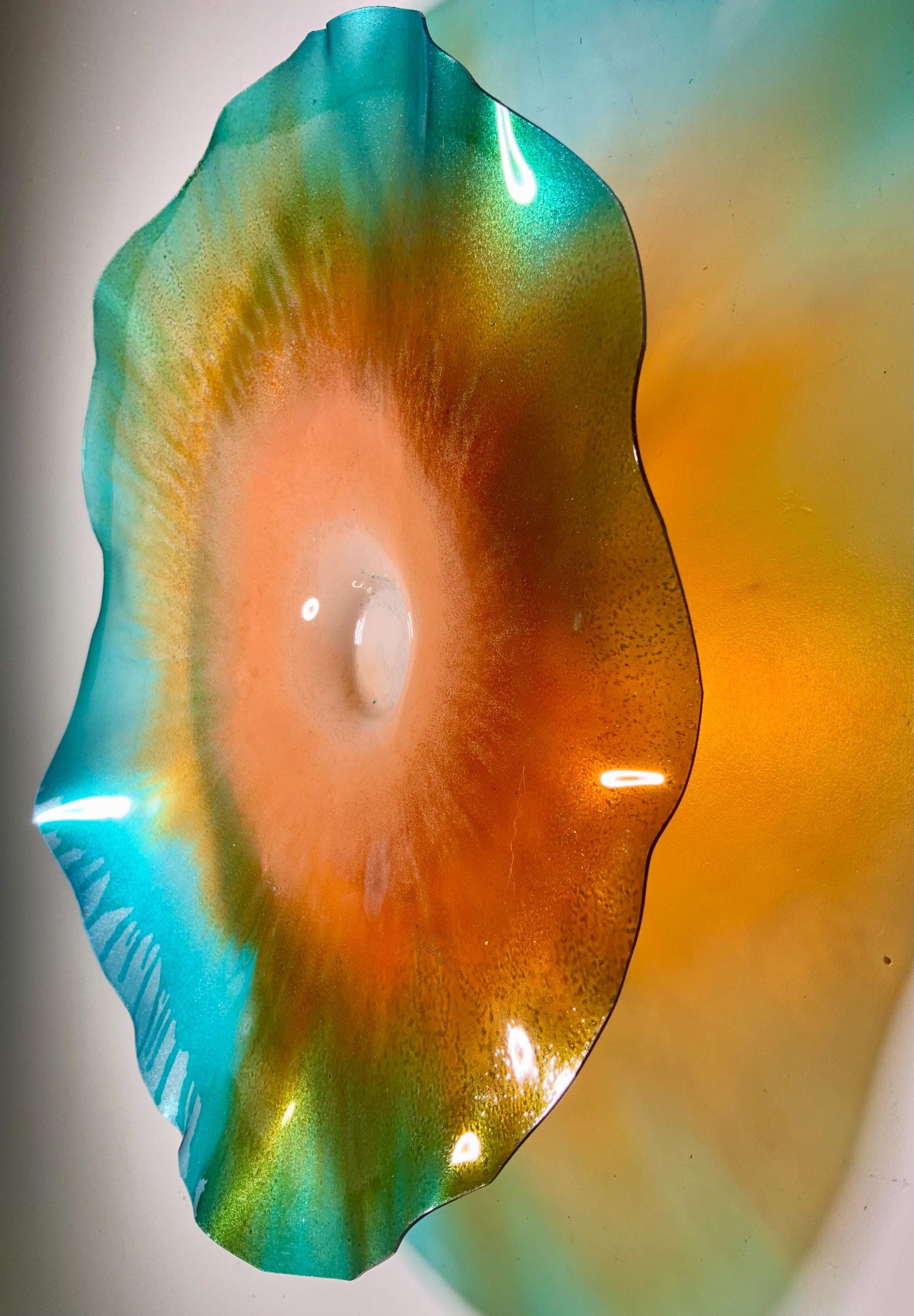 Colorful flower home wall hanging sculpture medium 13” orange/aqua handmade eco-friendly plastic/looks like glass/gift/living room decor