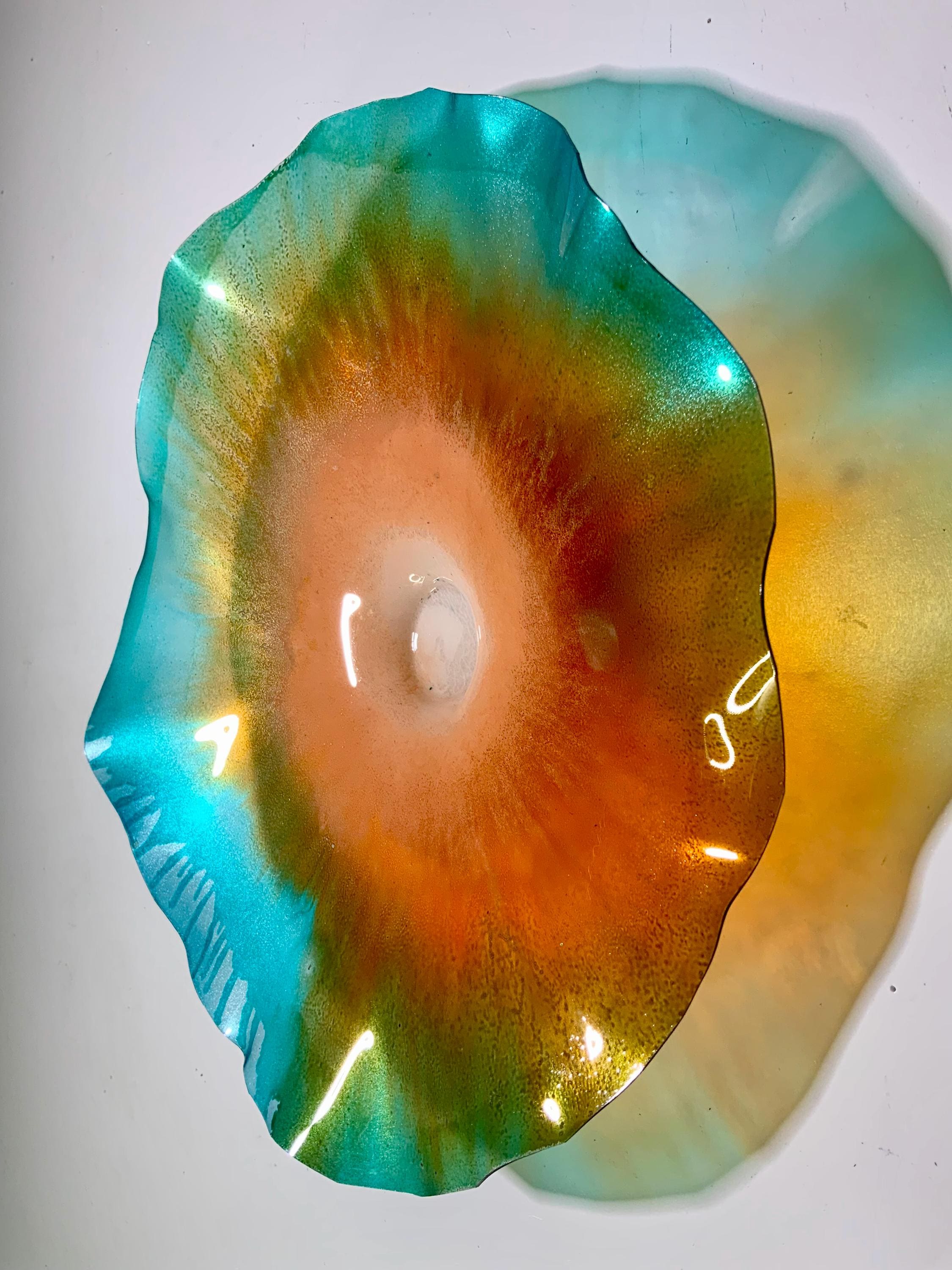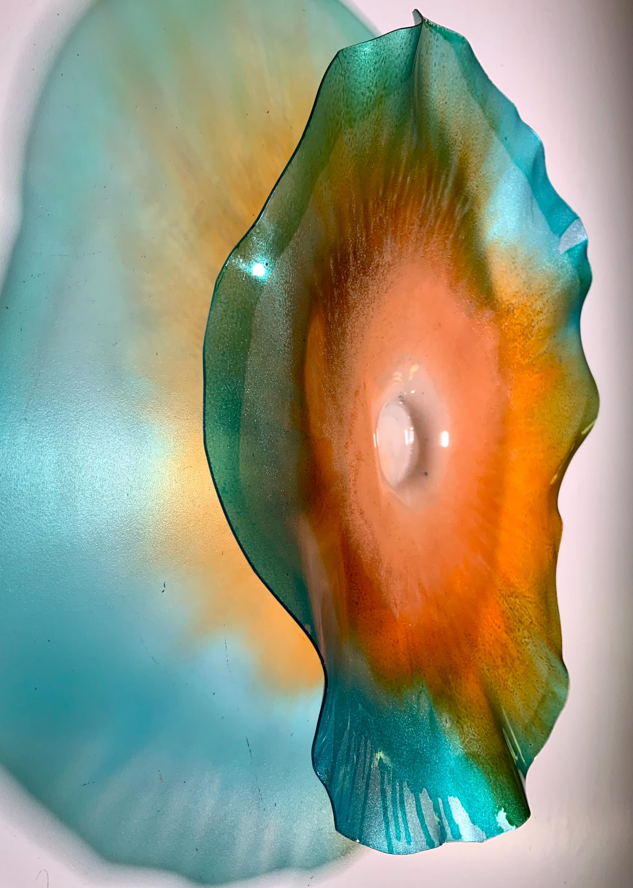Each collectible piece is unique, no two are alike. This permanent, colorful, eye catching art looks and feels like glass. It shimmers in the light resembling water. They are very DURABLE AND LIGHTWEIGHT. This flower is easy to hang all weather and UV resistant. Great for indoor or outdoor decorating.
