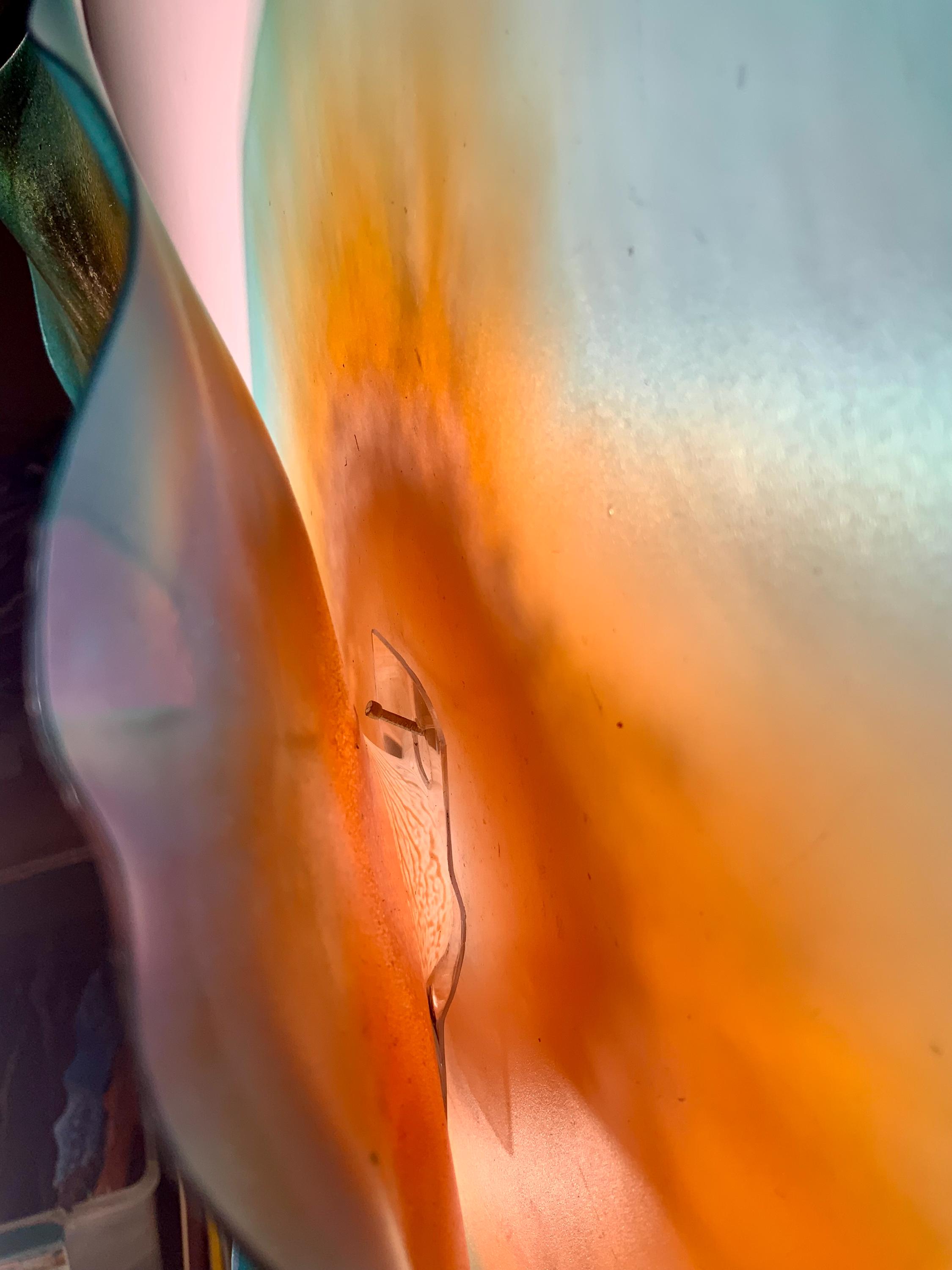 Radiant wall flower vibrant and colorful magnificent aqua blue with orange blend. The light filters through casting a colorful glow to the hanging surface.