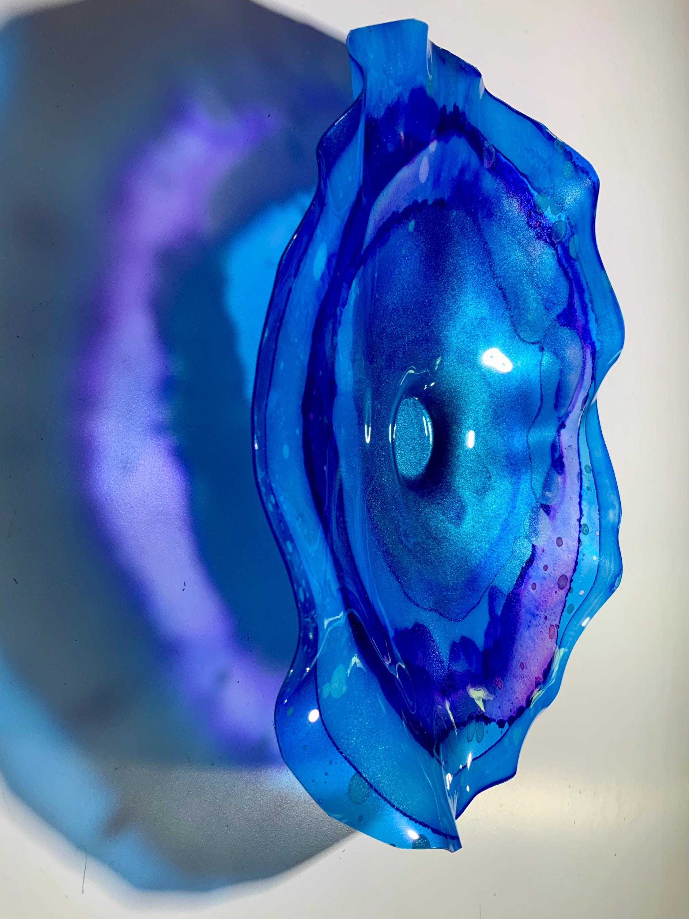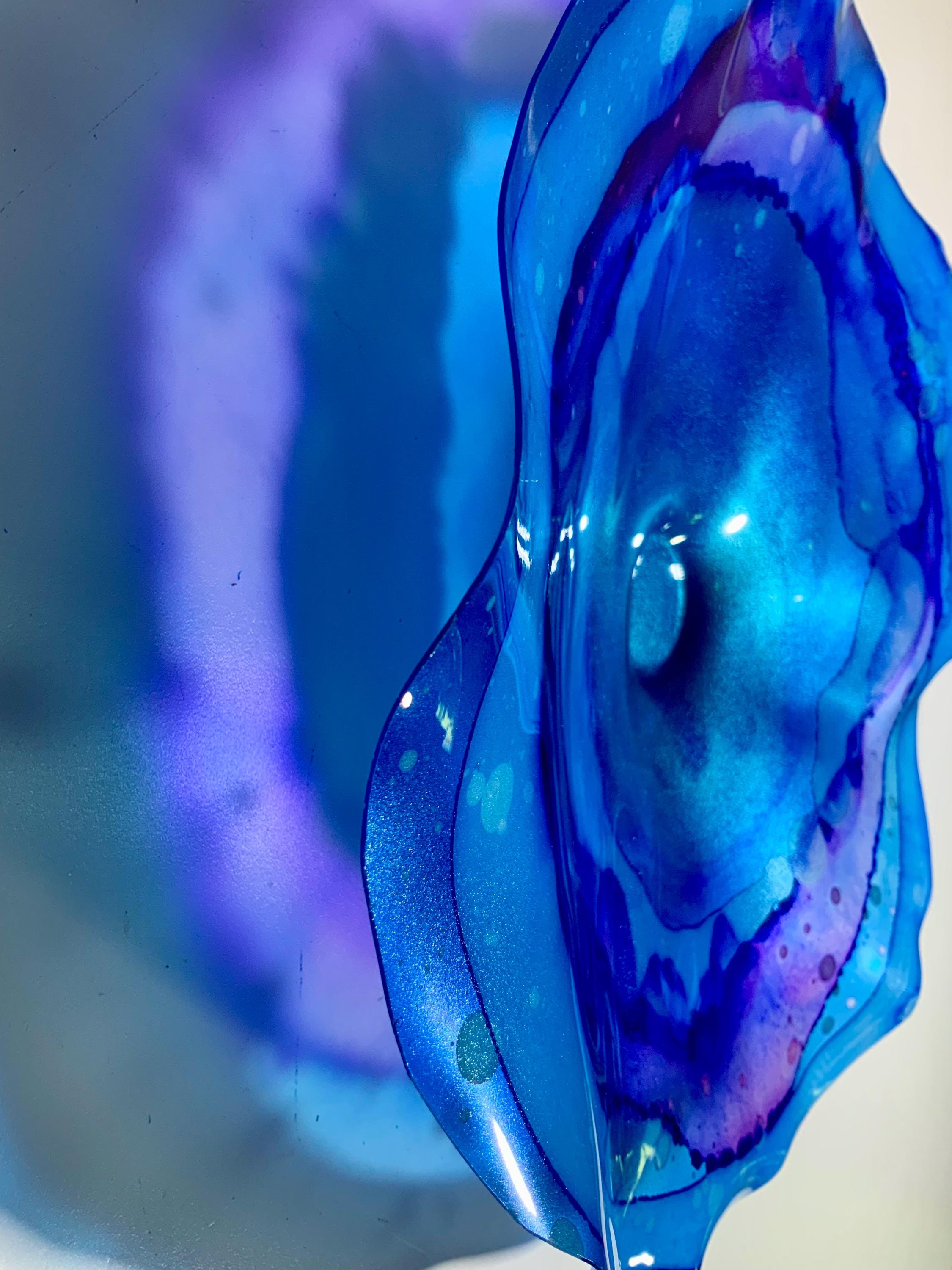 Each collectible piece is unique, no two are alike. This permanent, colorful, eye catching art looks and feels like glass. It shimmers in the light resembling water. They are very DURABLE, AND LIGHTWEIGHT. These flowers are easy to hang, all weather and UV resistant. Great for indoor or outdoor decorating.