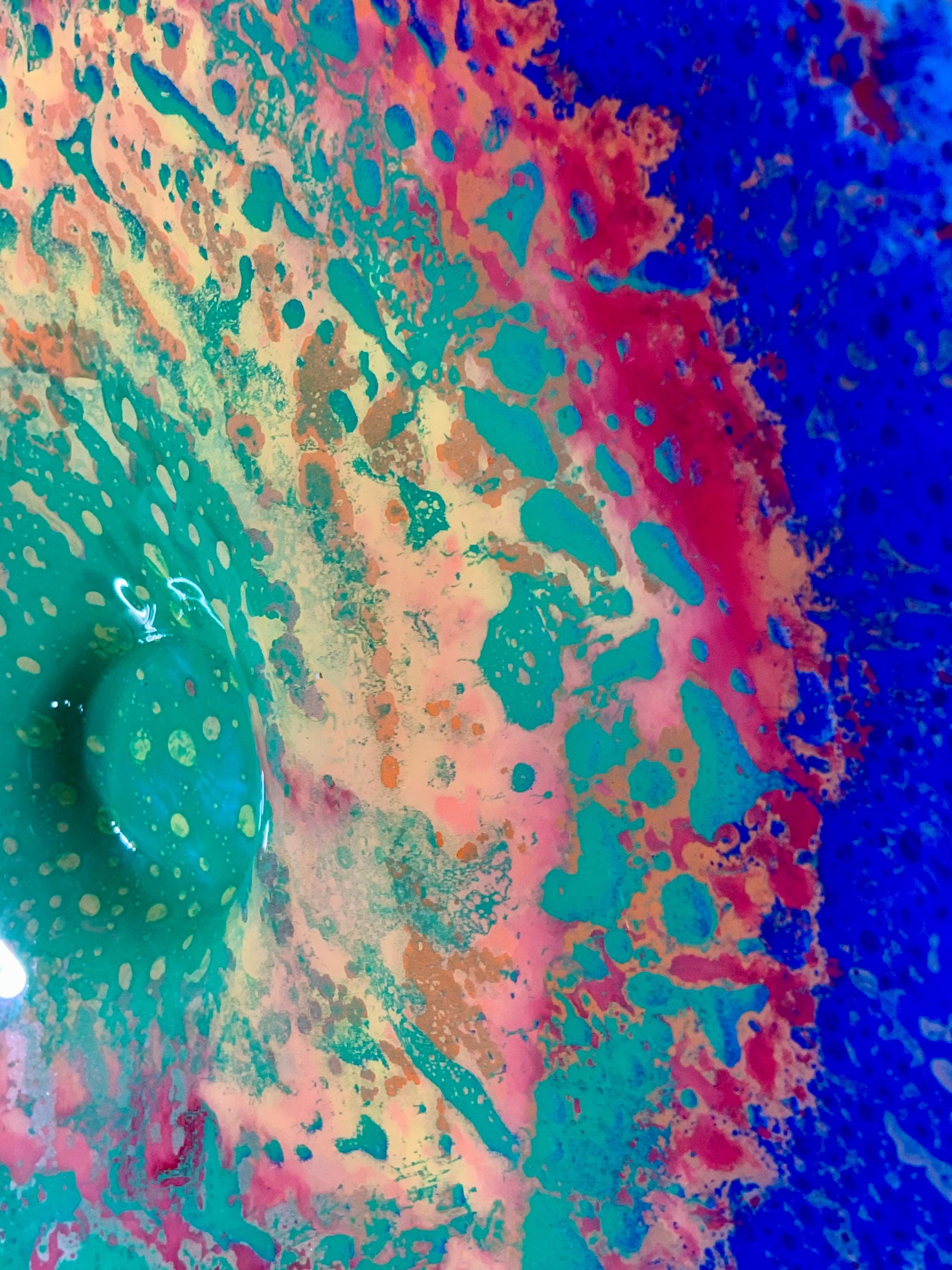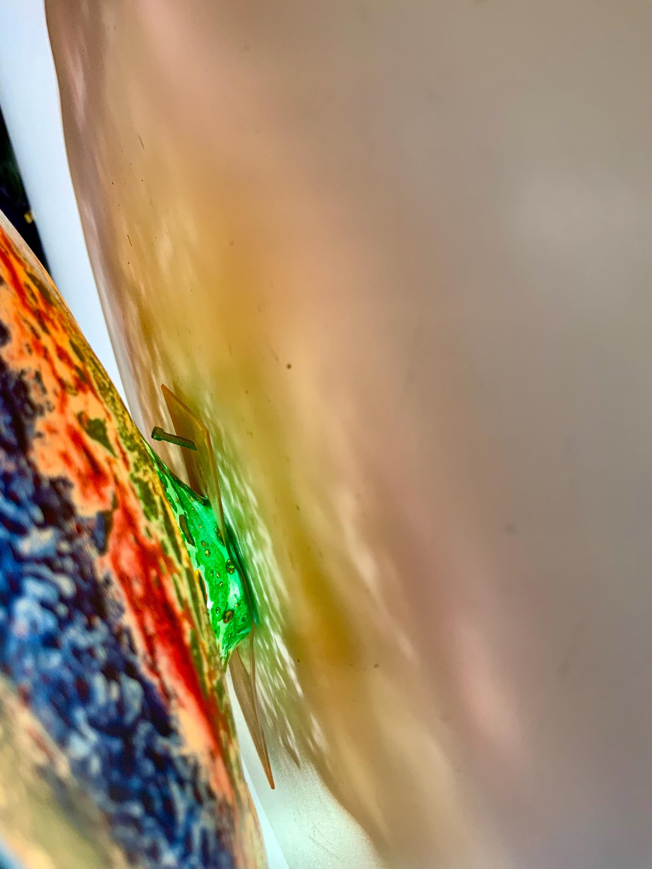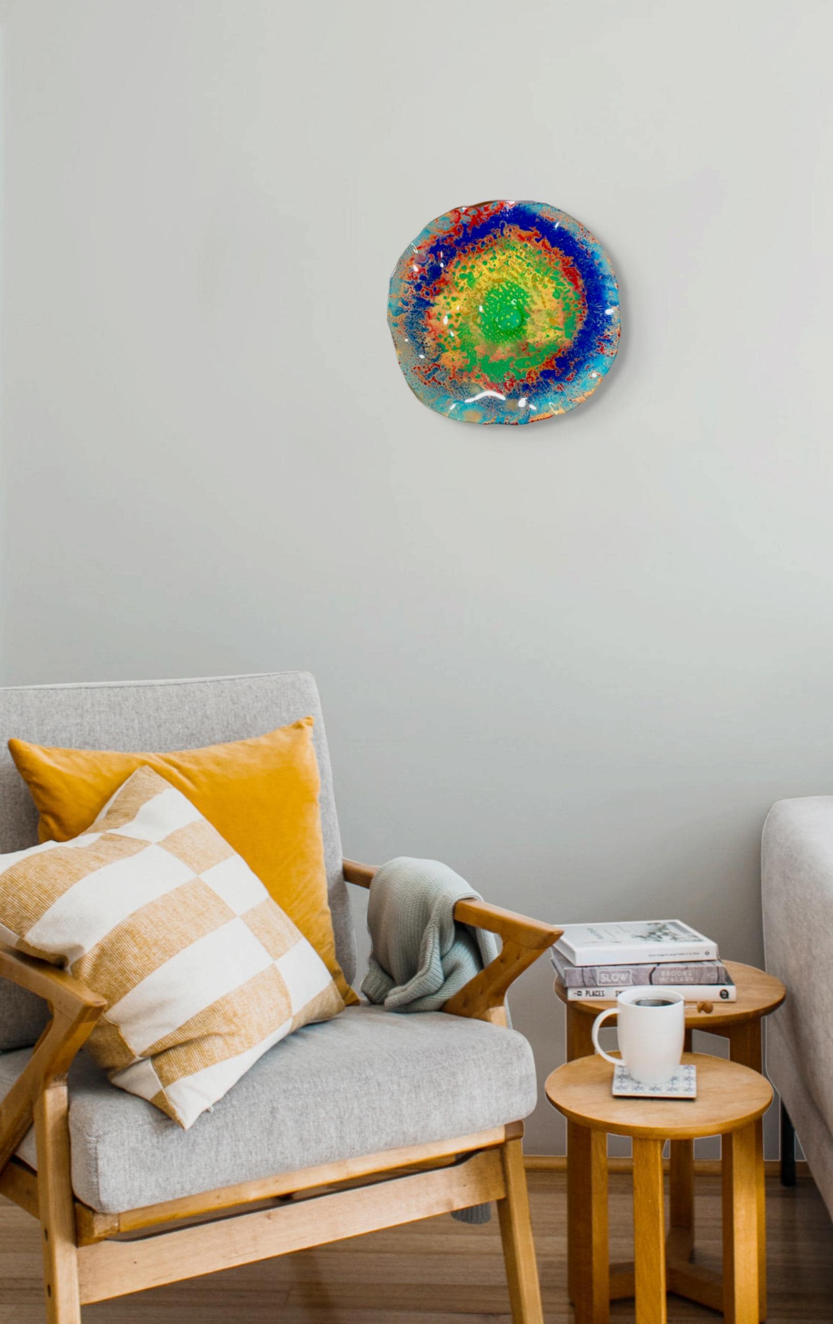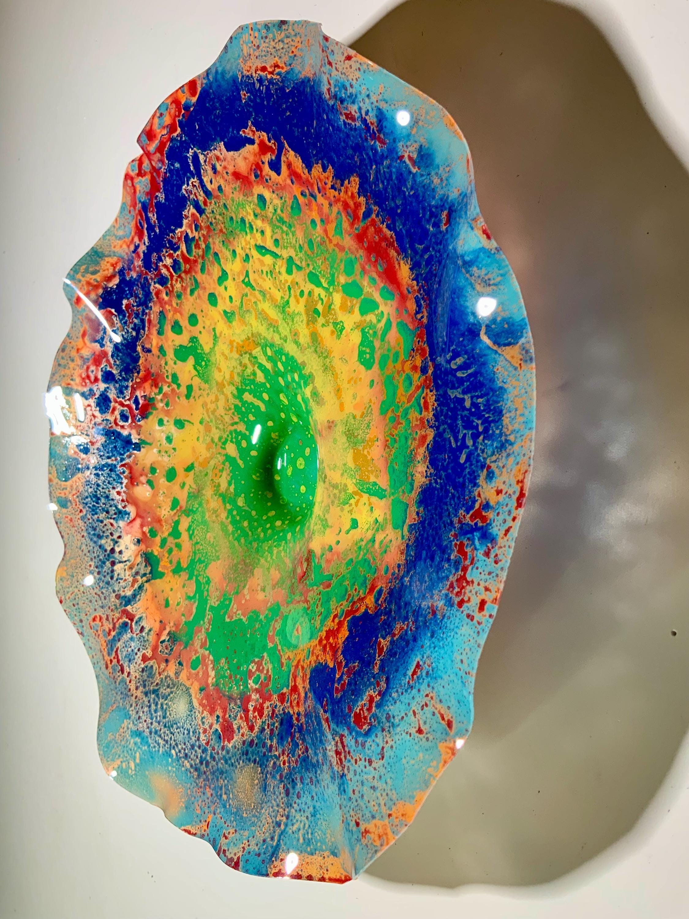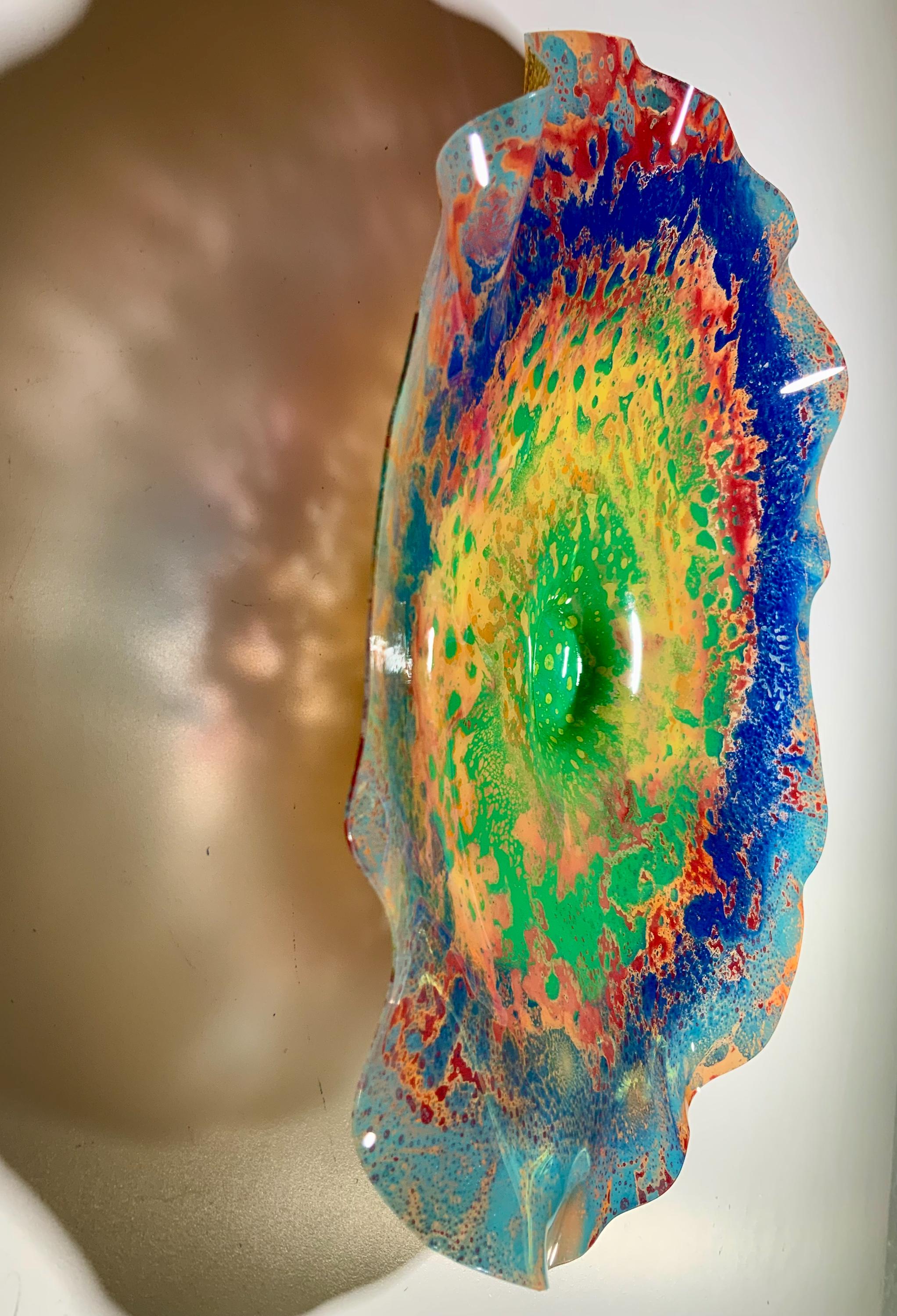Wall flower cool vibes with blue, aqua,orange, yellow and green. The light filters through casting a colorful effect on the hanging surface.