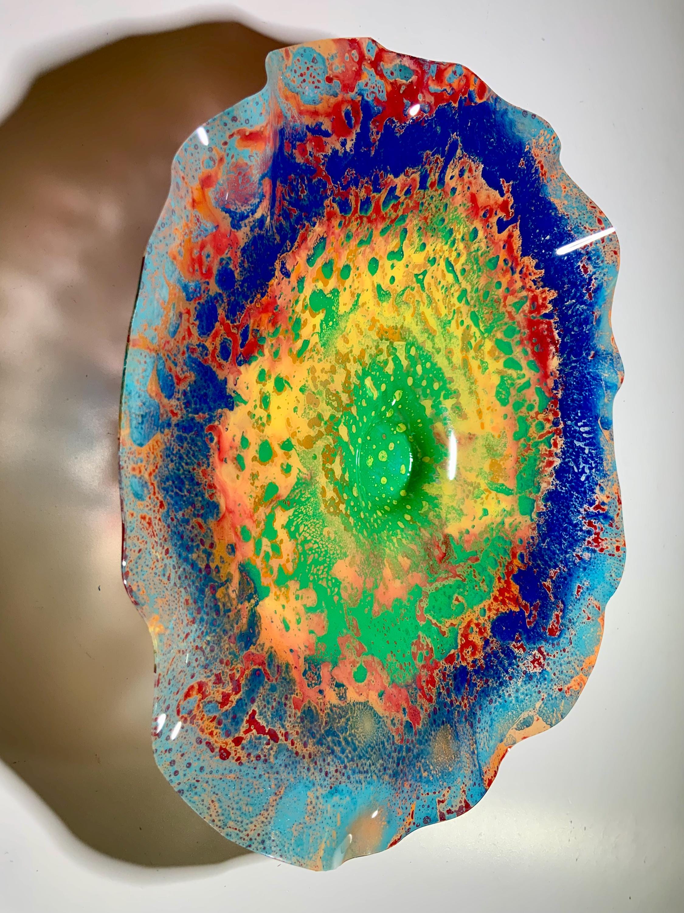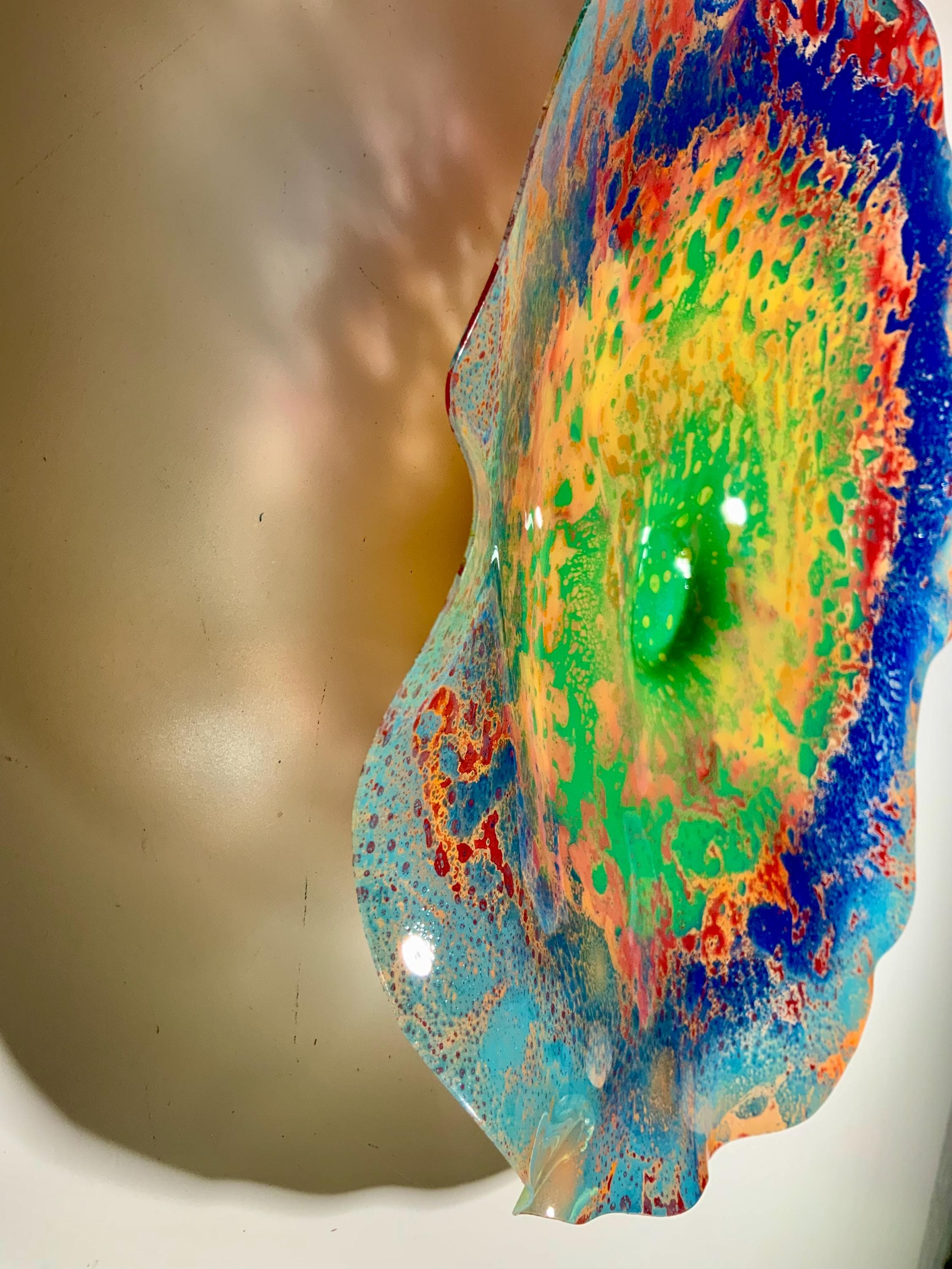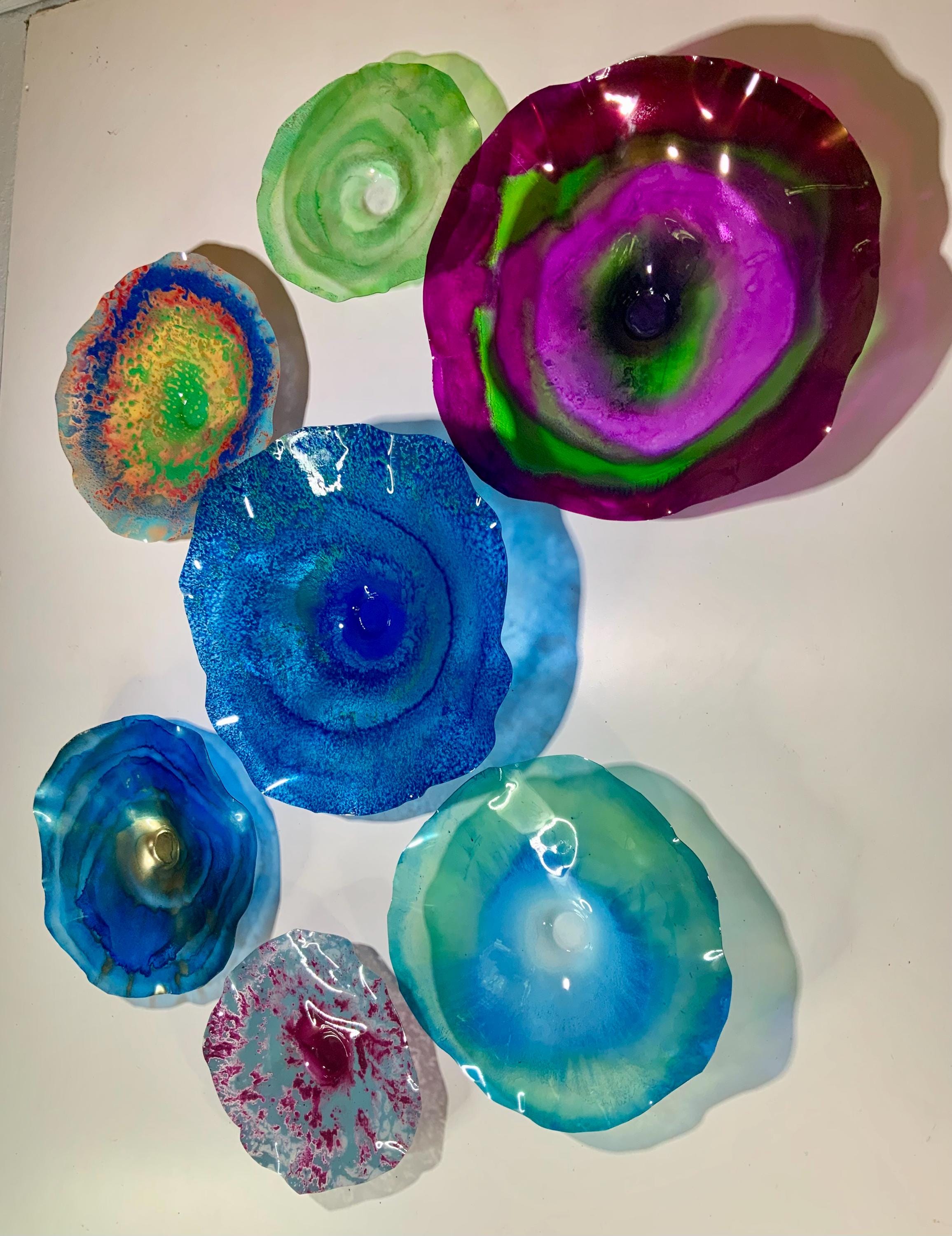 Each collectible piece is unique, no two are alike. This permanent, colorful, eye catching art looks and feels like glass. It shimmers in the light resembling water. They are very DURABLE, AND LIGHTWEIGHT. These flowers are easy to hang, all weather and UV resistant. Great for indoor or outdoor decorating.