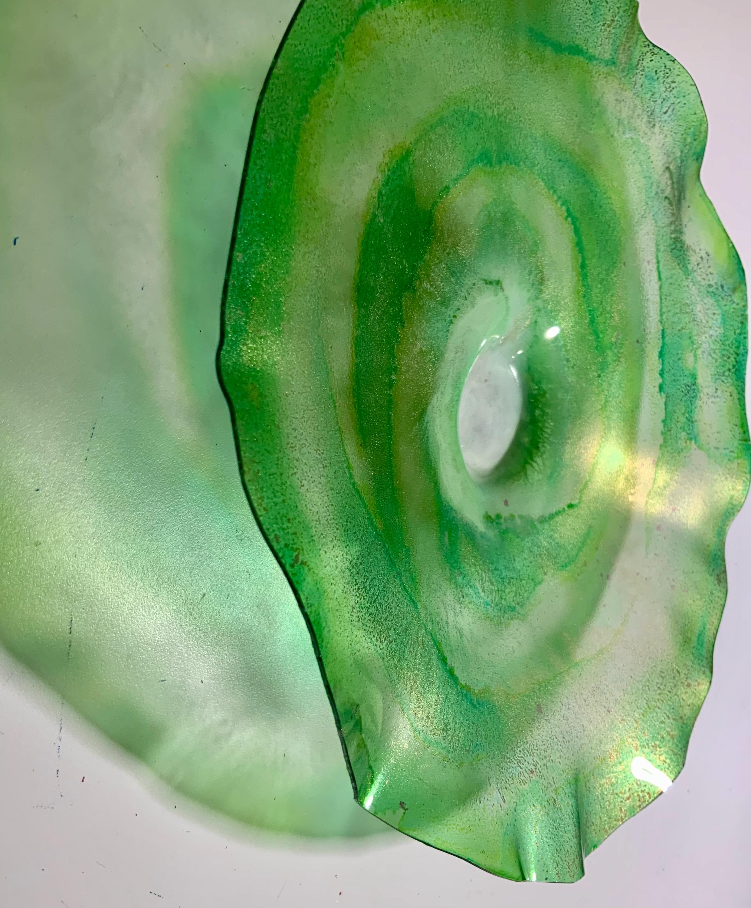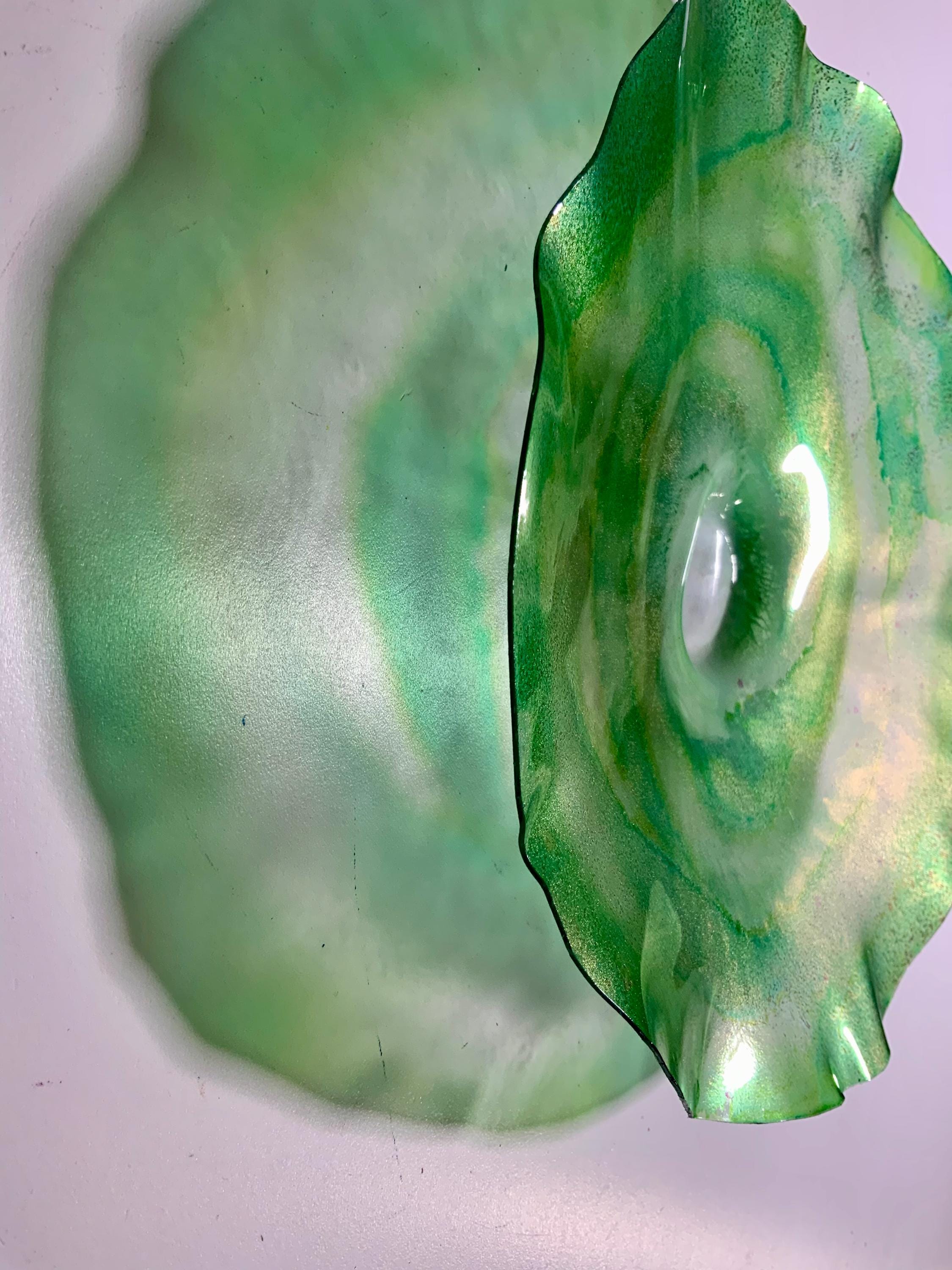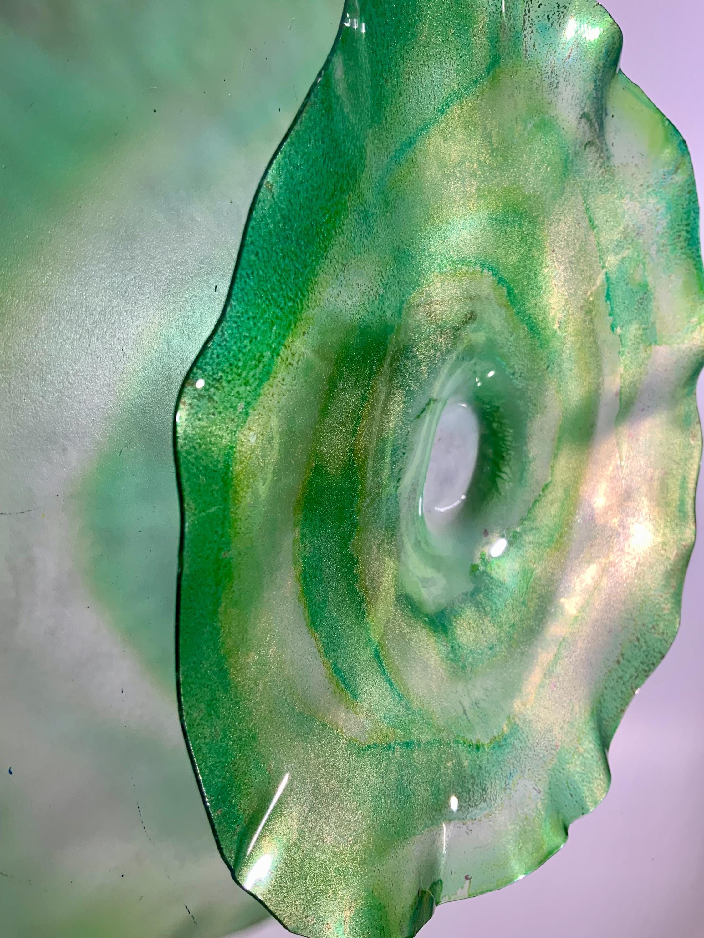Each collectible piece is unique, no two are alike. This permanent, colorful, eye catching art looks and feels like glass. It shimmers in the light resembling water. They are very DURABLE AND LIGHTWEIGHT. This flower is easy to hang all weather and UV resistant. Great for indoor or outdoor decorating.
