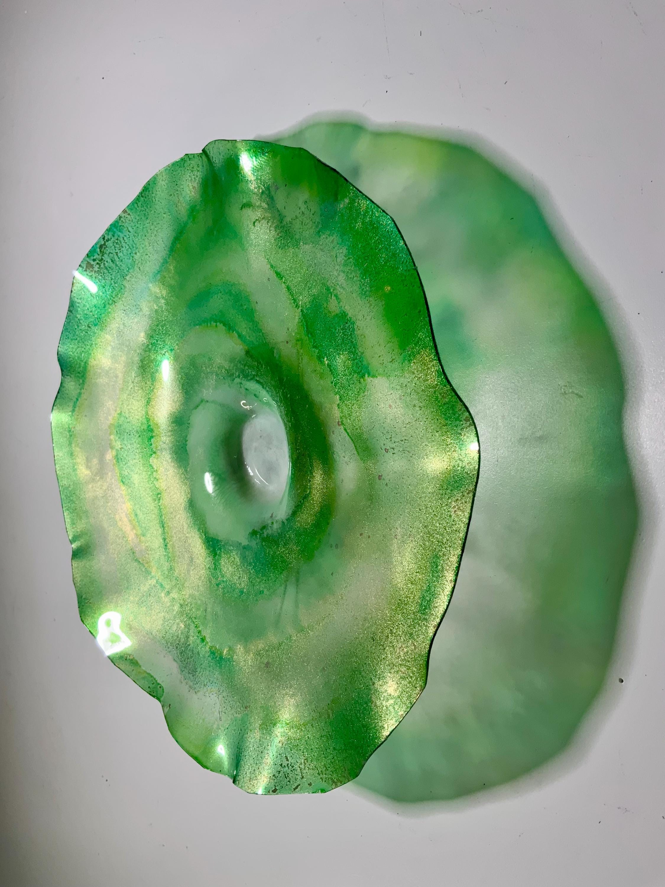 Small Wall flower decor vibrant art for home 9”” green/gold blend handmade recycled plastic/boho Yard art/ceiling hanging/looks like glass