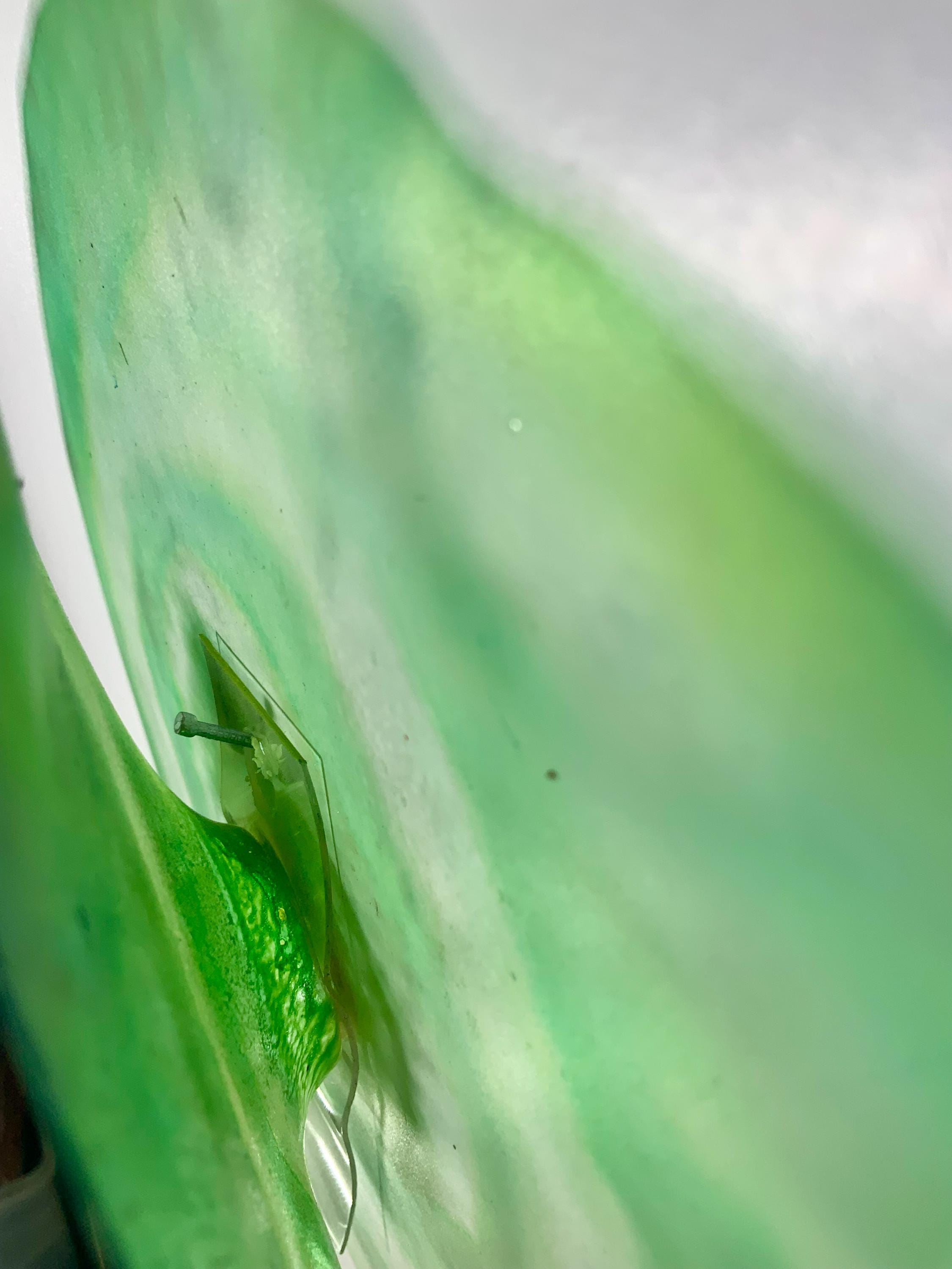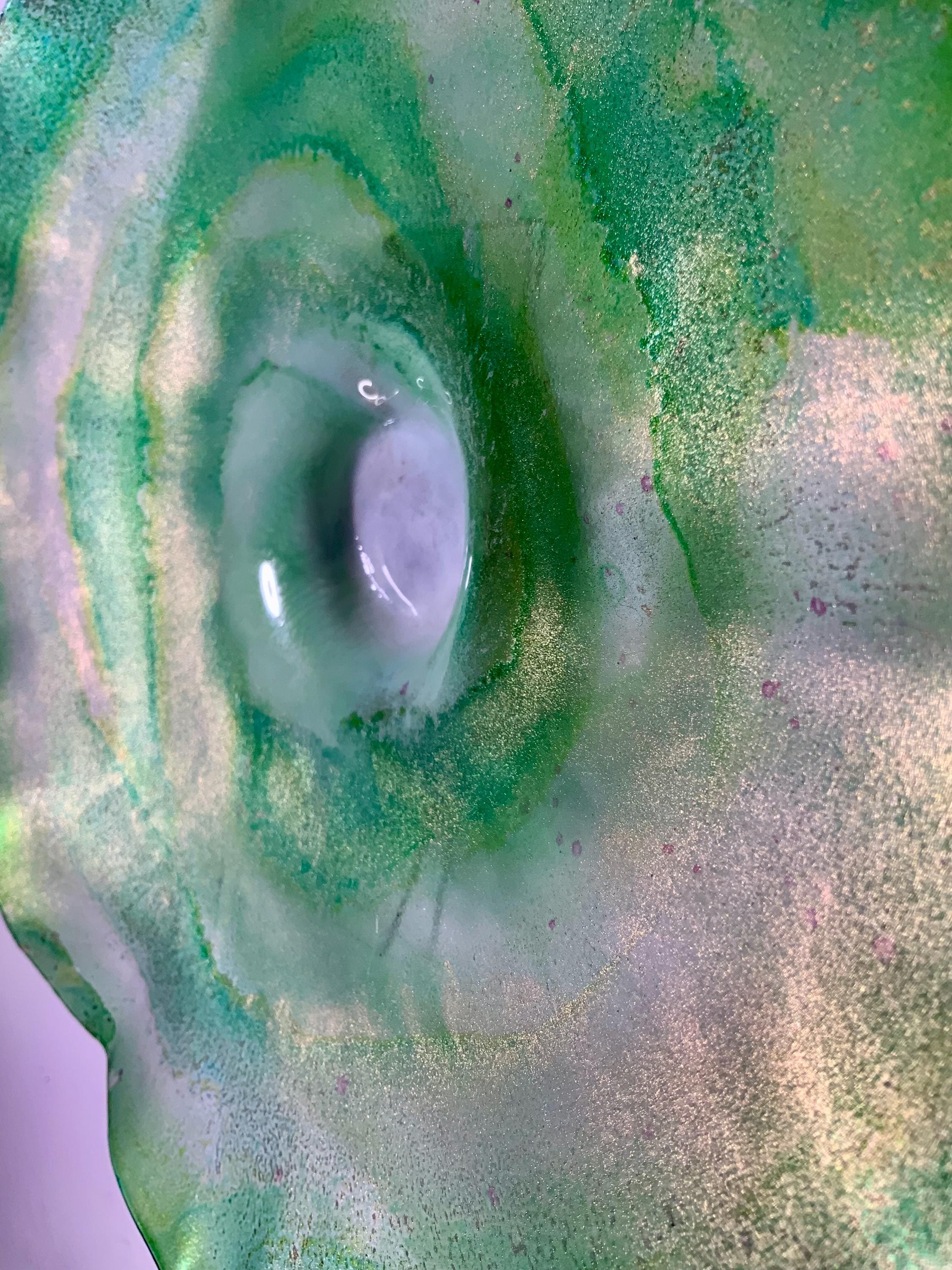 Radiant wall flower radiant blend of green and gold. The light filters through casting a colorful glow to the hanging surface.