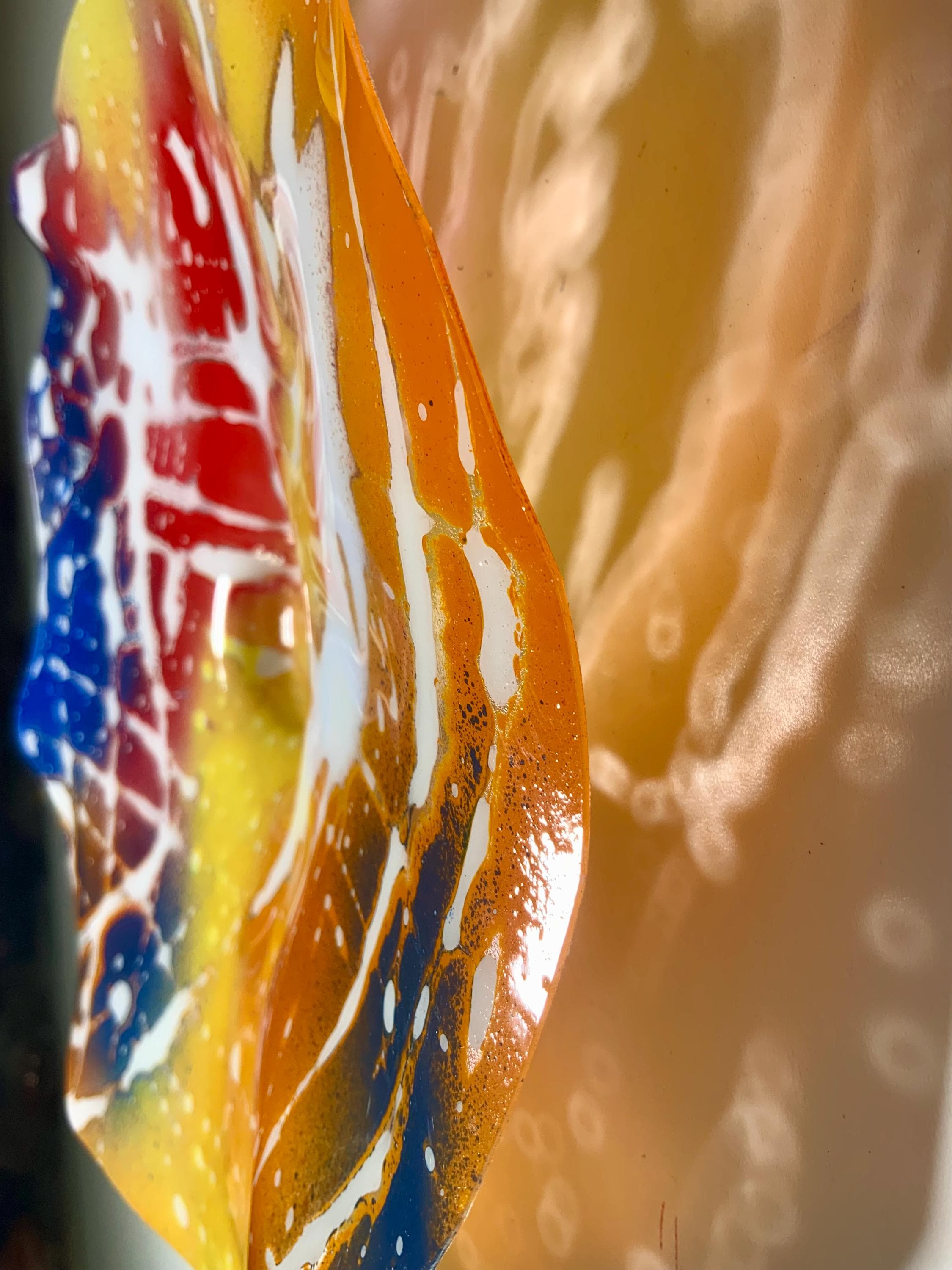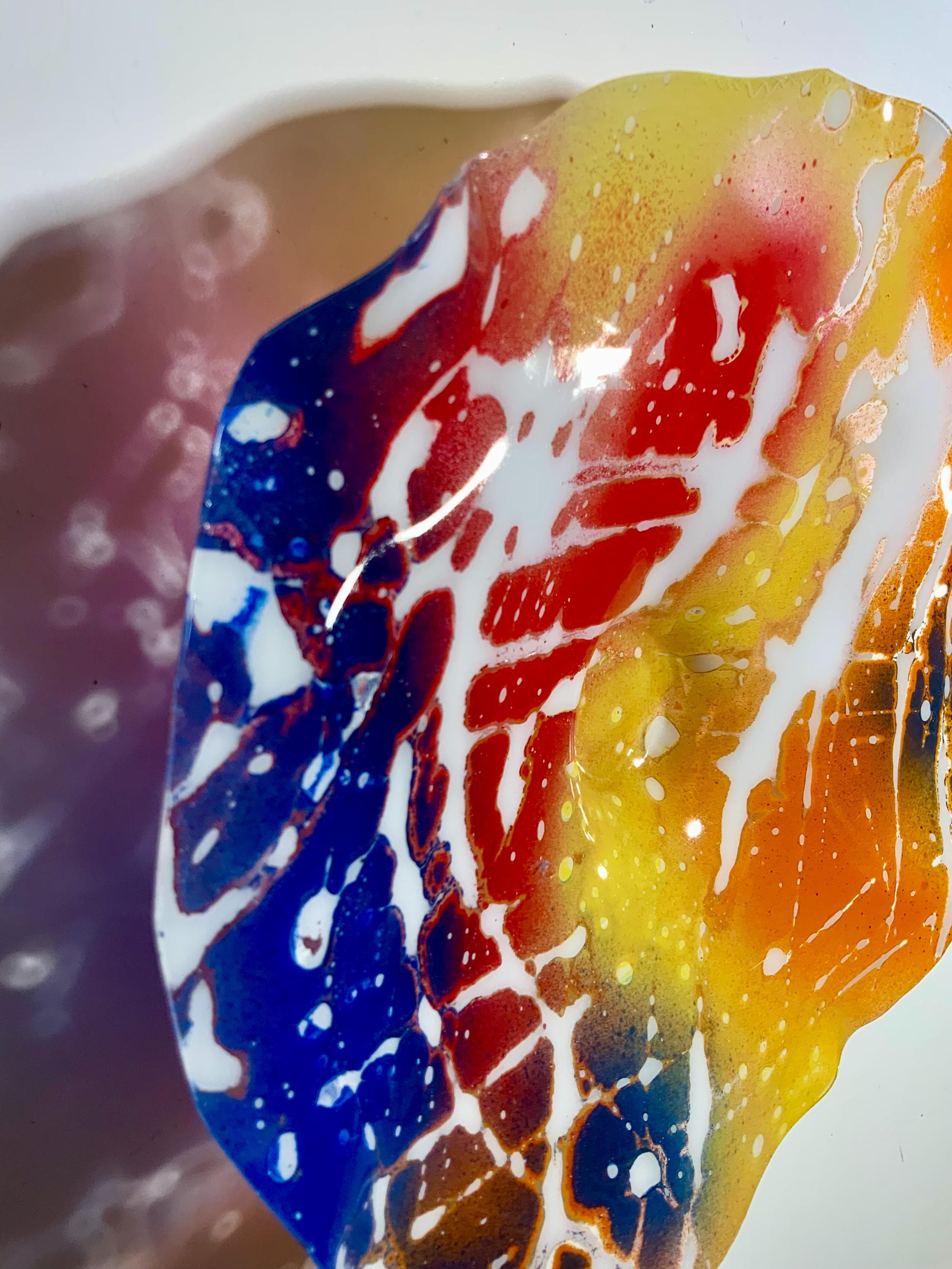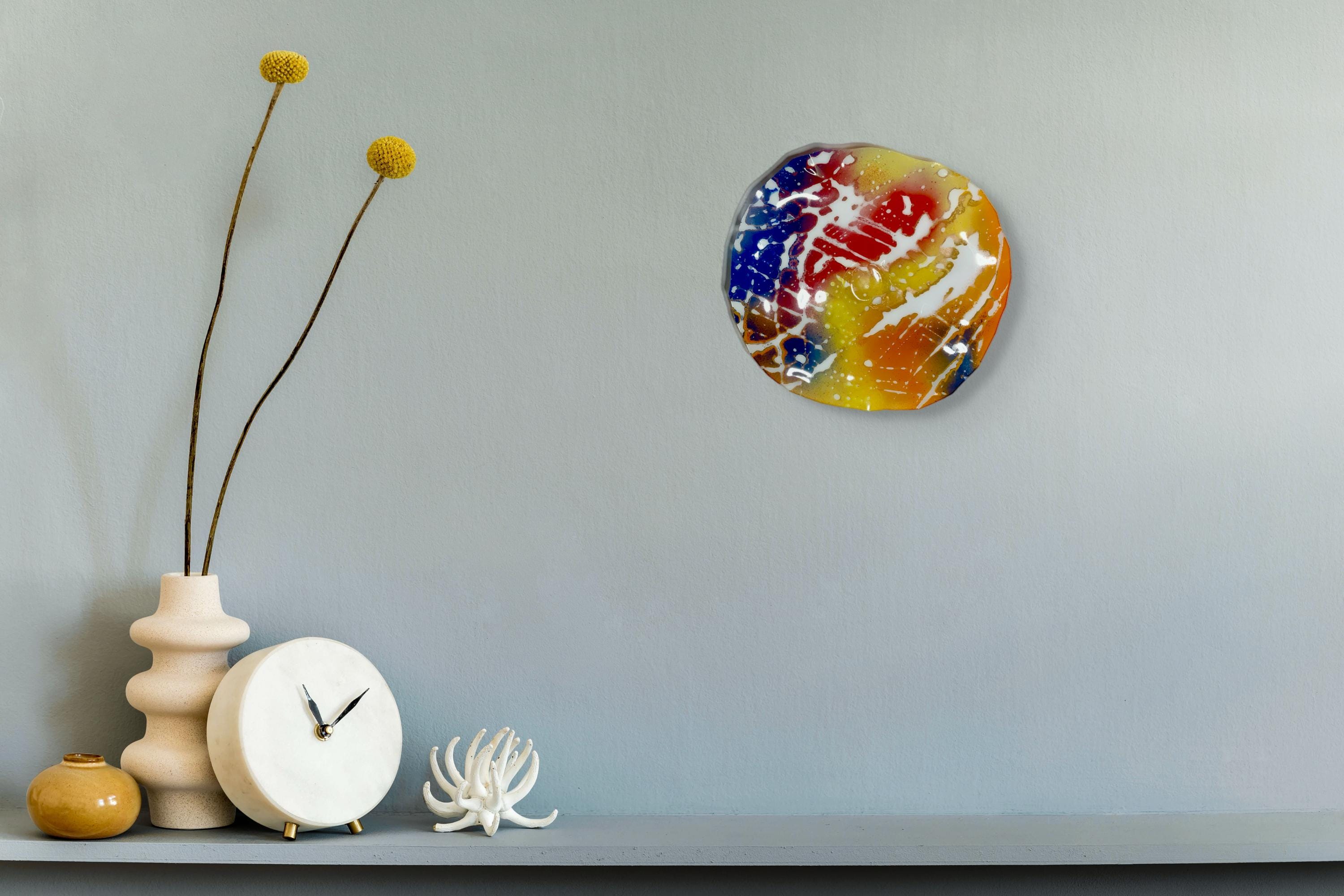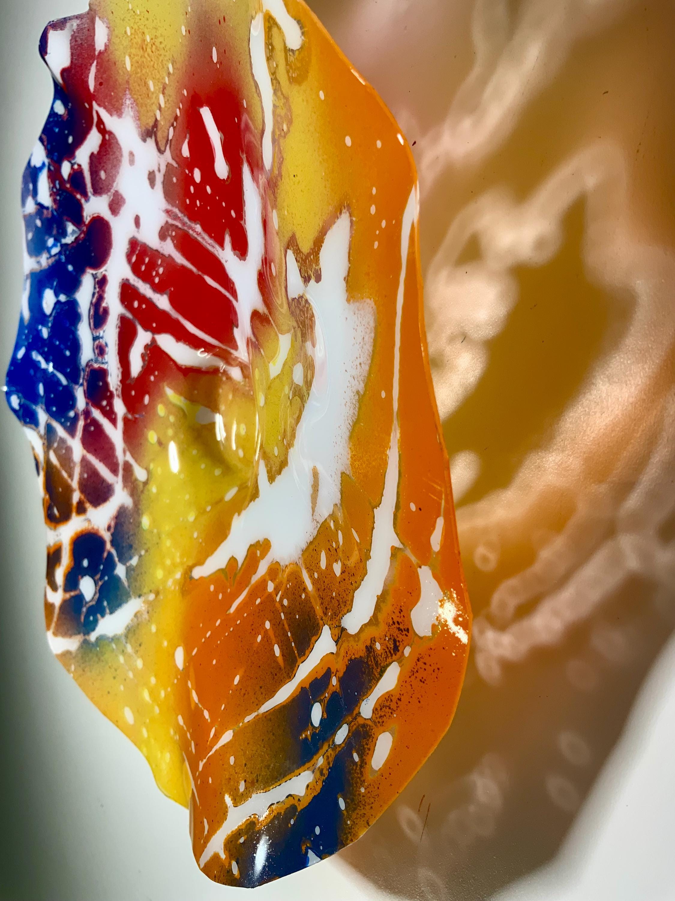 Radiant wall flower vibrant blend of blue, red, yellow, white and orange. The light filters through casting a colorful glow to the hanging surface.