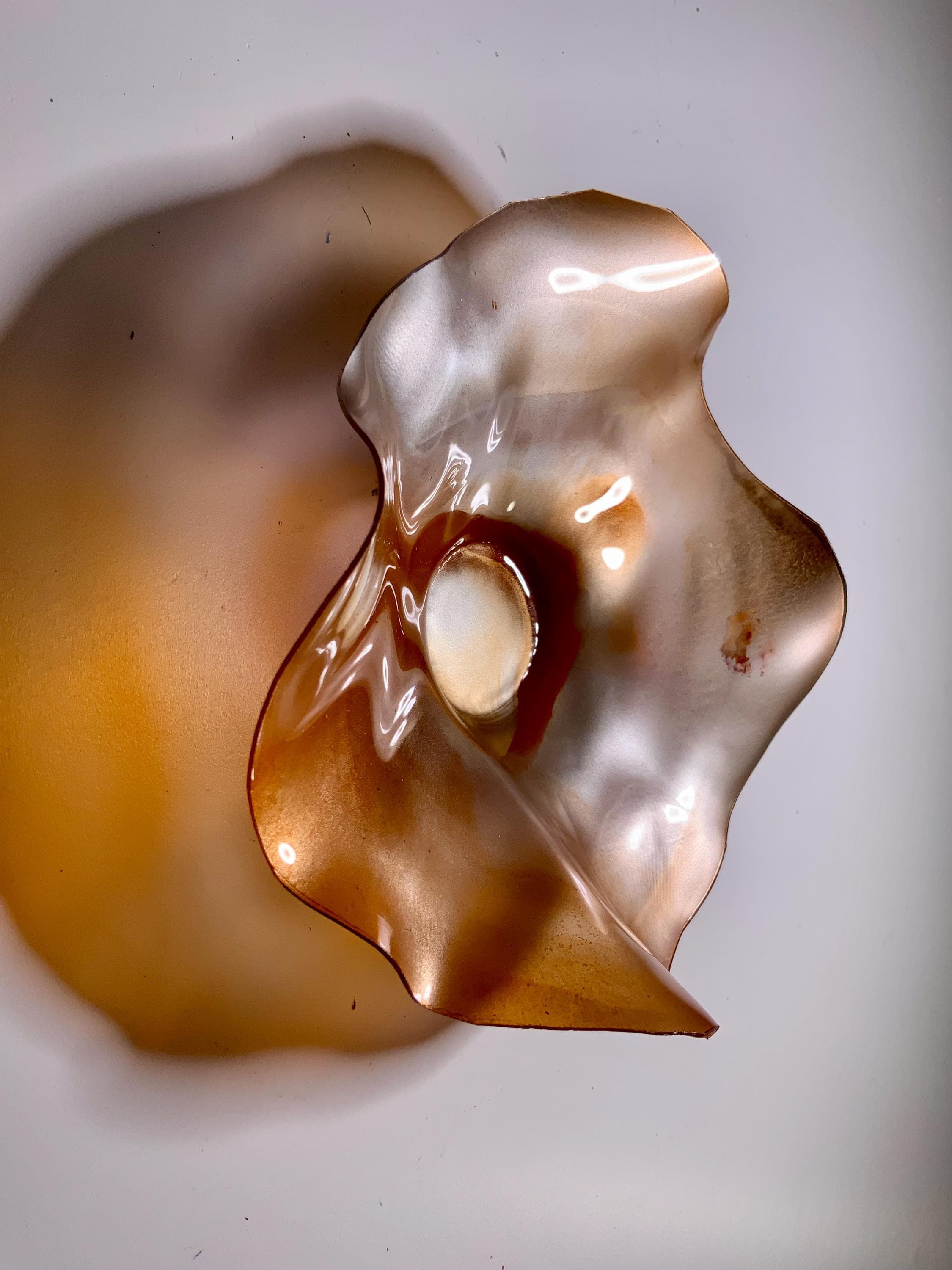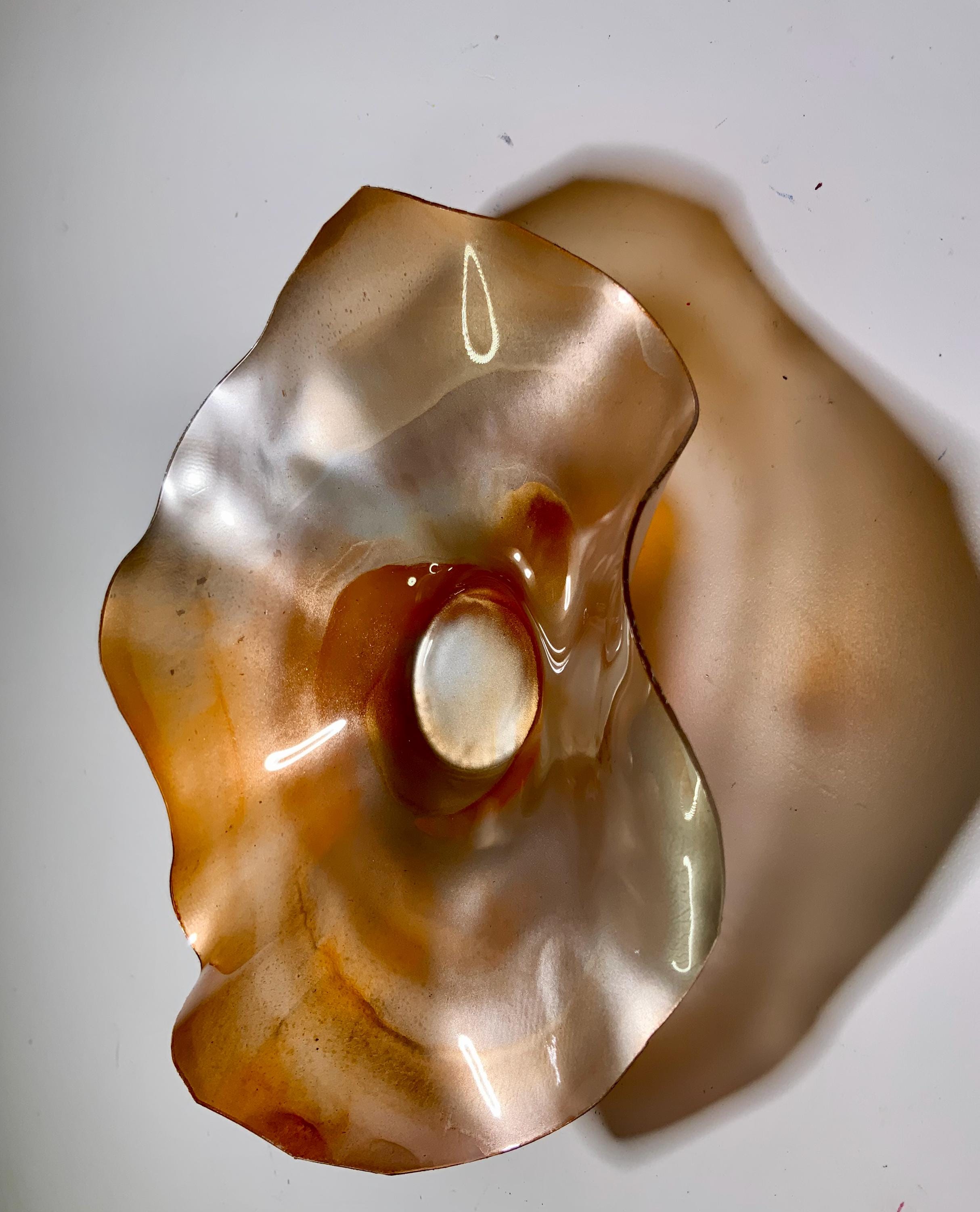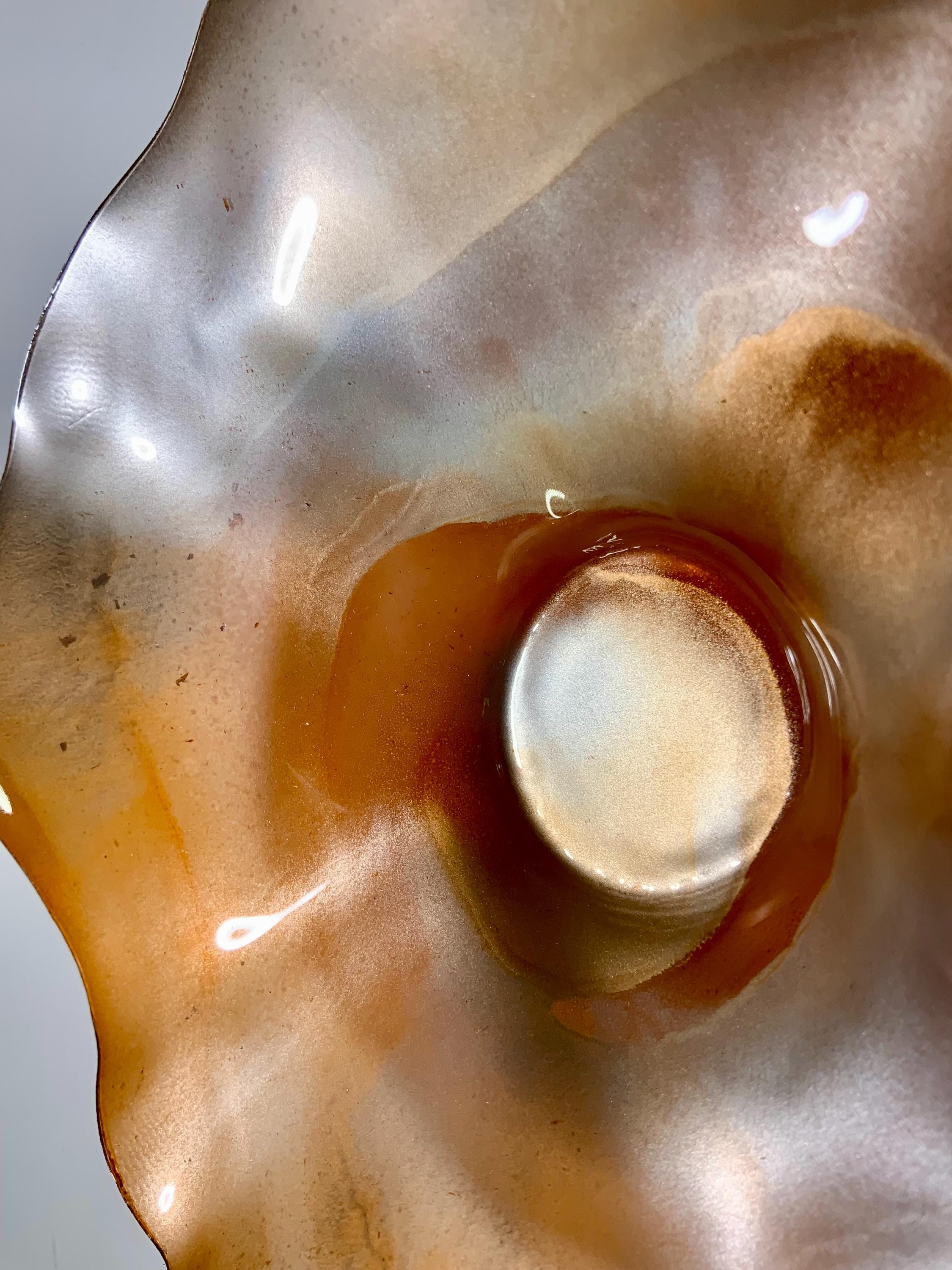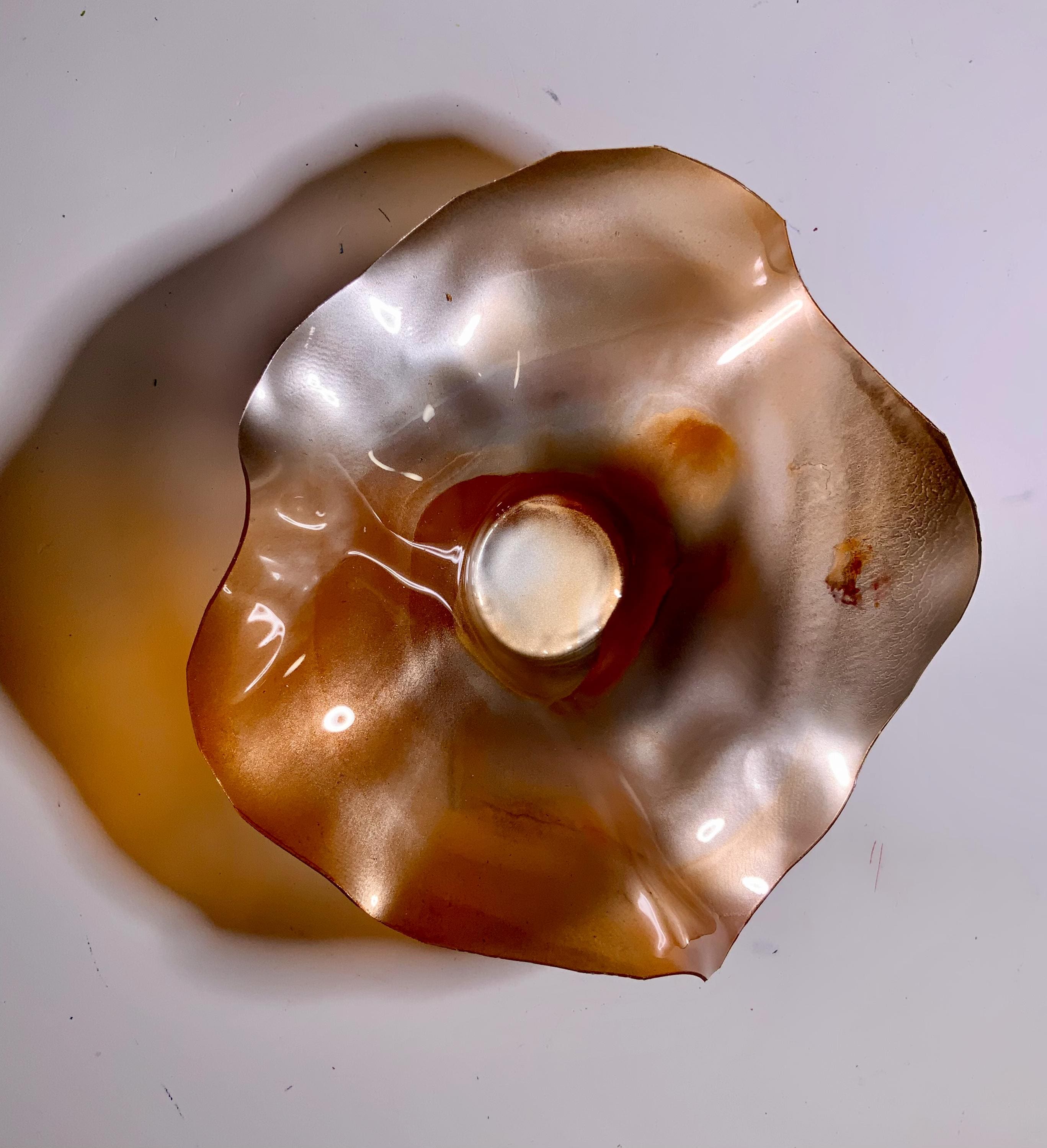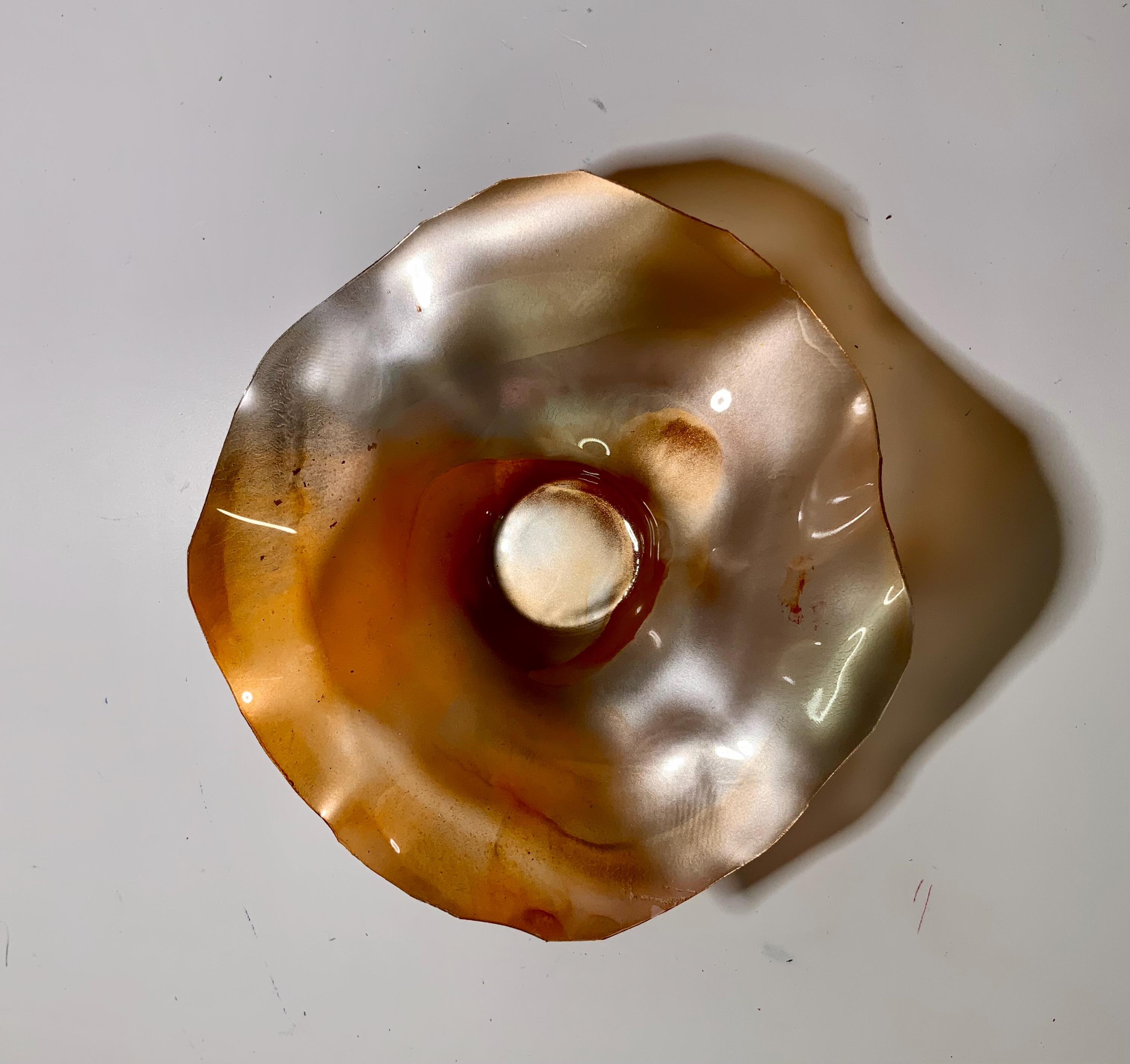 Radiant wall flower designer plate stunning blend of orange and silver blend. The light filters through casting a colorful glow to the hanging surface.