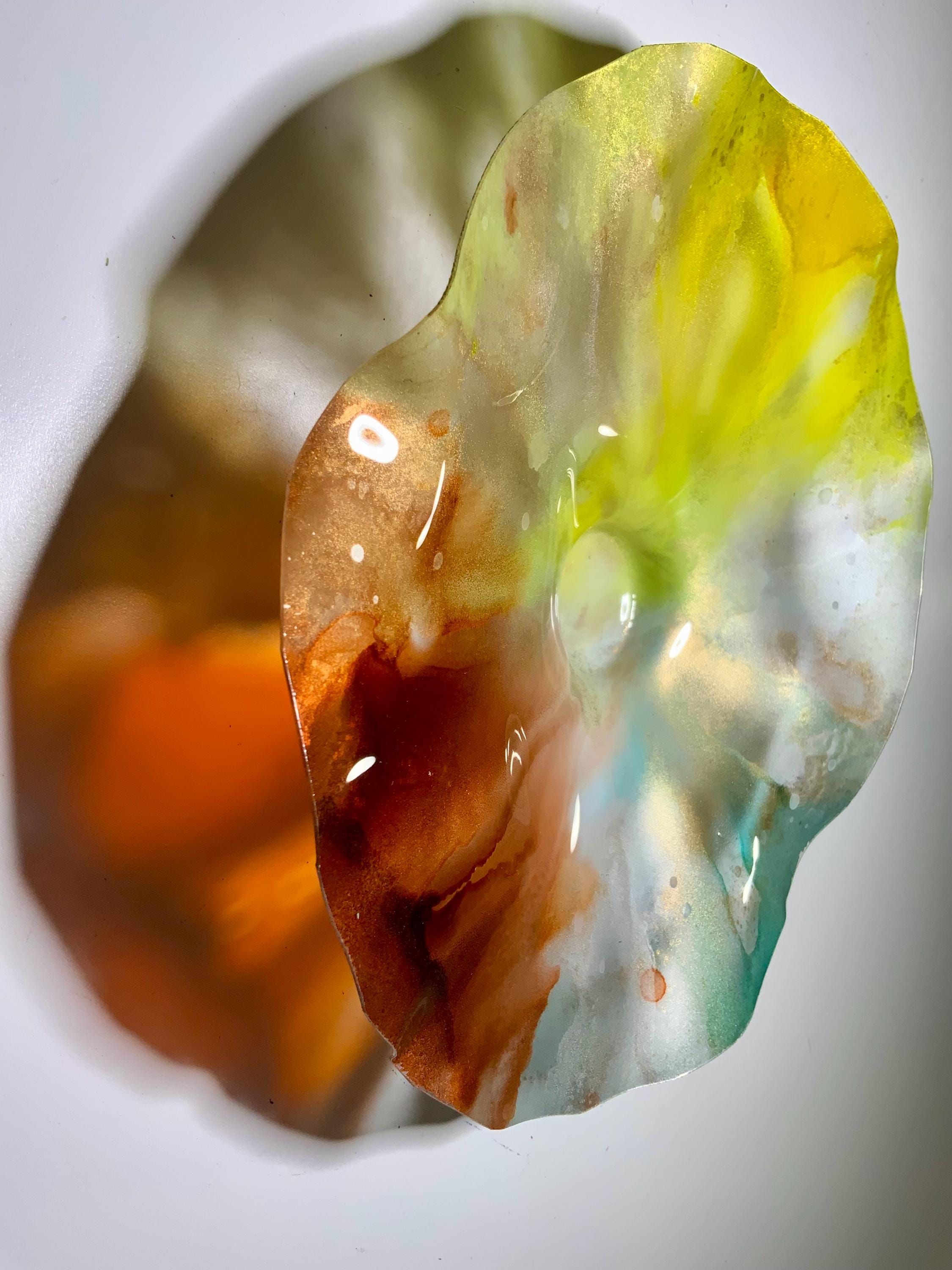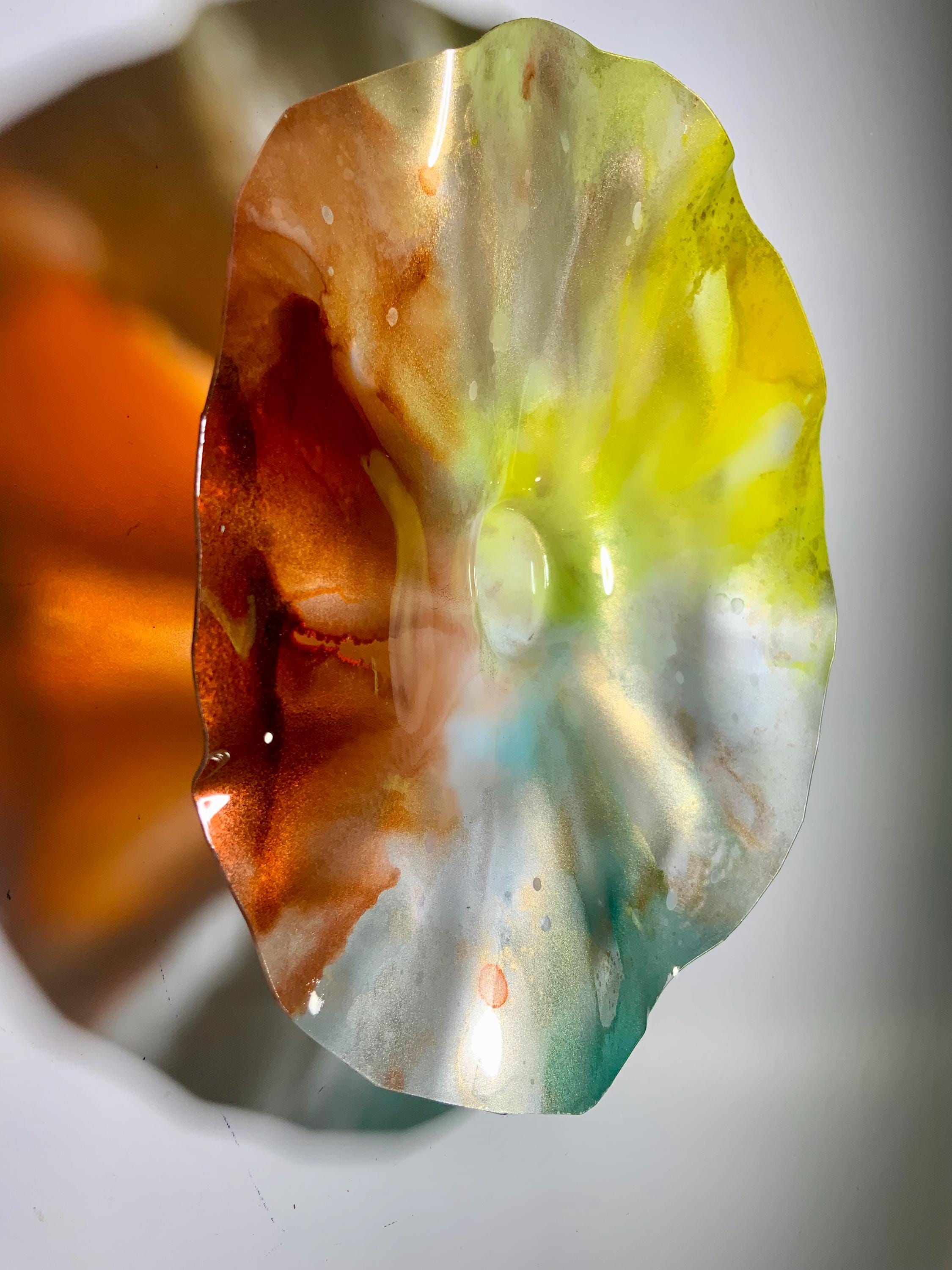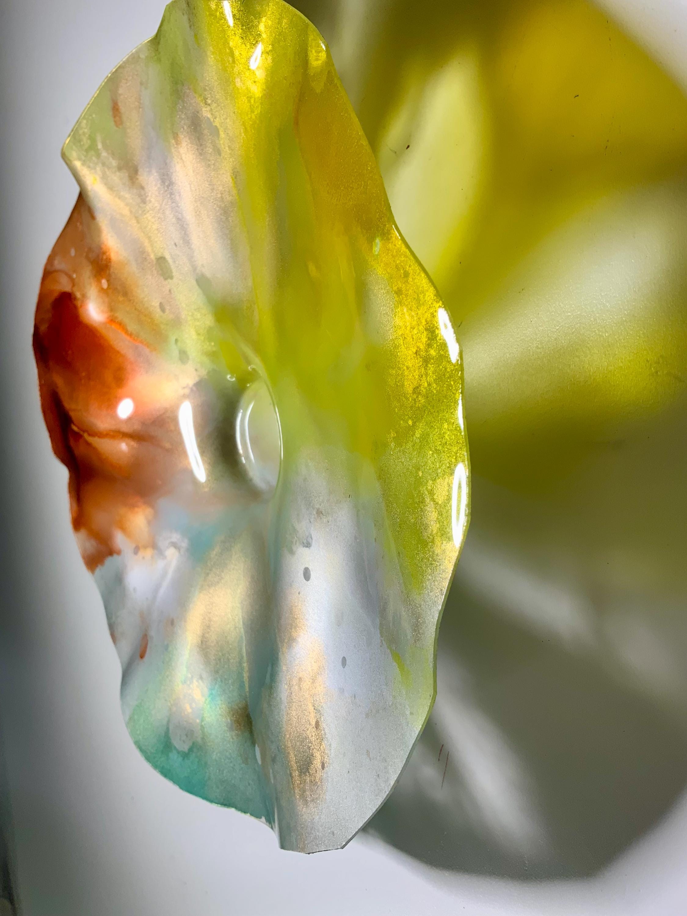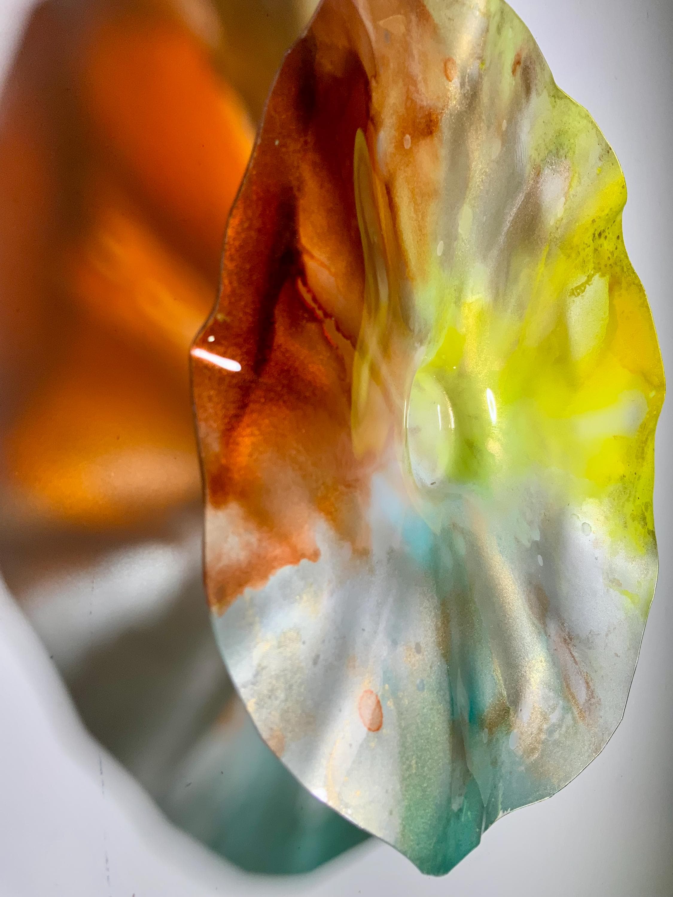 Radiant wall flower vibrant translucent. Burnt orange with yellow silver and teal. The light filters through casting a colorful glow to the hanging surface.
