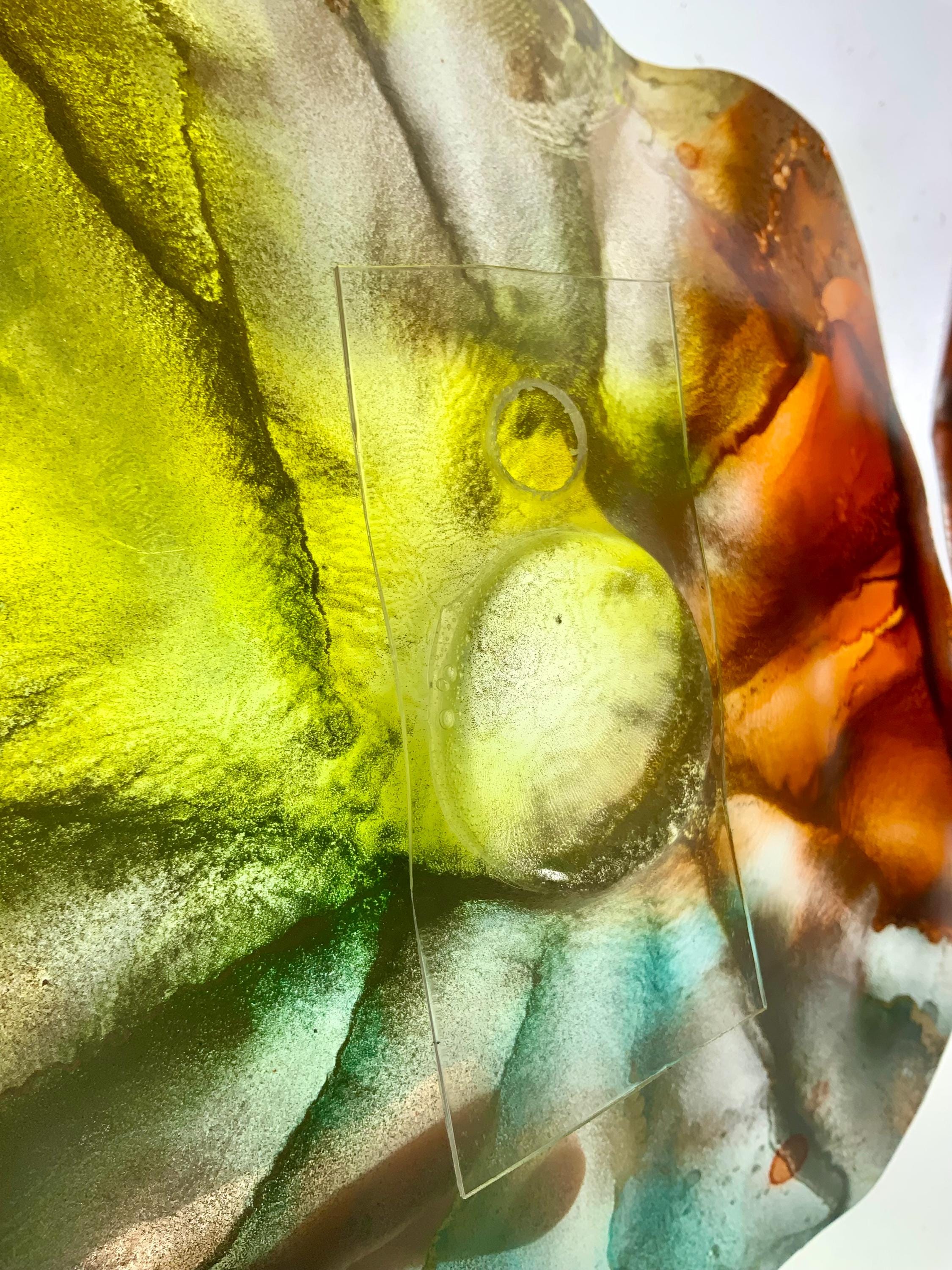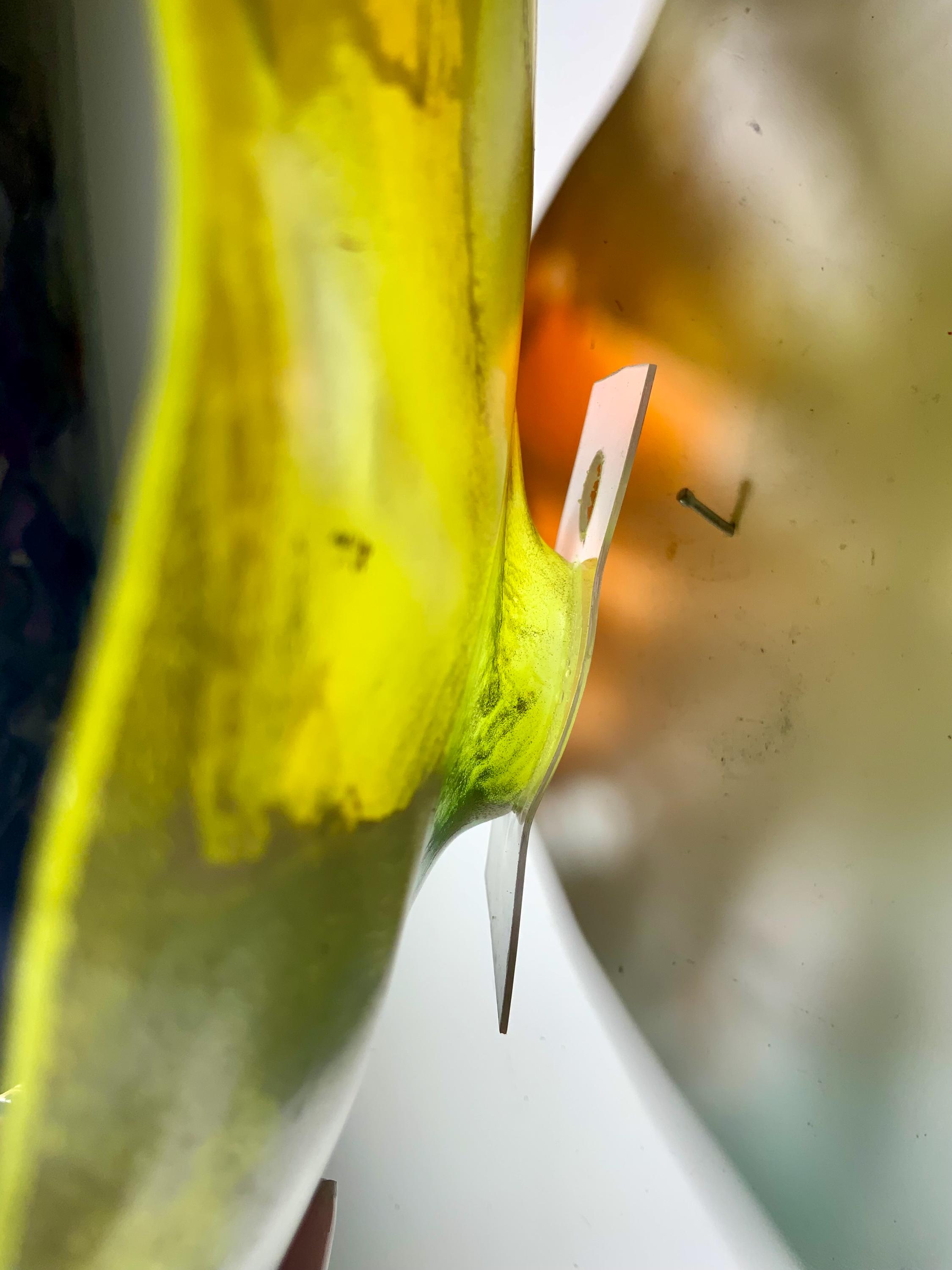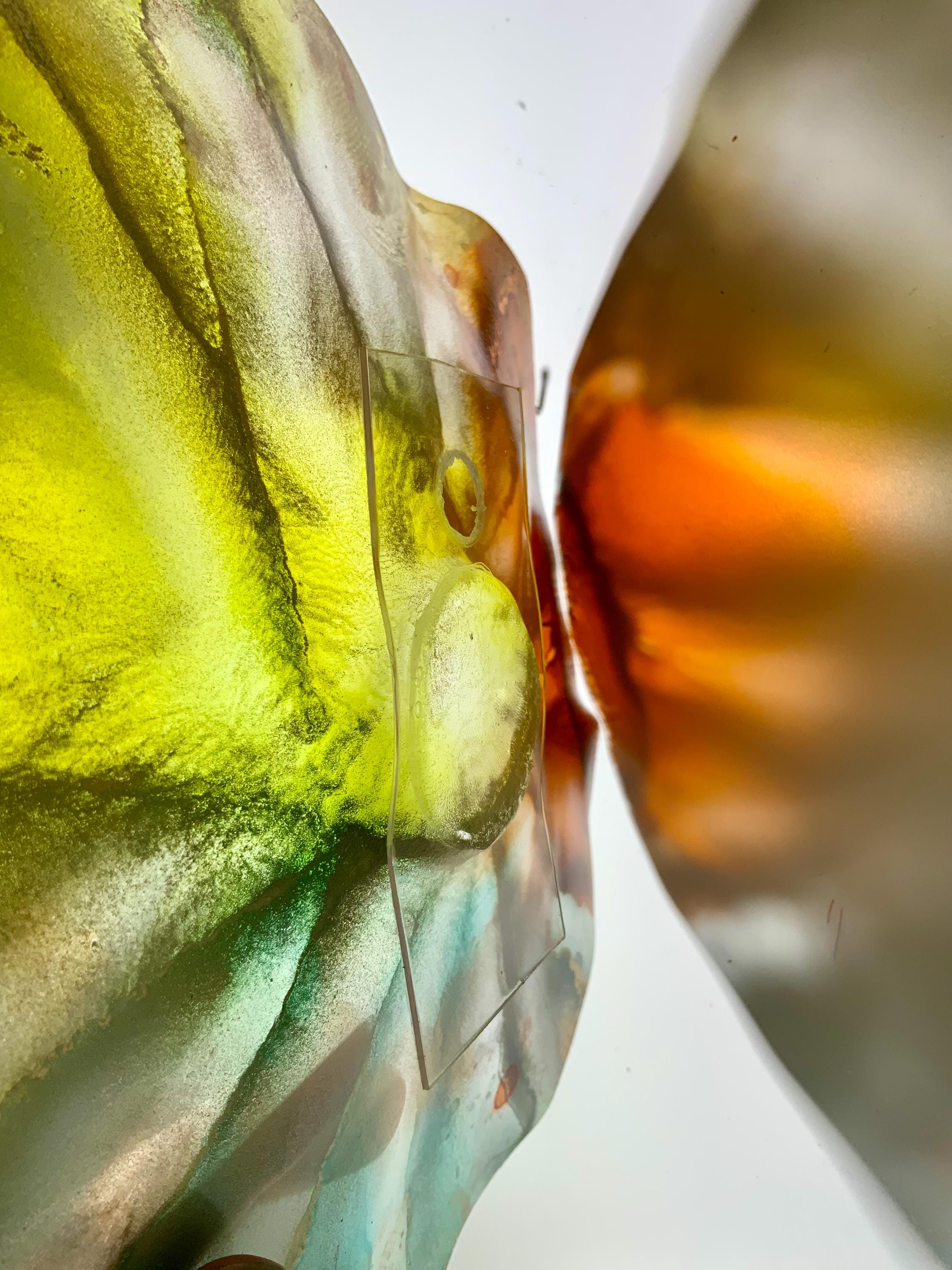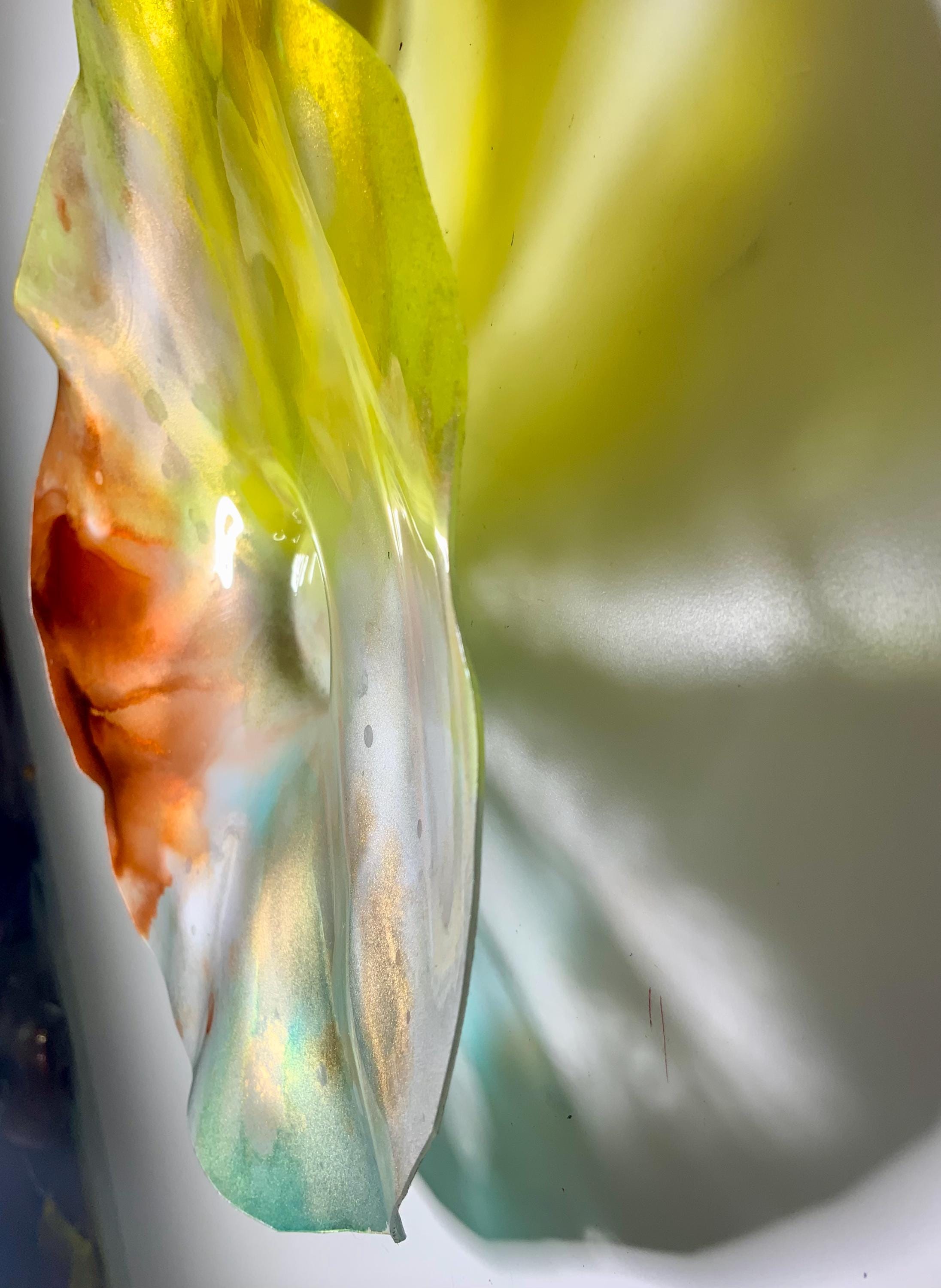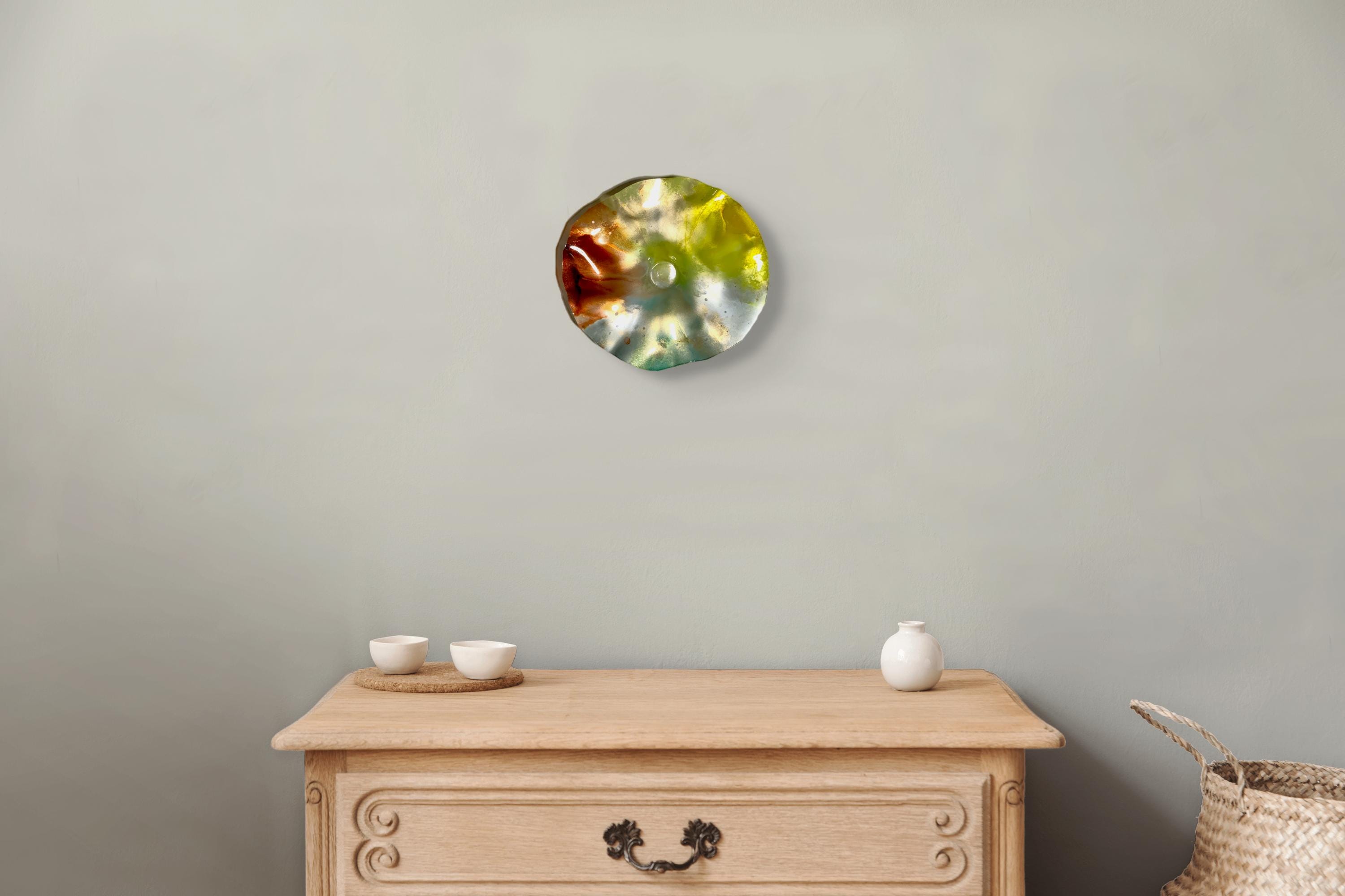 Radiant wall flower vibrant translucent. Burnt orange with yellow silver and teal. The light filters through casting a colorful glow to the hanging surface.
