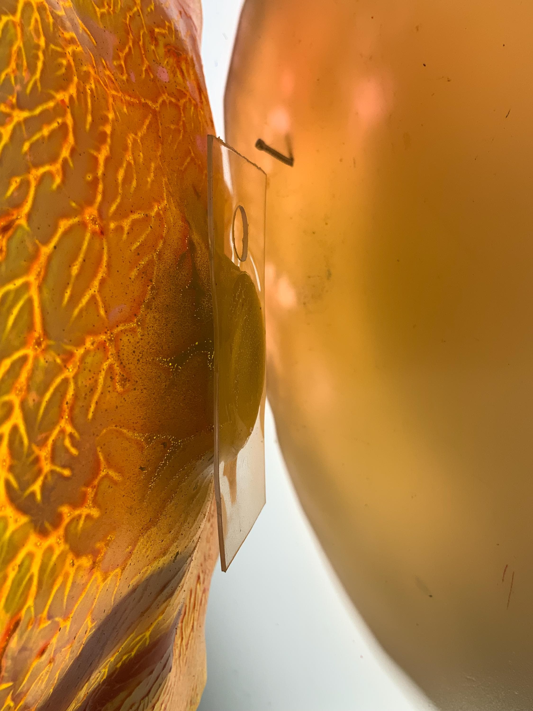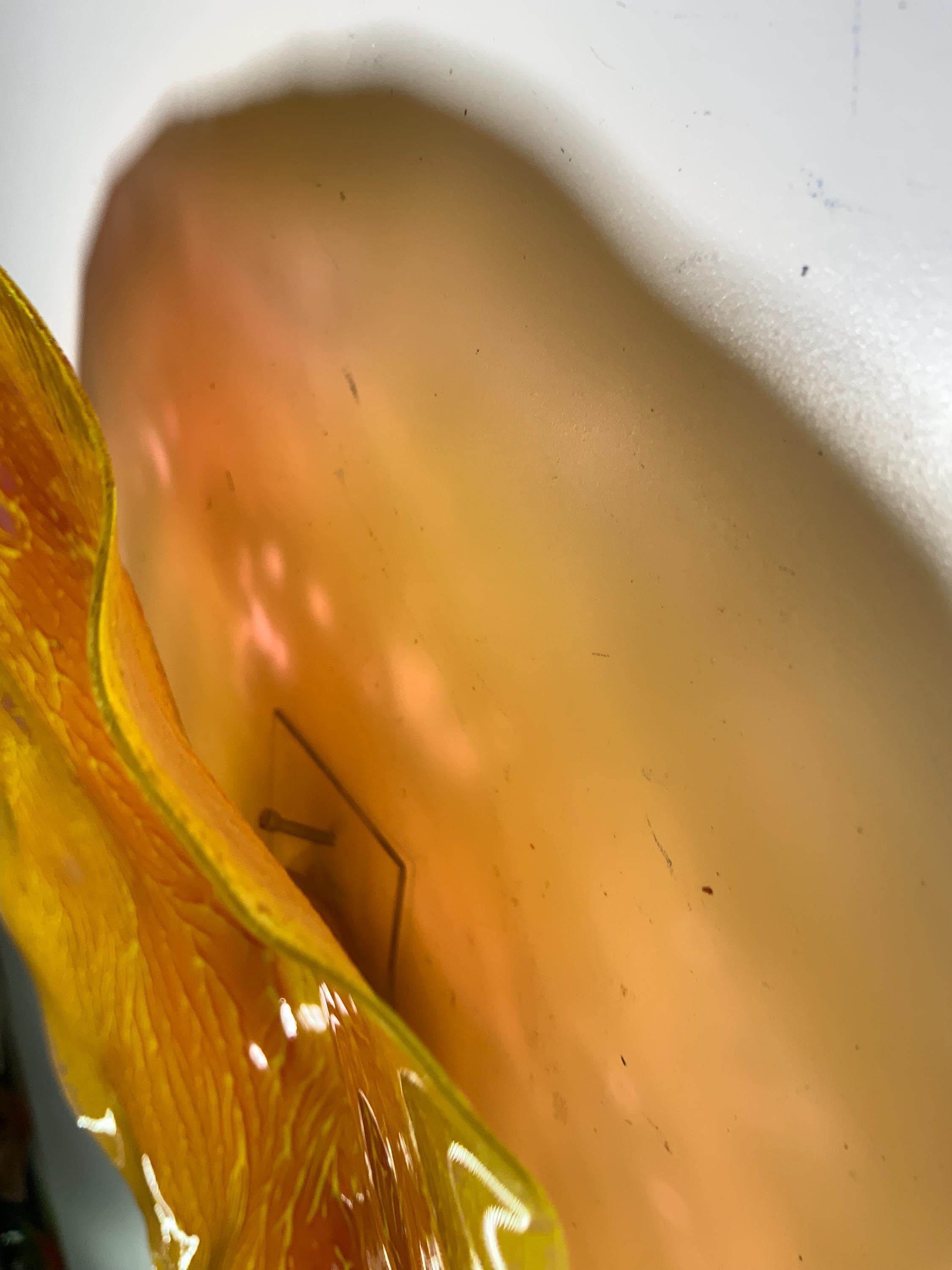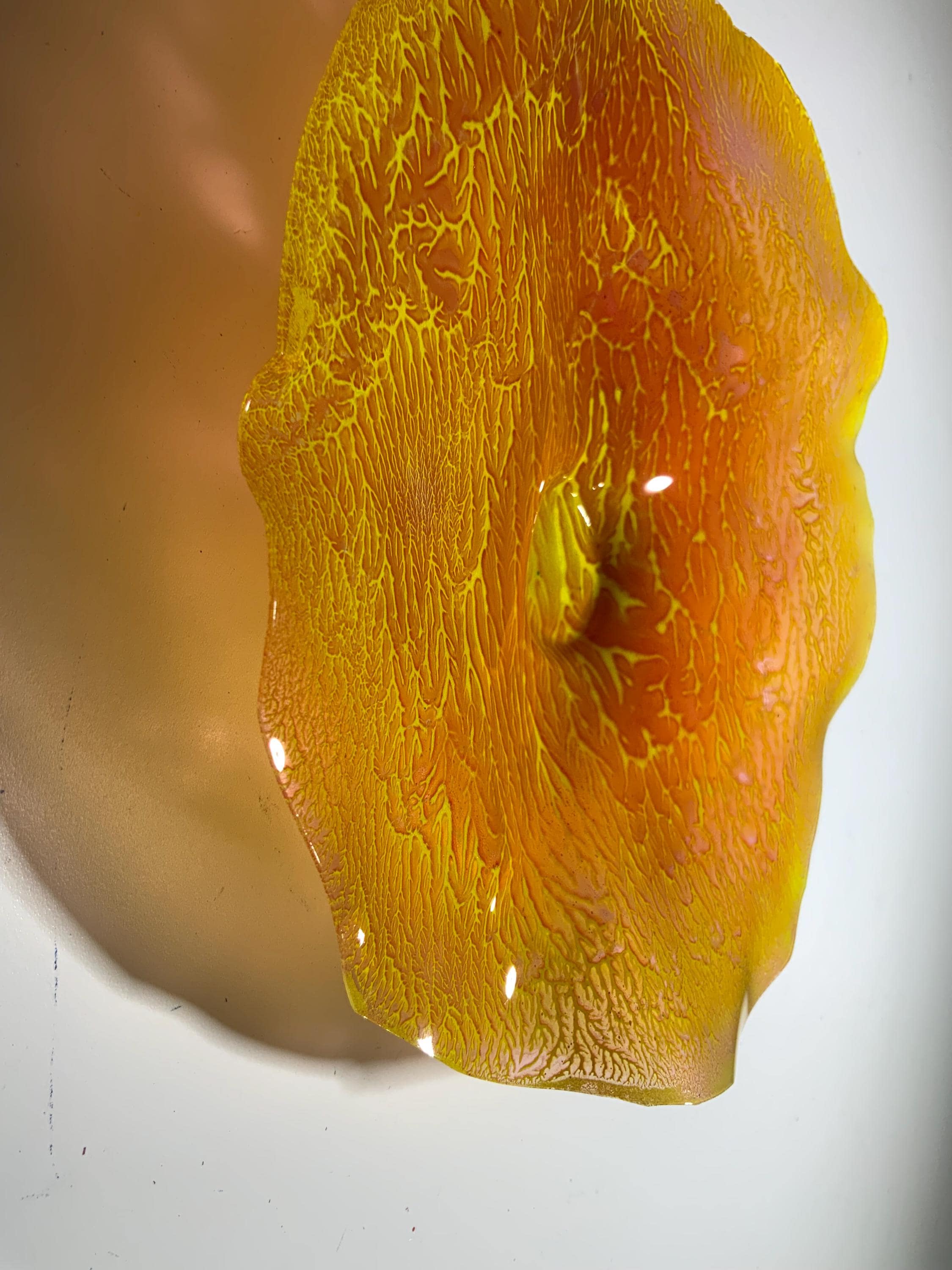 Eye catching wall flower brilliant colorful blend of orange and yellow. The light filters through casting a colorful glow to the hanging surface.