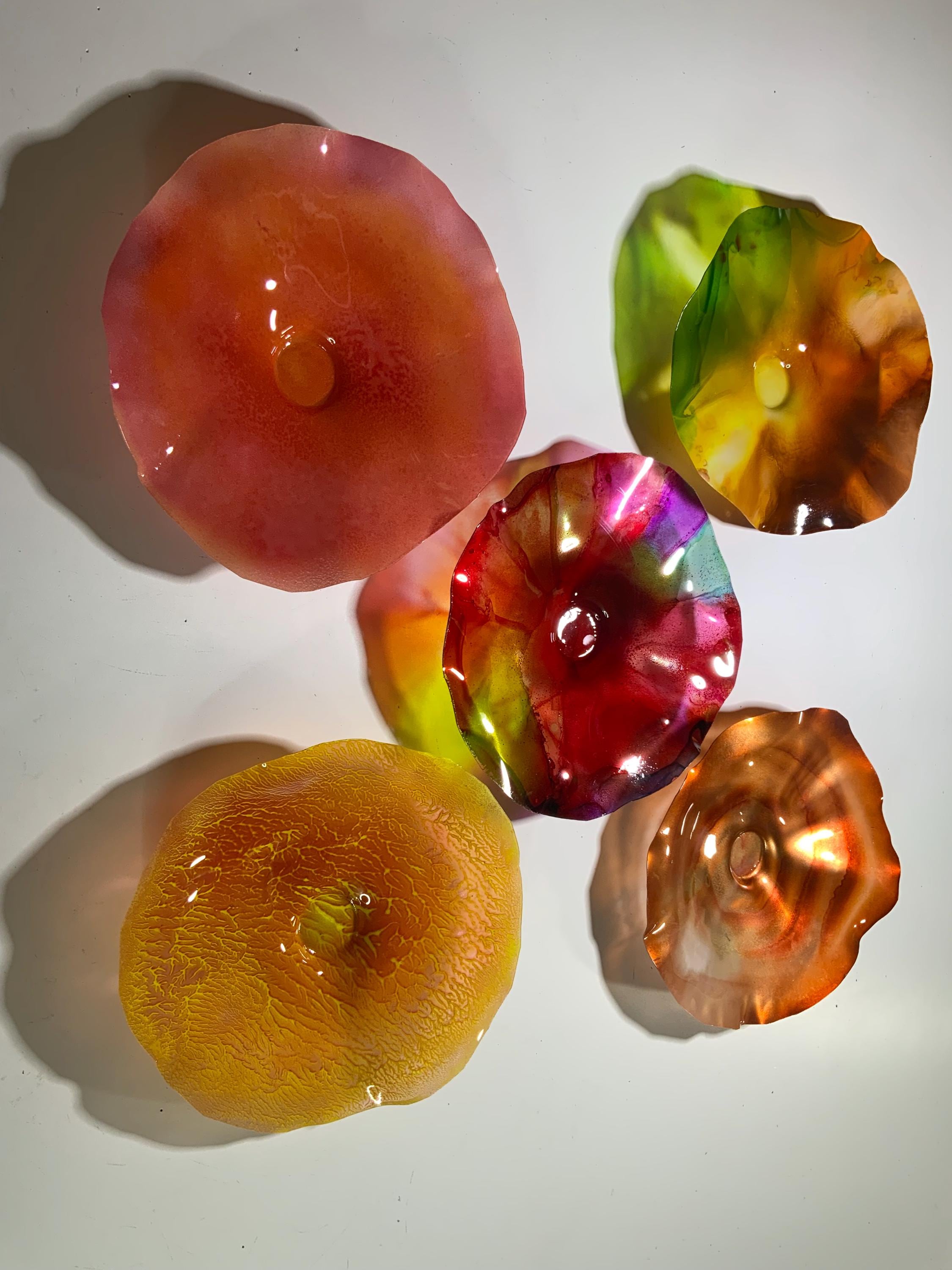 Each collectible piece is unique, no two are alike. This permanent, colorful, eye catching art looks and feels like glass. It shimmers in the light resembling water. They are very DURABLE AND LIGHTWEIGHT. These flowers are easy to hang, are all weather and UV resistant. Great for indoor or outdoor decorating.