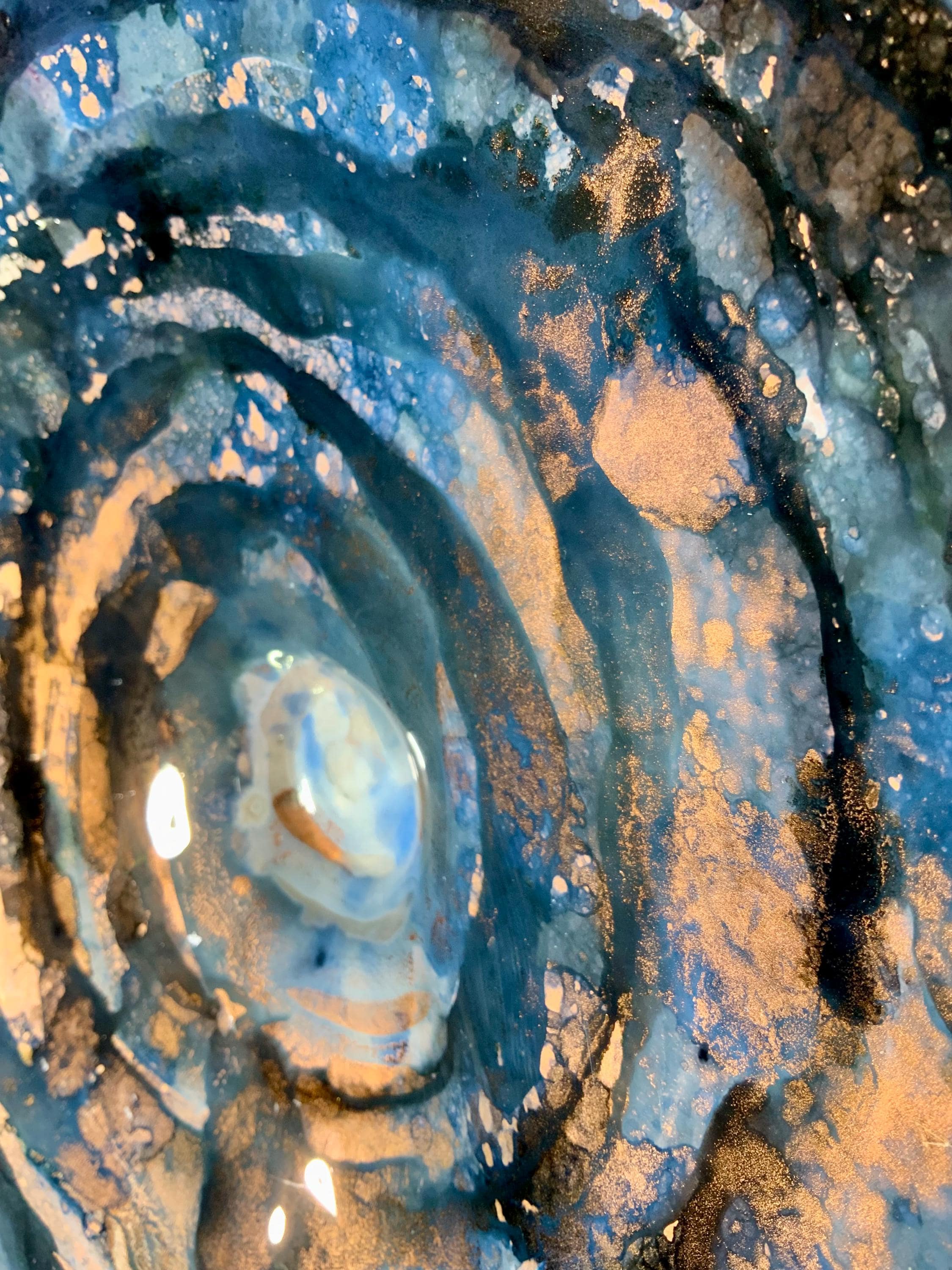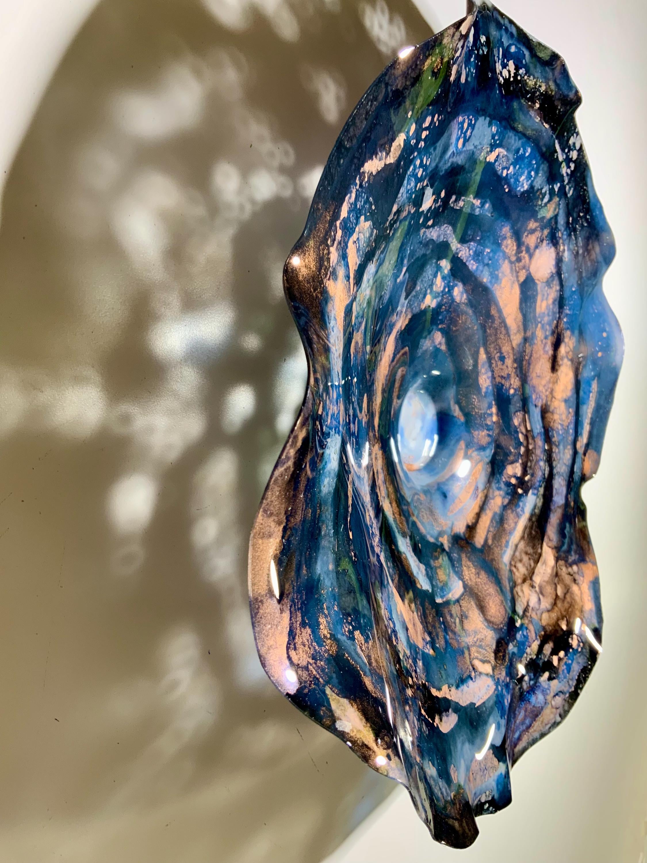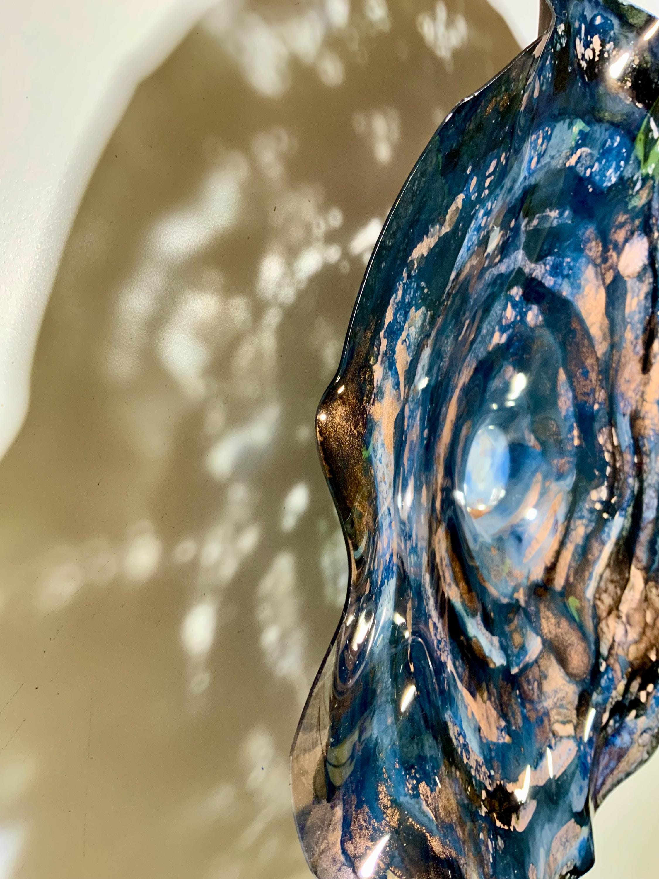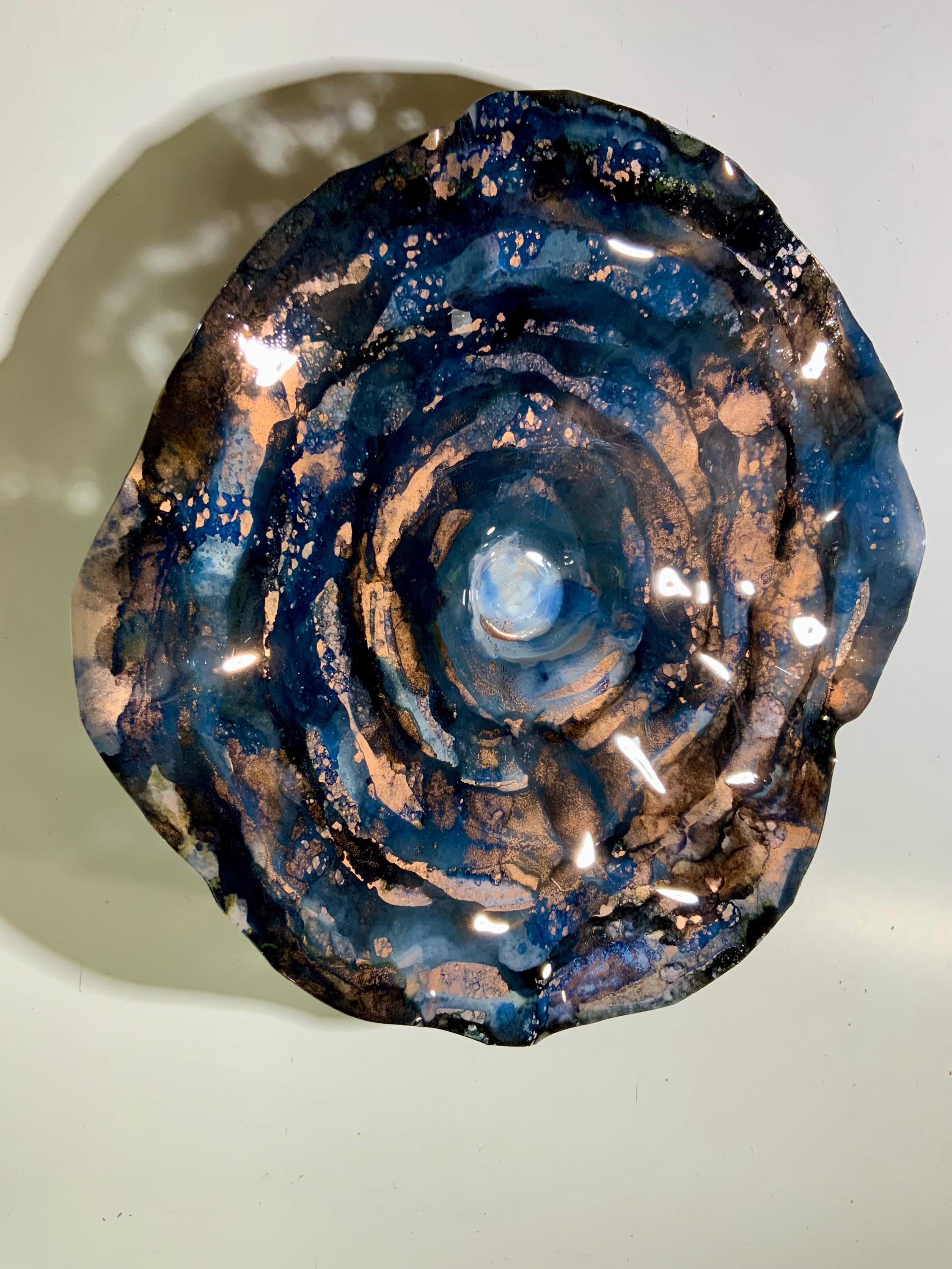 Radiant wall flower vibrant one of a kind black and copper blend. The light filters through casting a colorful glow to the hanging surface.