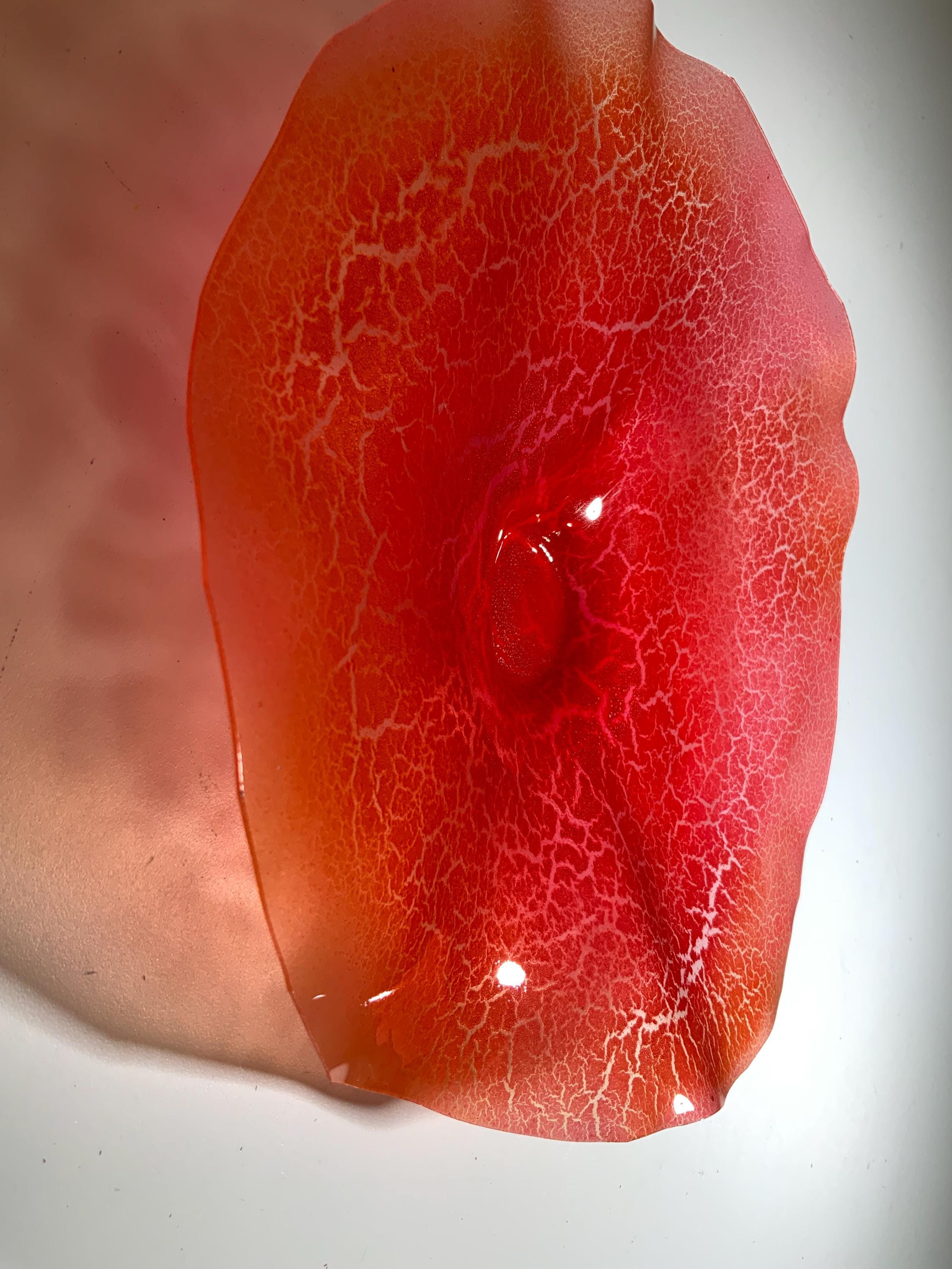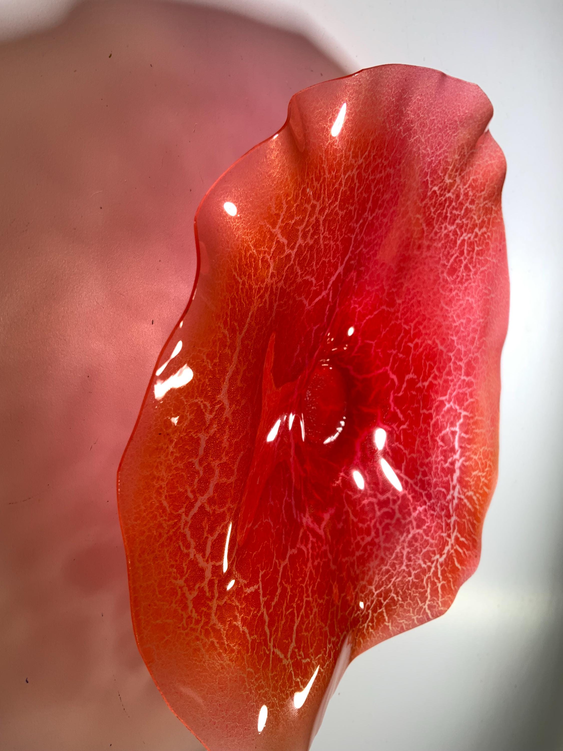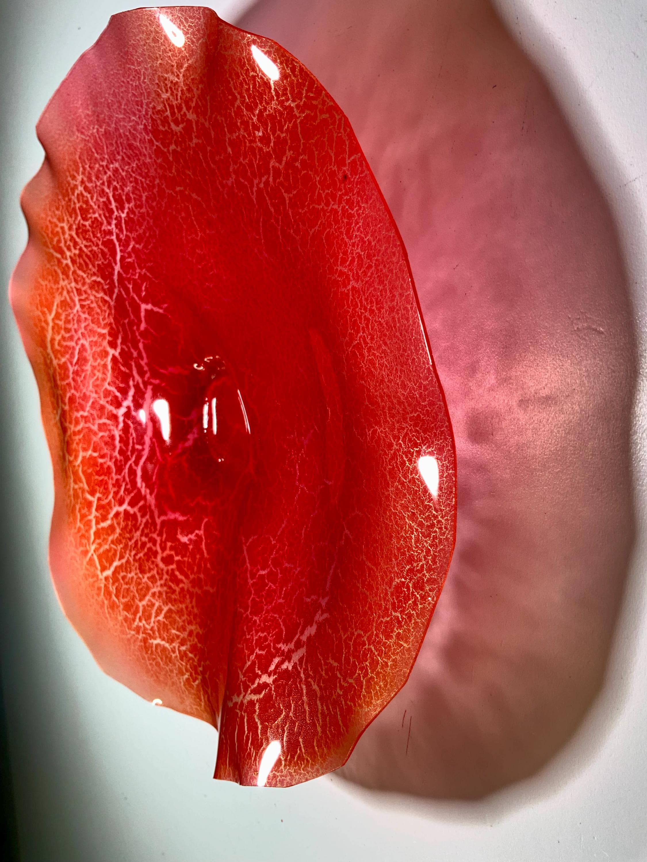 Each collectible piece is unique, no two are alike. This permanent, colorful, eye catching art looks and feels like glass. It shimmers in the light resembling water. They are very DURABLE AND LIGHTWEIGHT. This flower is easy to hang all weather and UV resistant. Great for indoor or outdoor decorating.