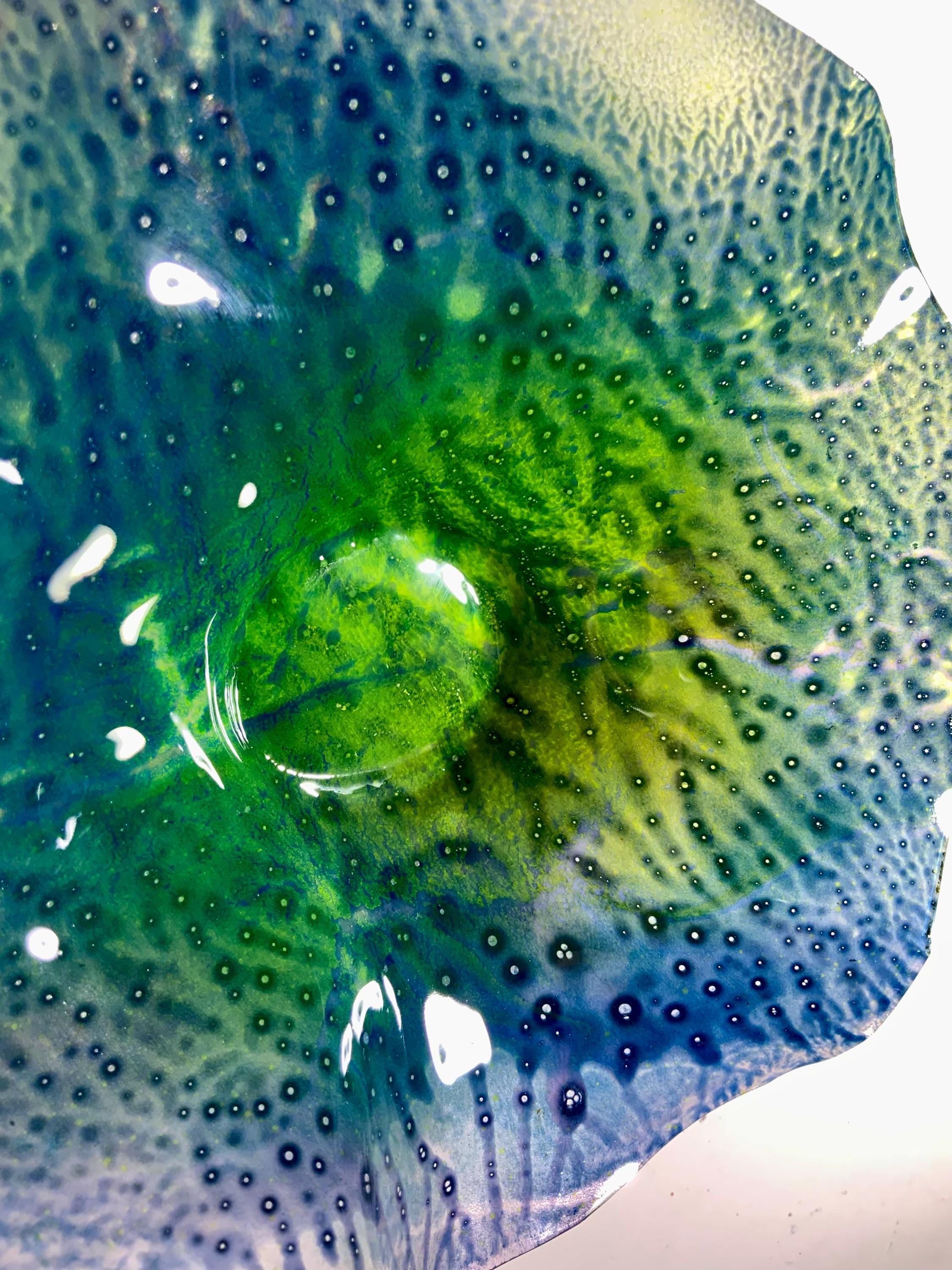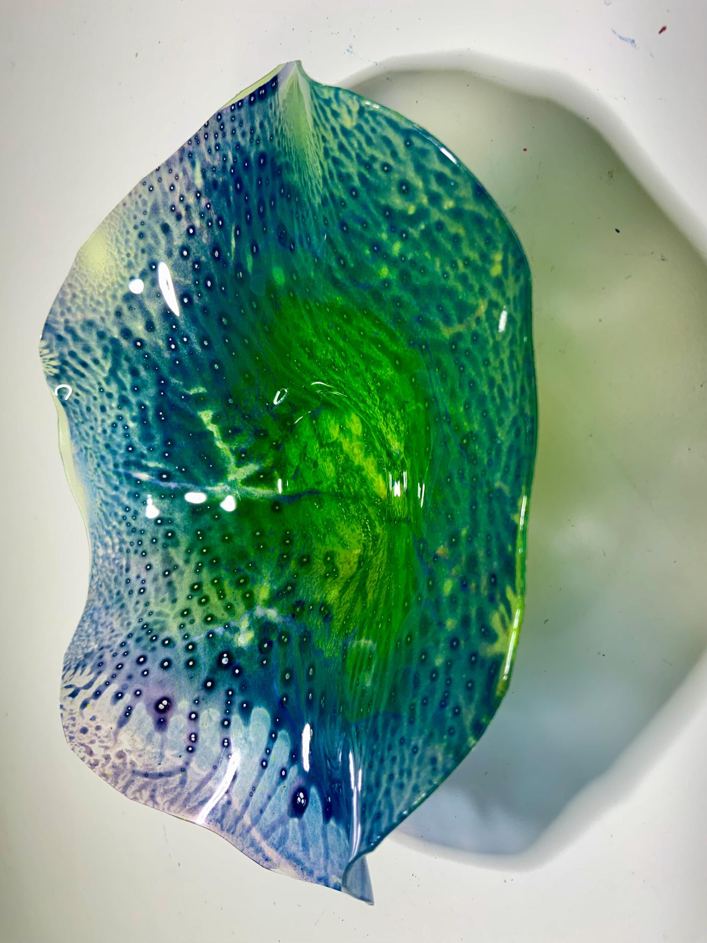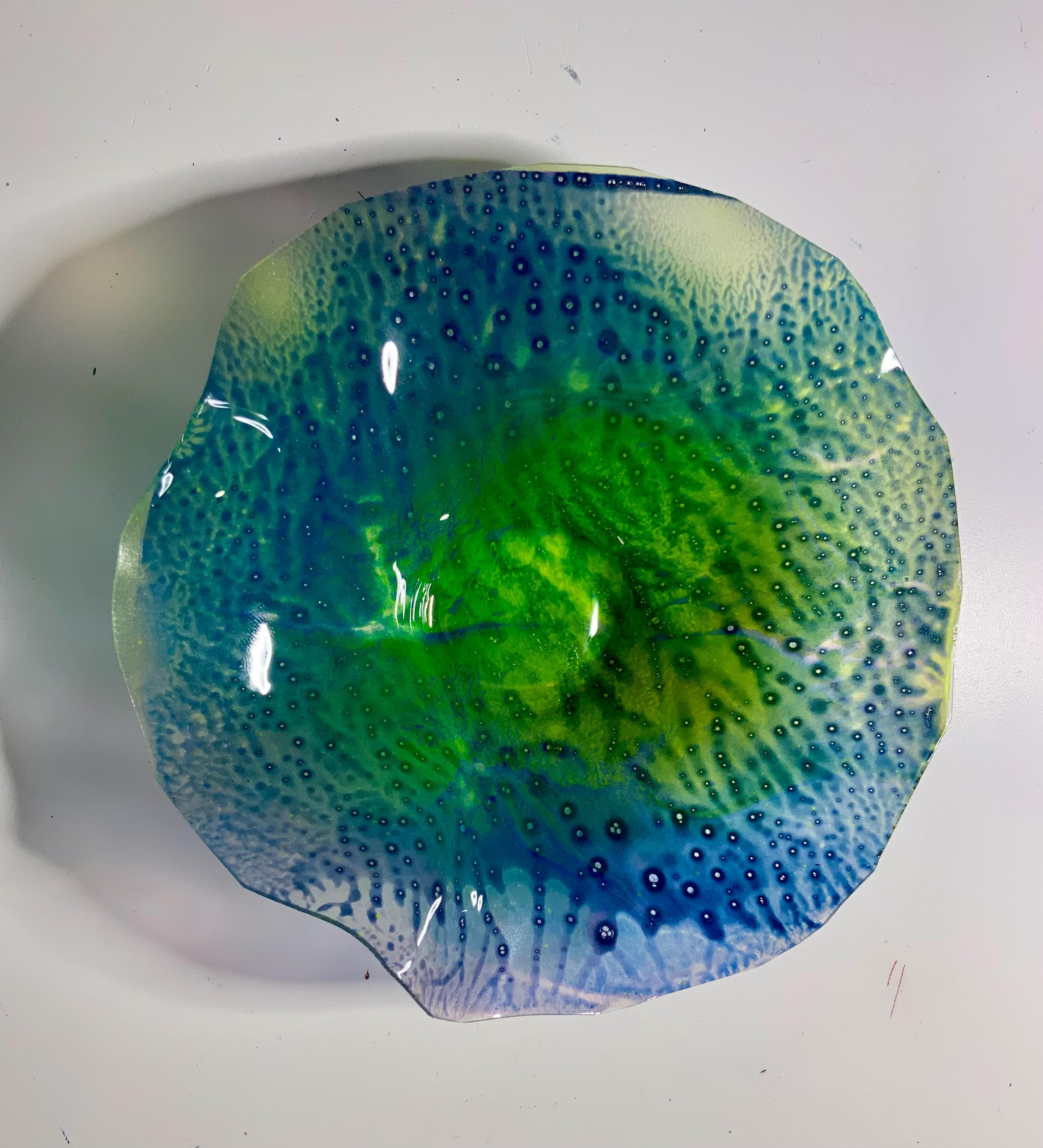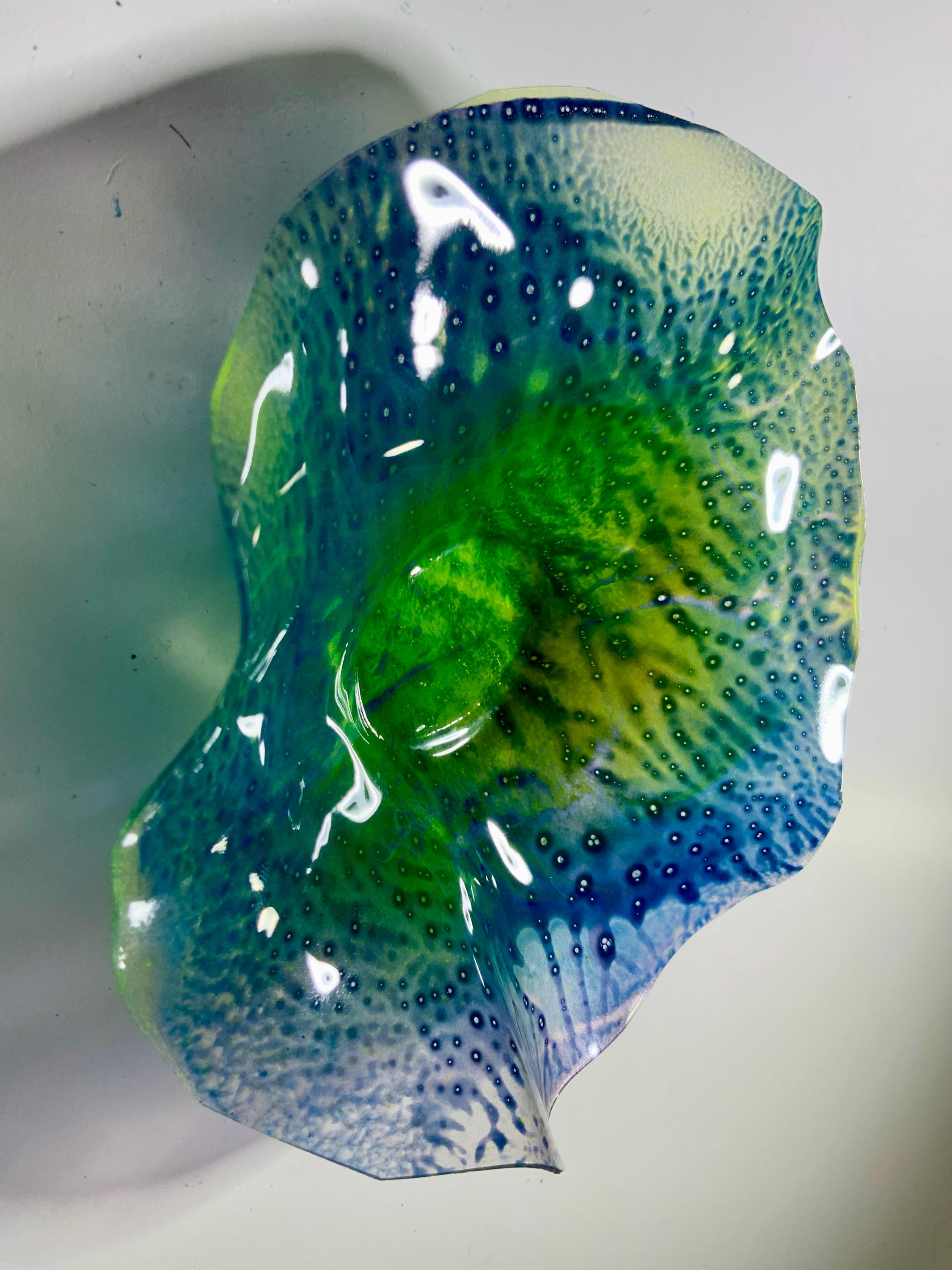 Extra Small wall flower plate green/blue 5” handmade up cycled plastic/beach home decor indoor outdoor art/looks like glass