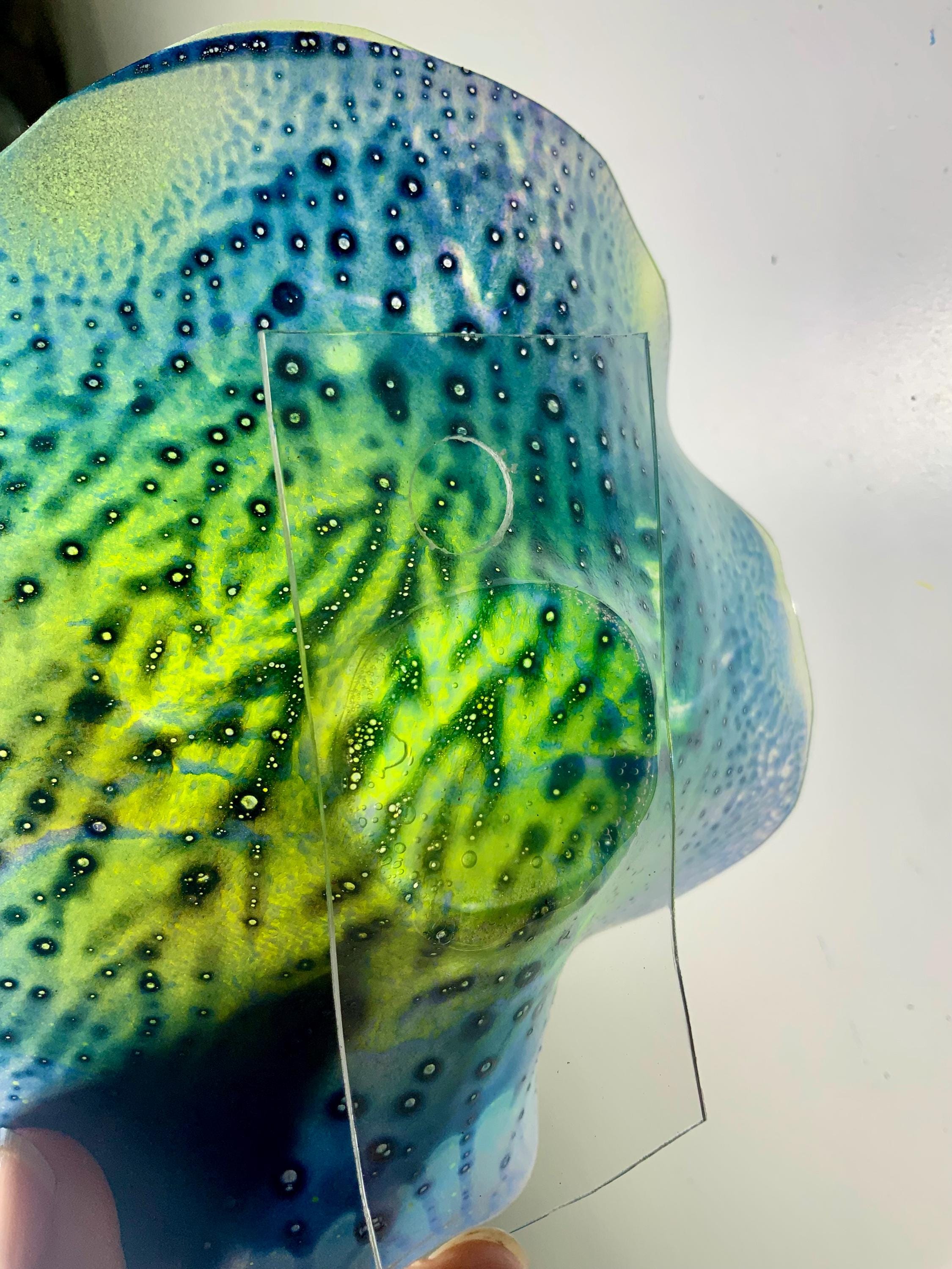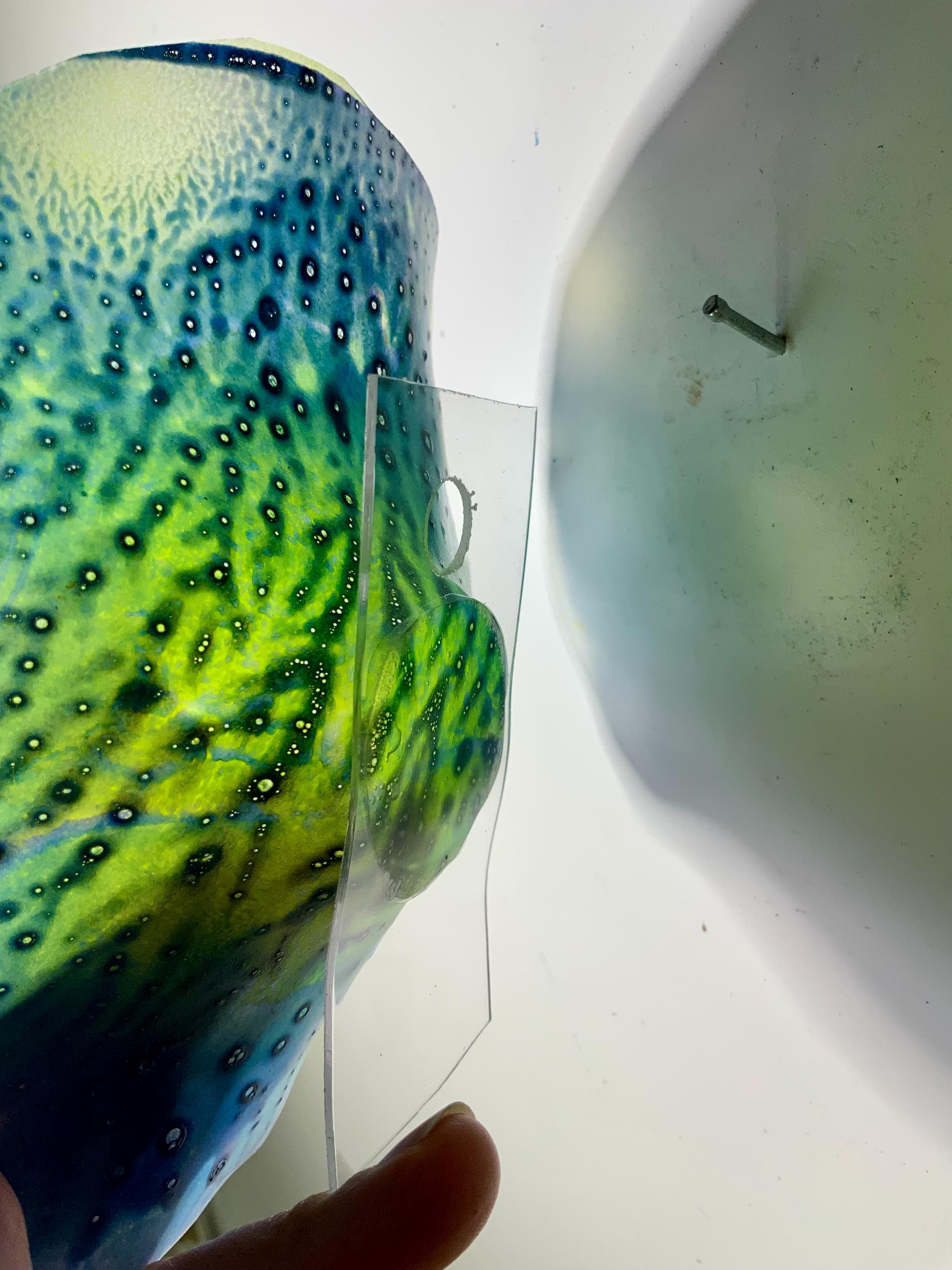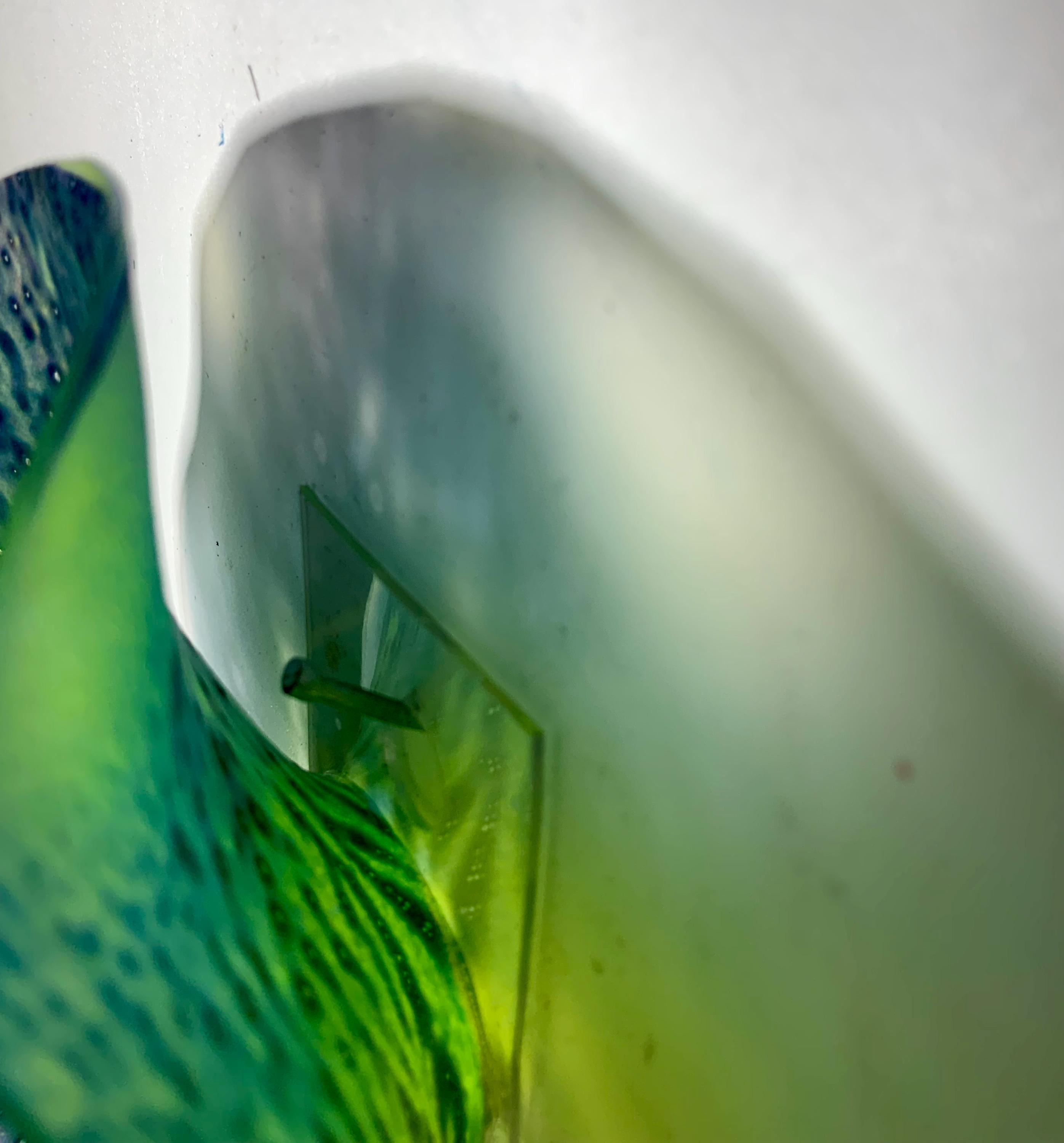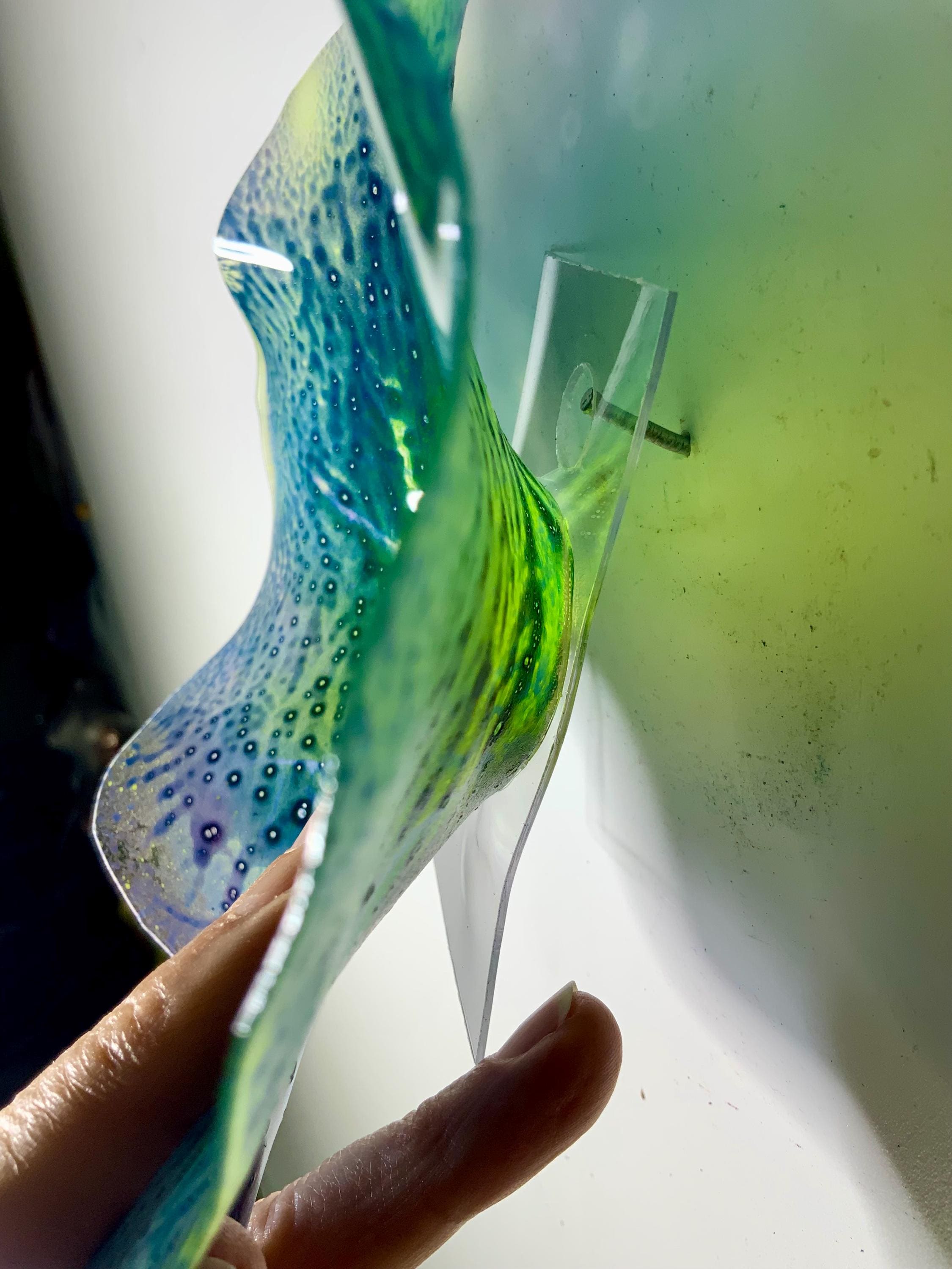 Extra Small wall flower plate green/blue 5” handmade up cycled plastic/beach home decor indoor outdoor art/looks like glass