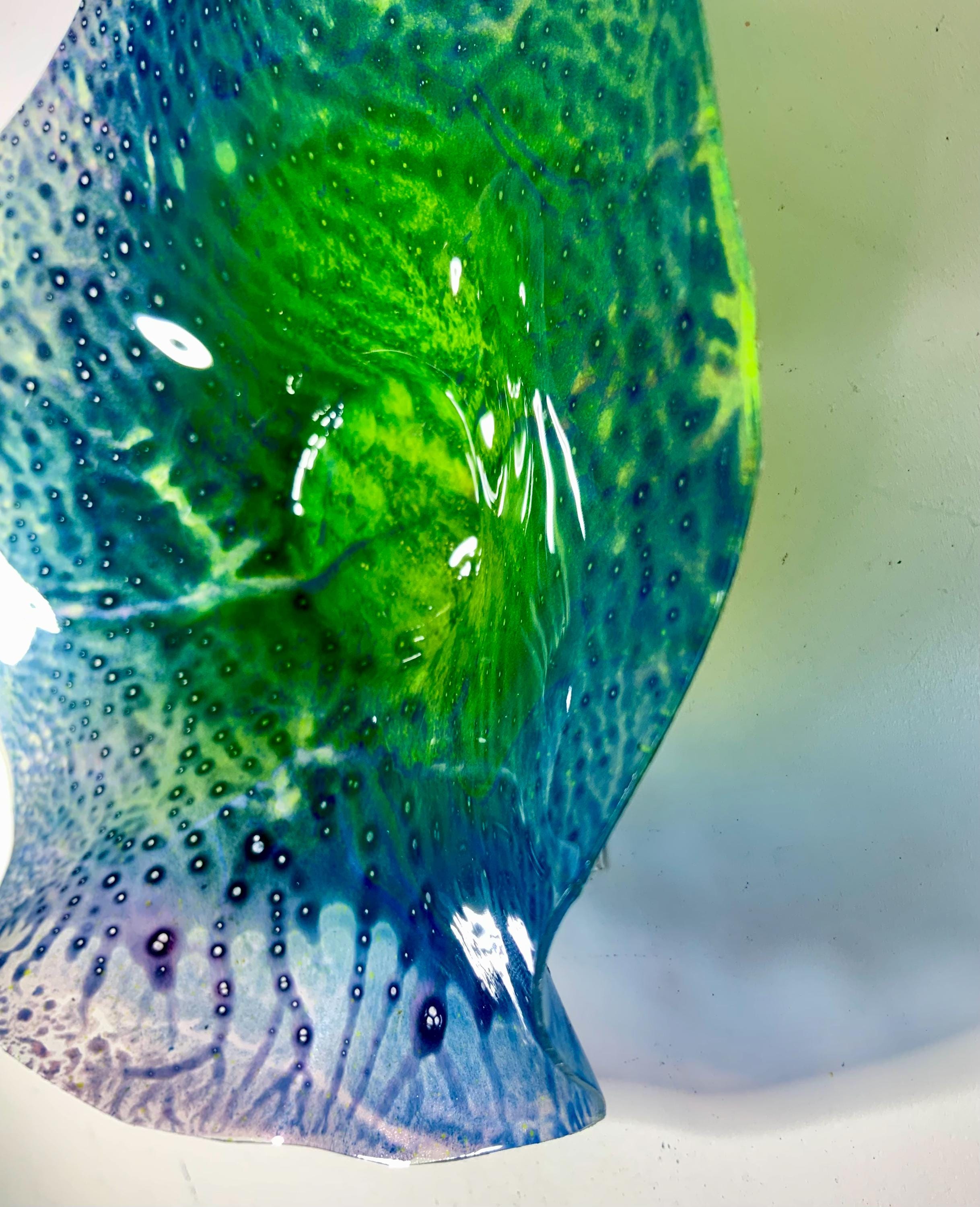 Radiant wall flower designer plate magnificent blue and green. The light filters through casting a colorful glow to the hanging surface.