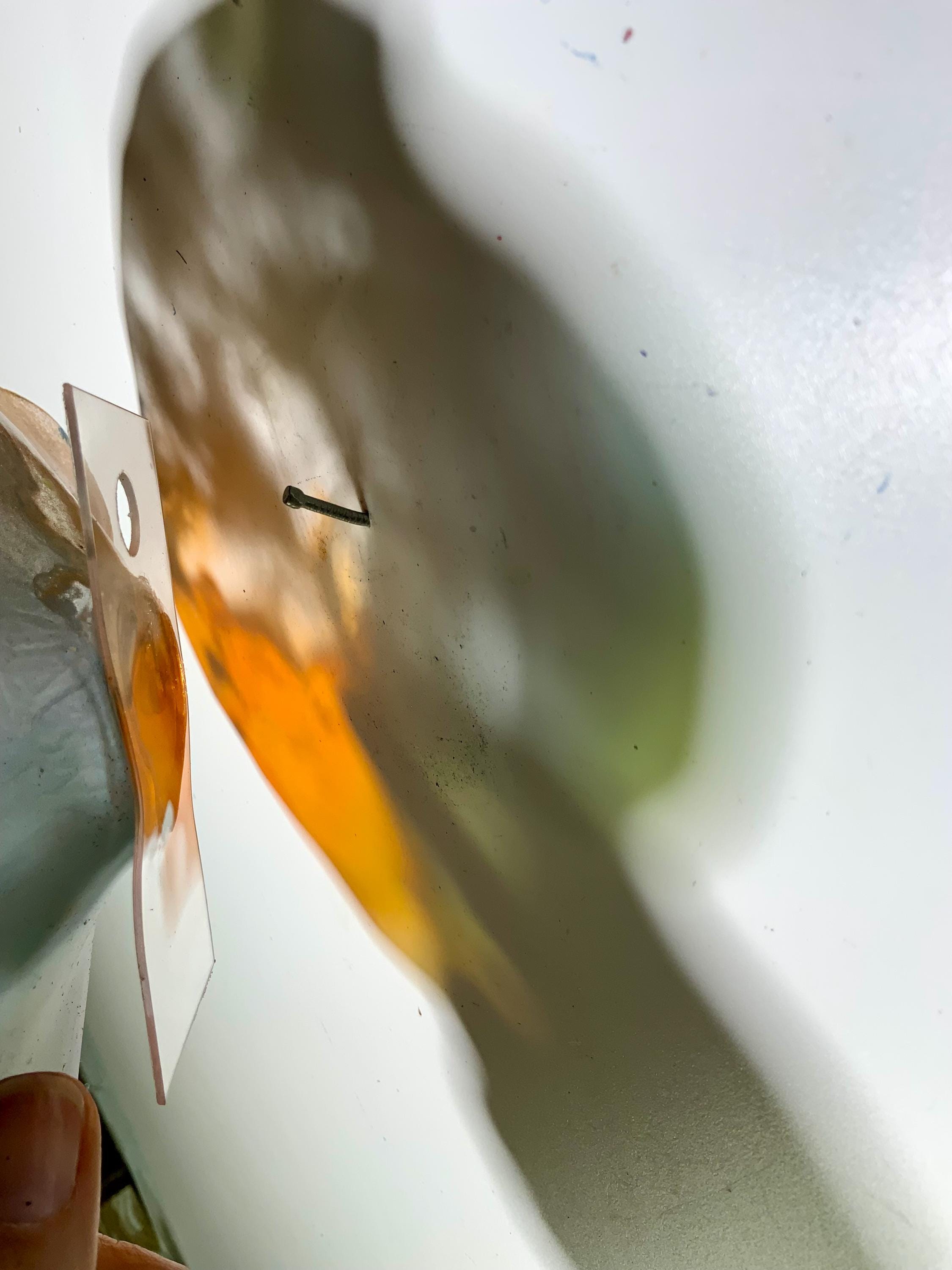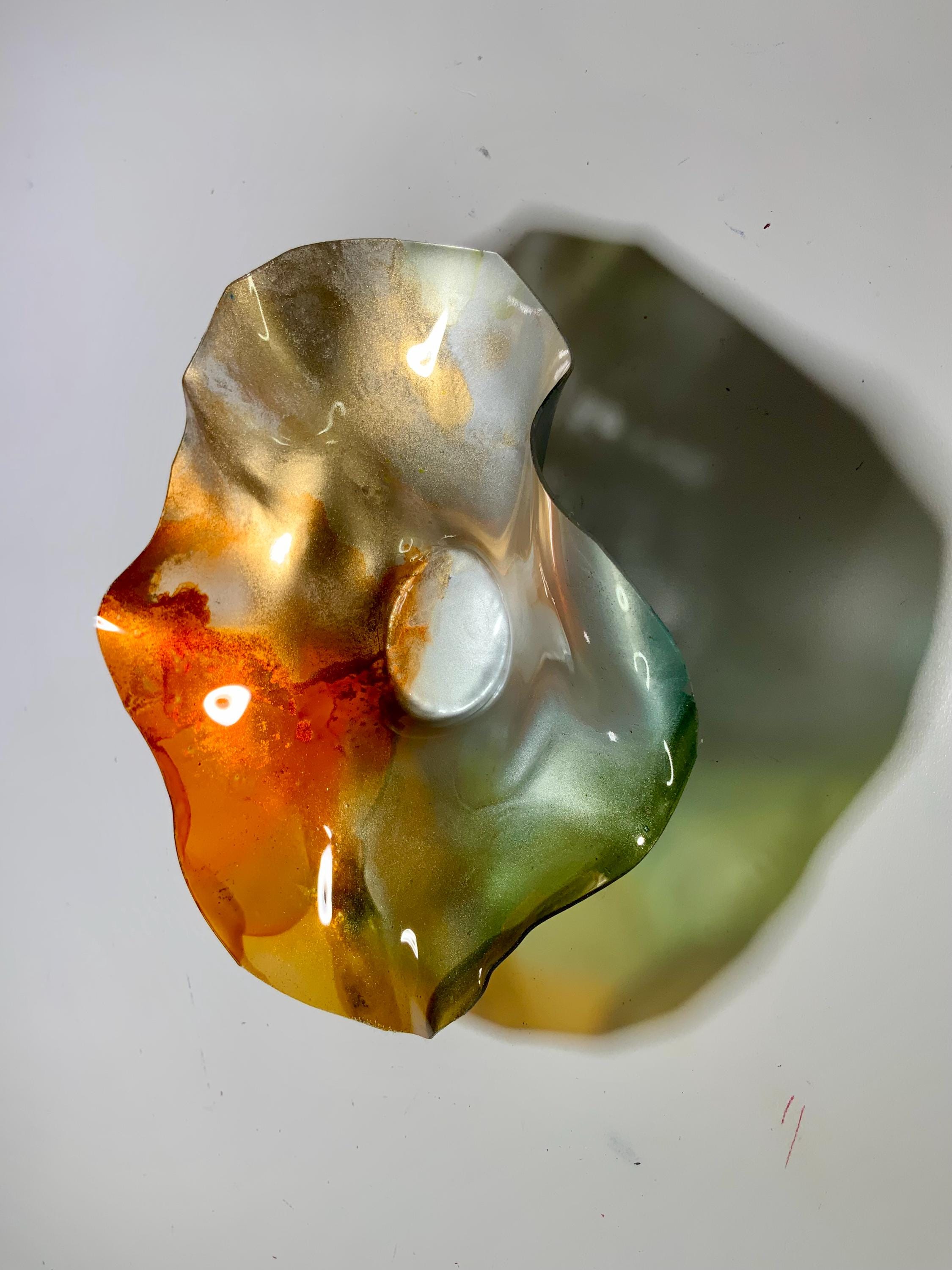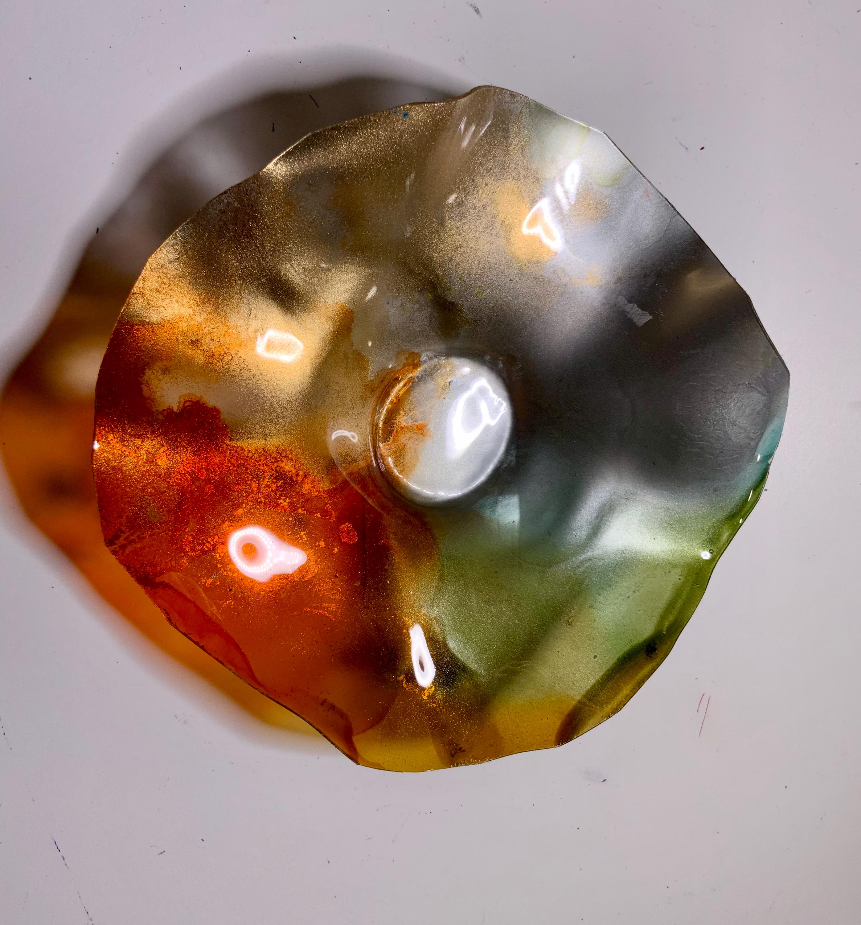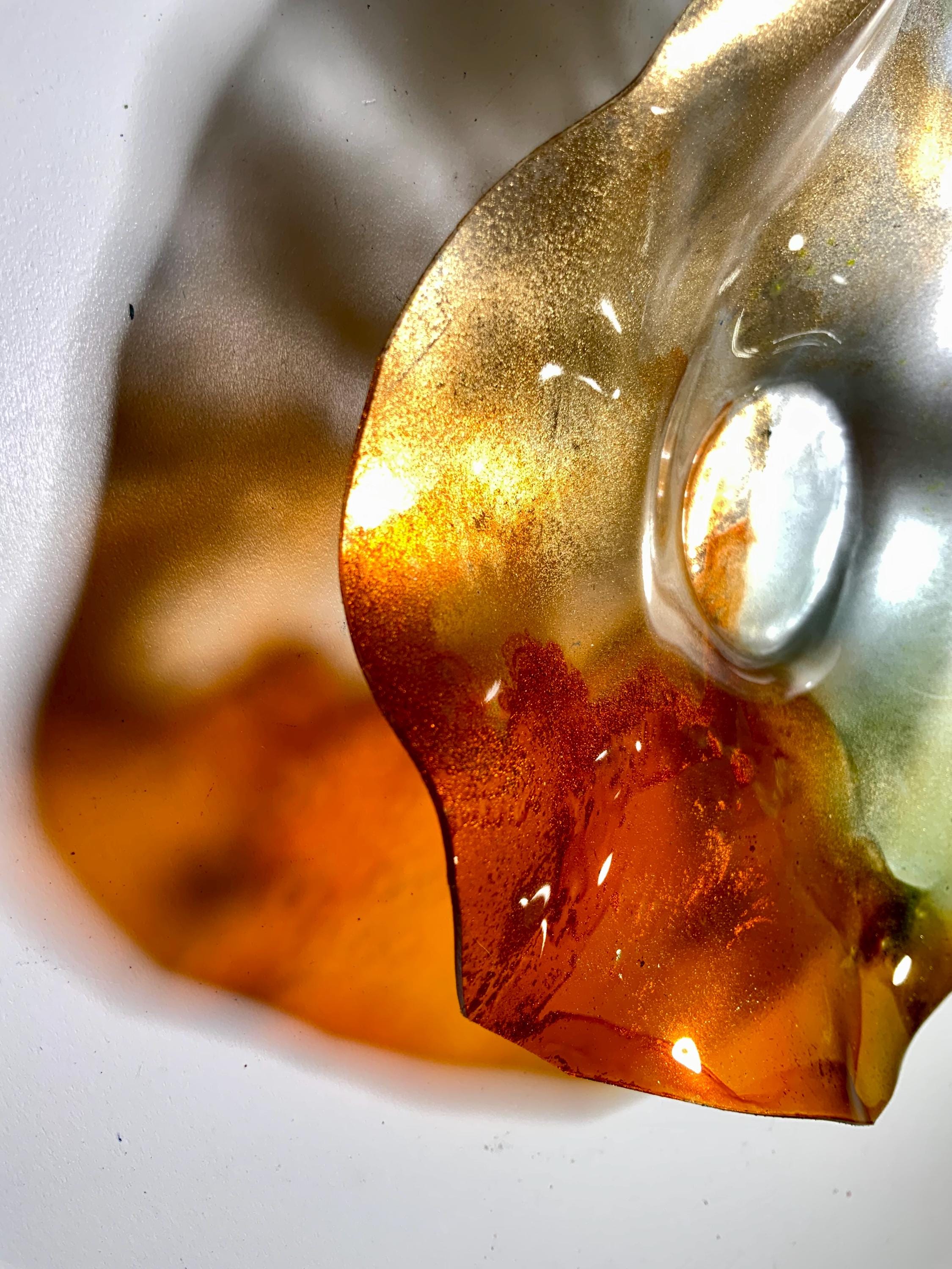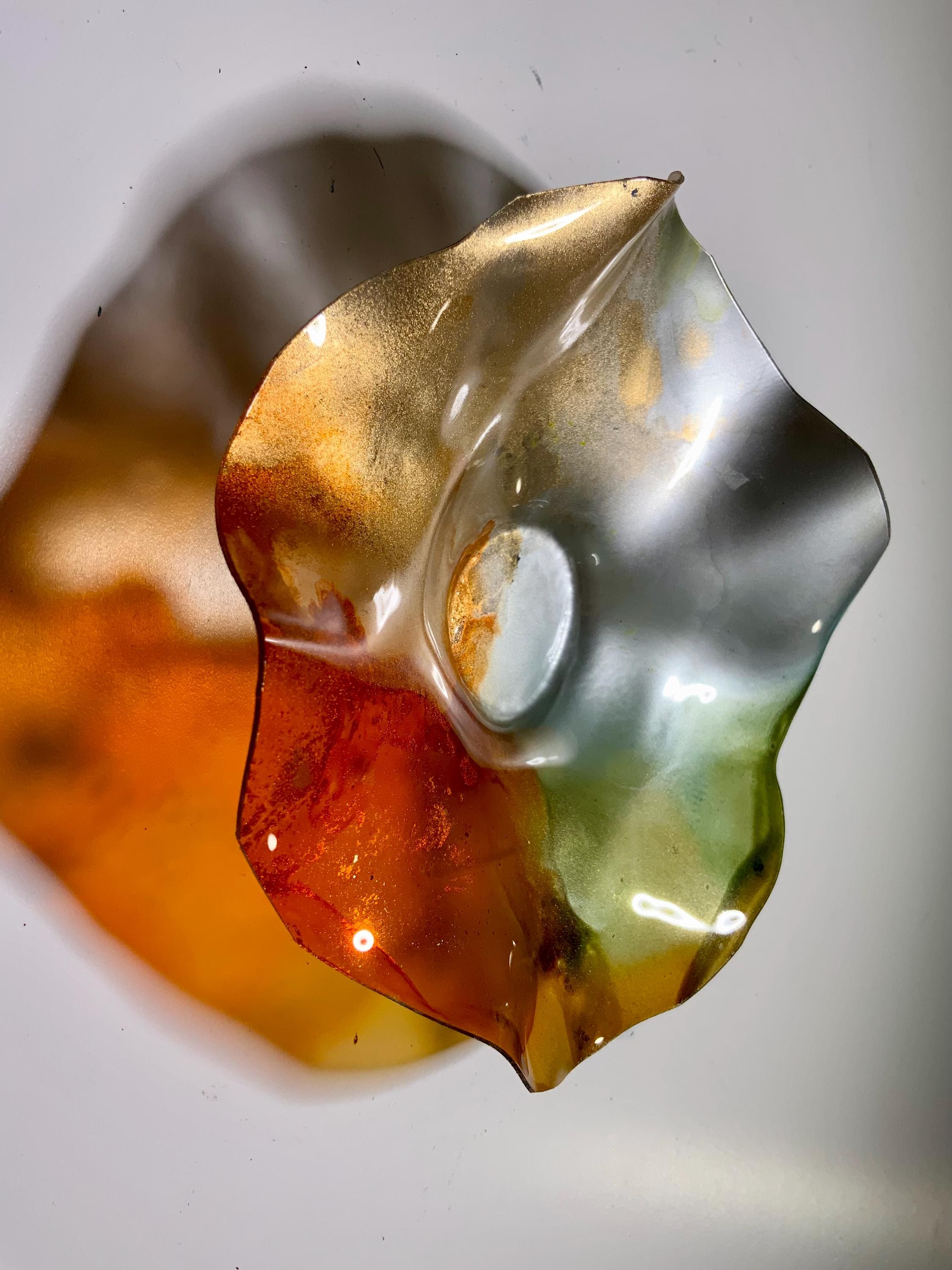 Eye catching wall flower lovely orange with gold and silver blend. The light filters through casting a colorful glow to the hanging surface.
