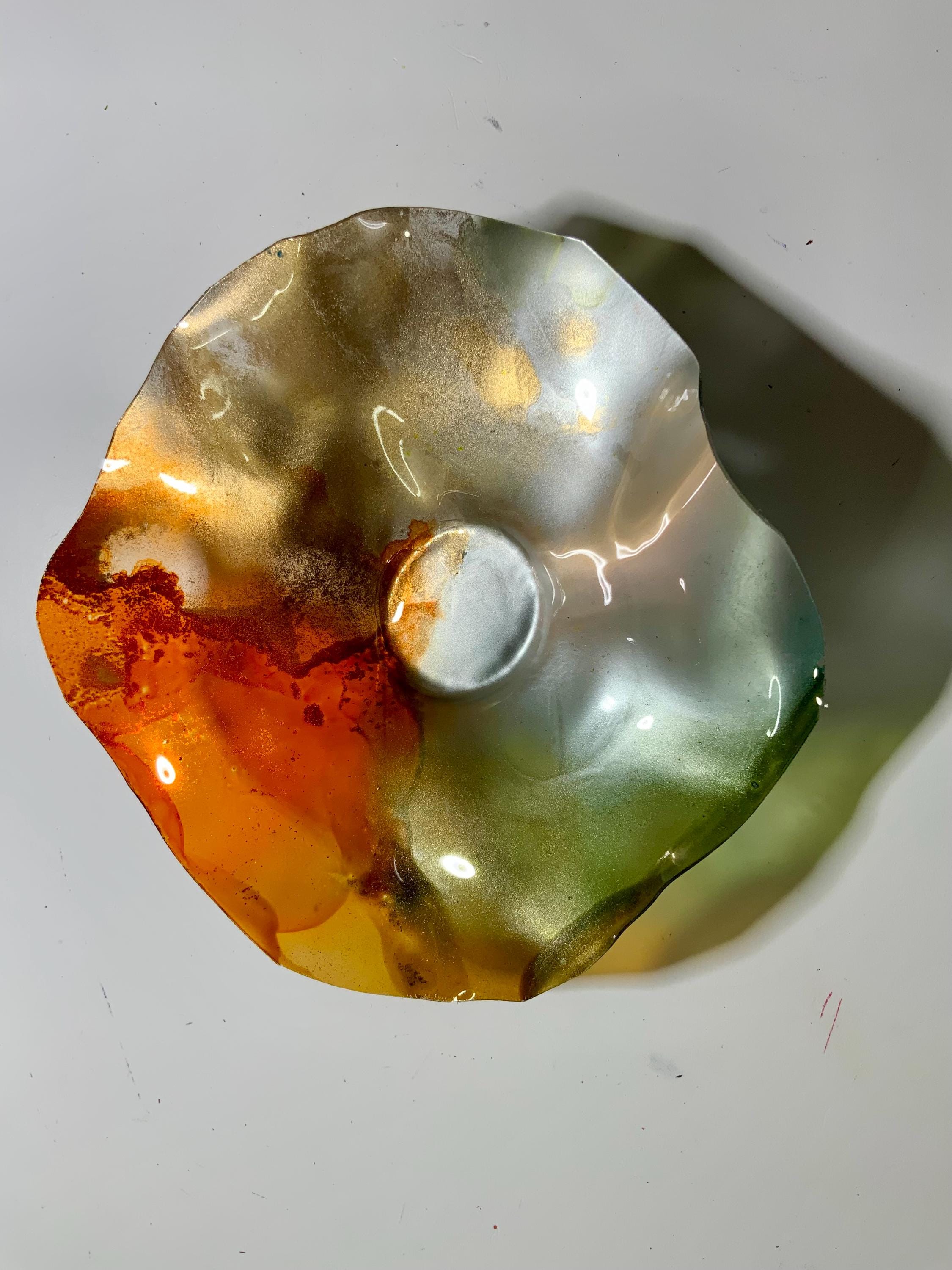 Orange/silver/gold Handmade Wall flower hanging/home decor recycled plastic extra small 5” looks like glass/ patio wall art