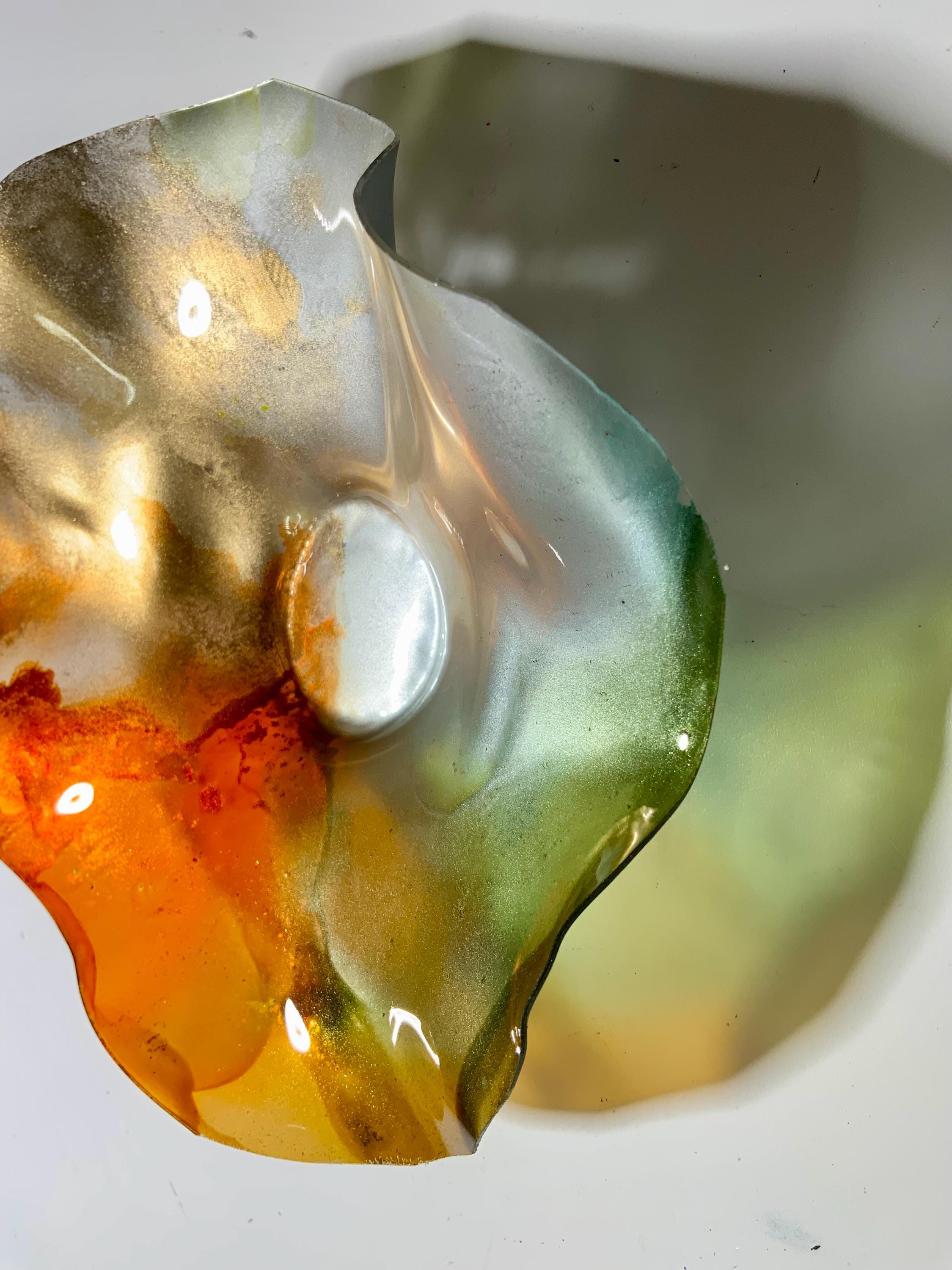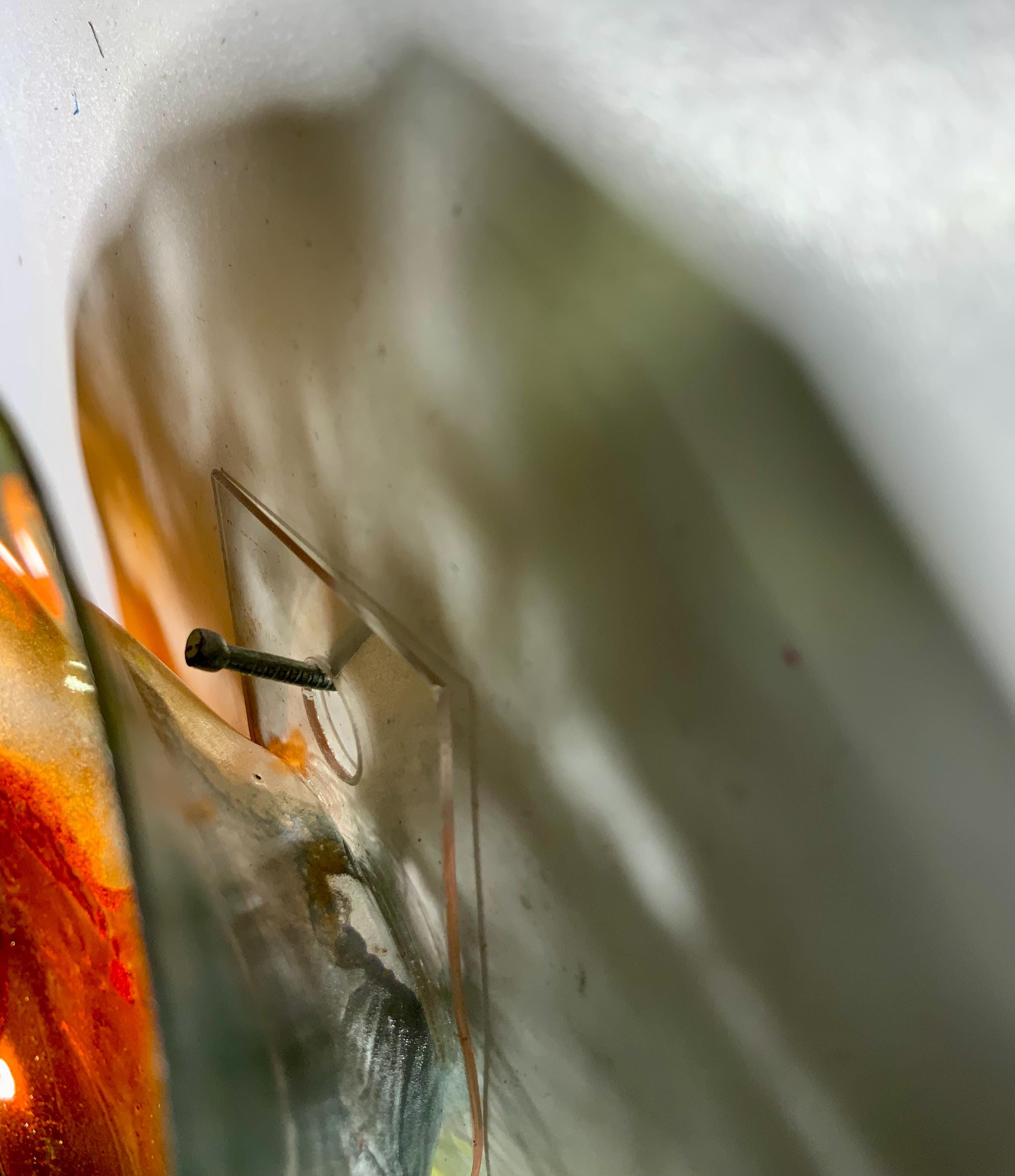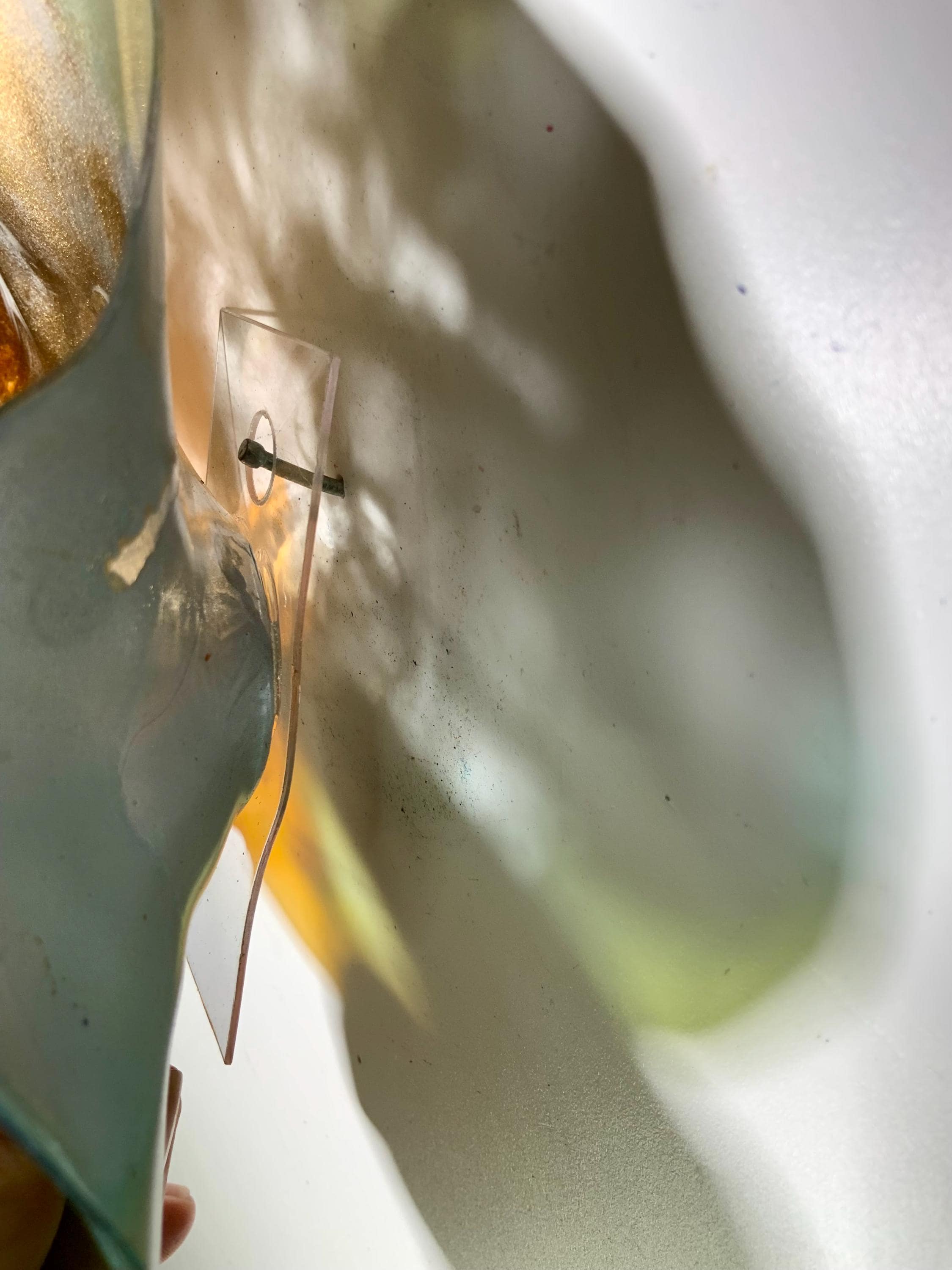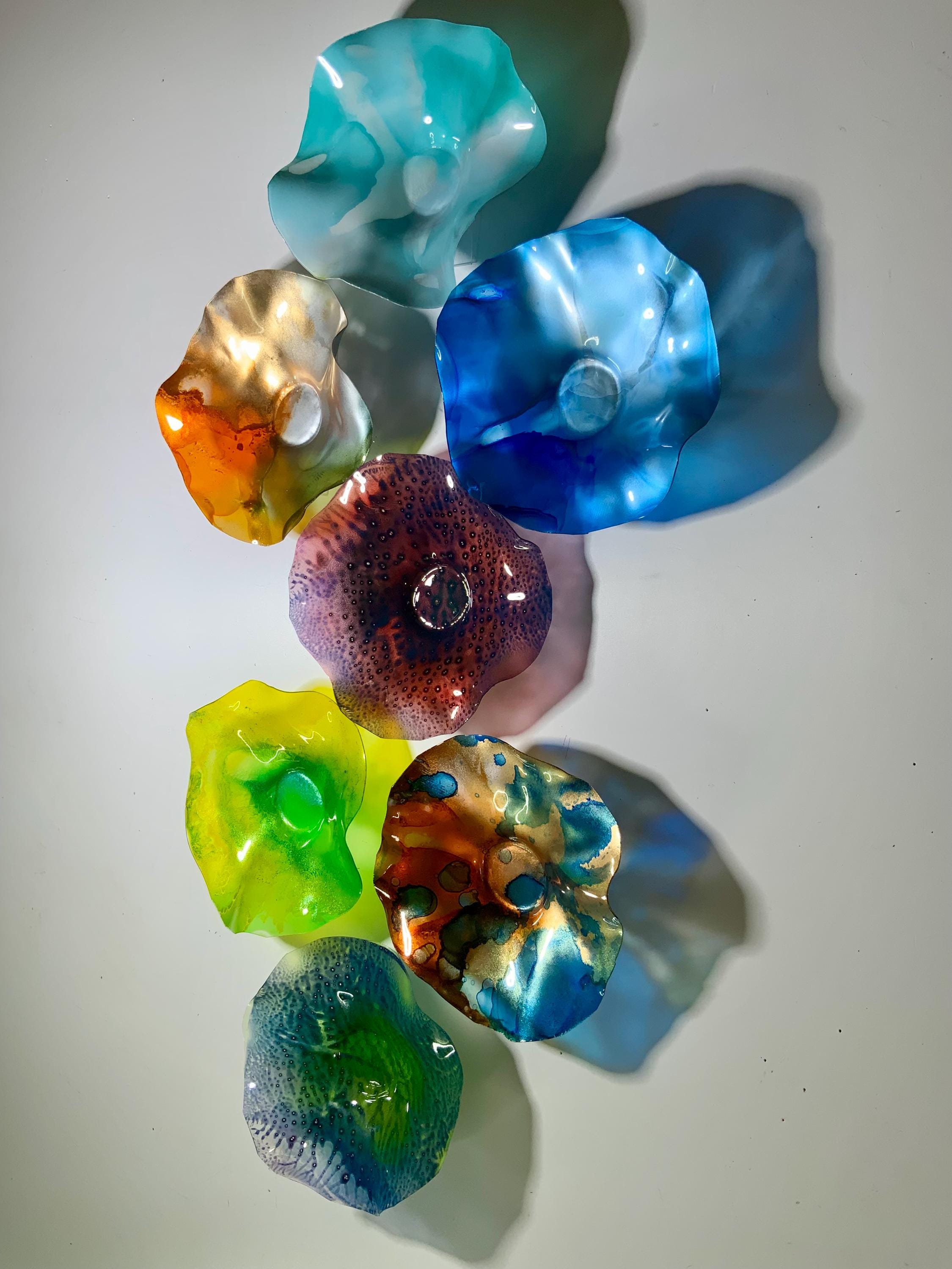 Each collectible piece is unique, no two are alike. This permanent, colorful, eye catching art looks and feels like glass. It shimmers in the light resembling water. They are very DURABLE AND LIGHTWEIGHT. These flowers are easy to hang, are all weather and UV resistant. Great for indoor or outdoor decorating.