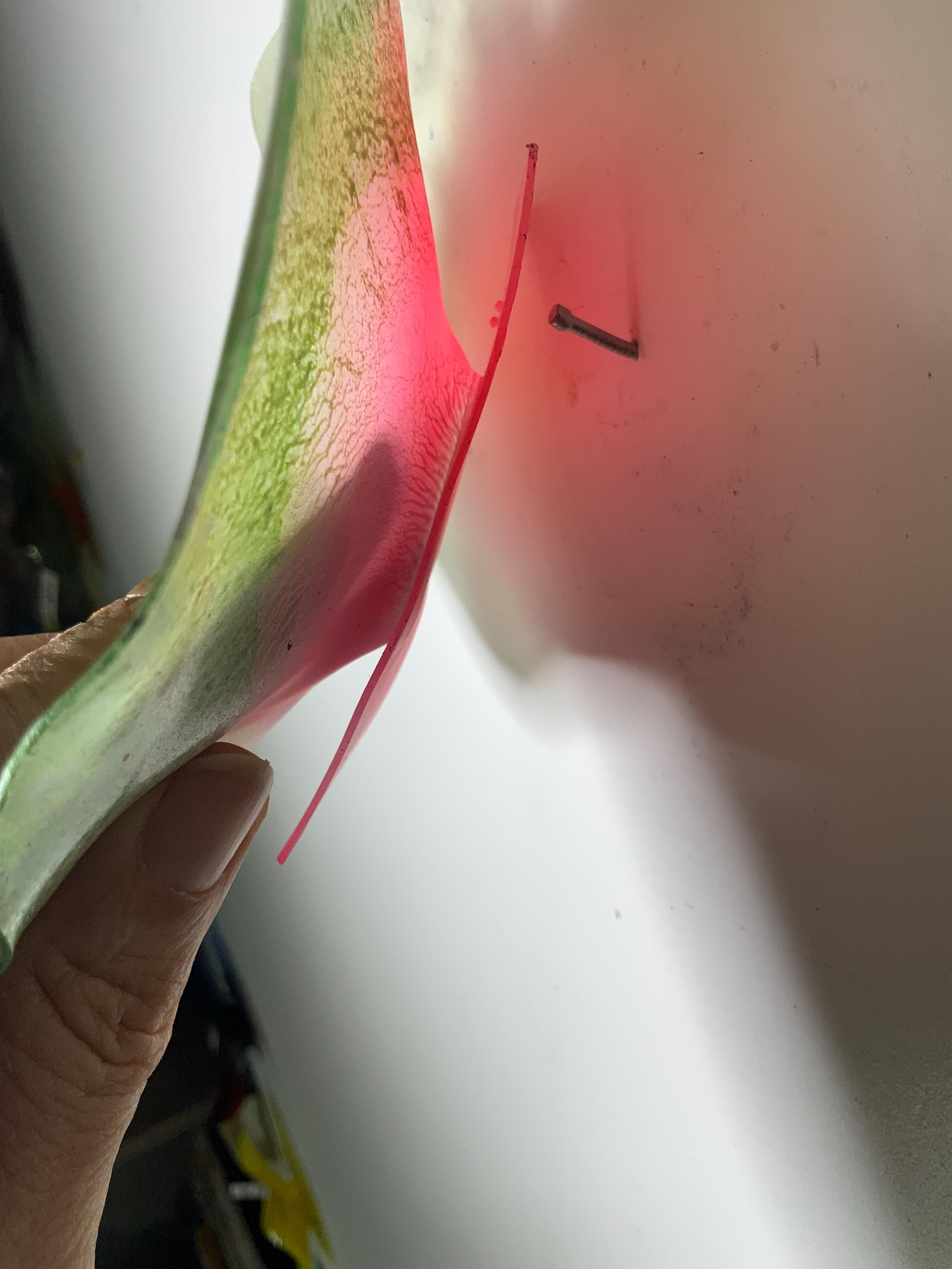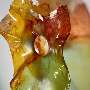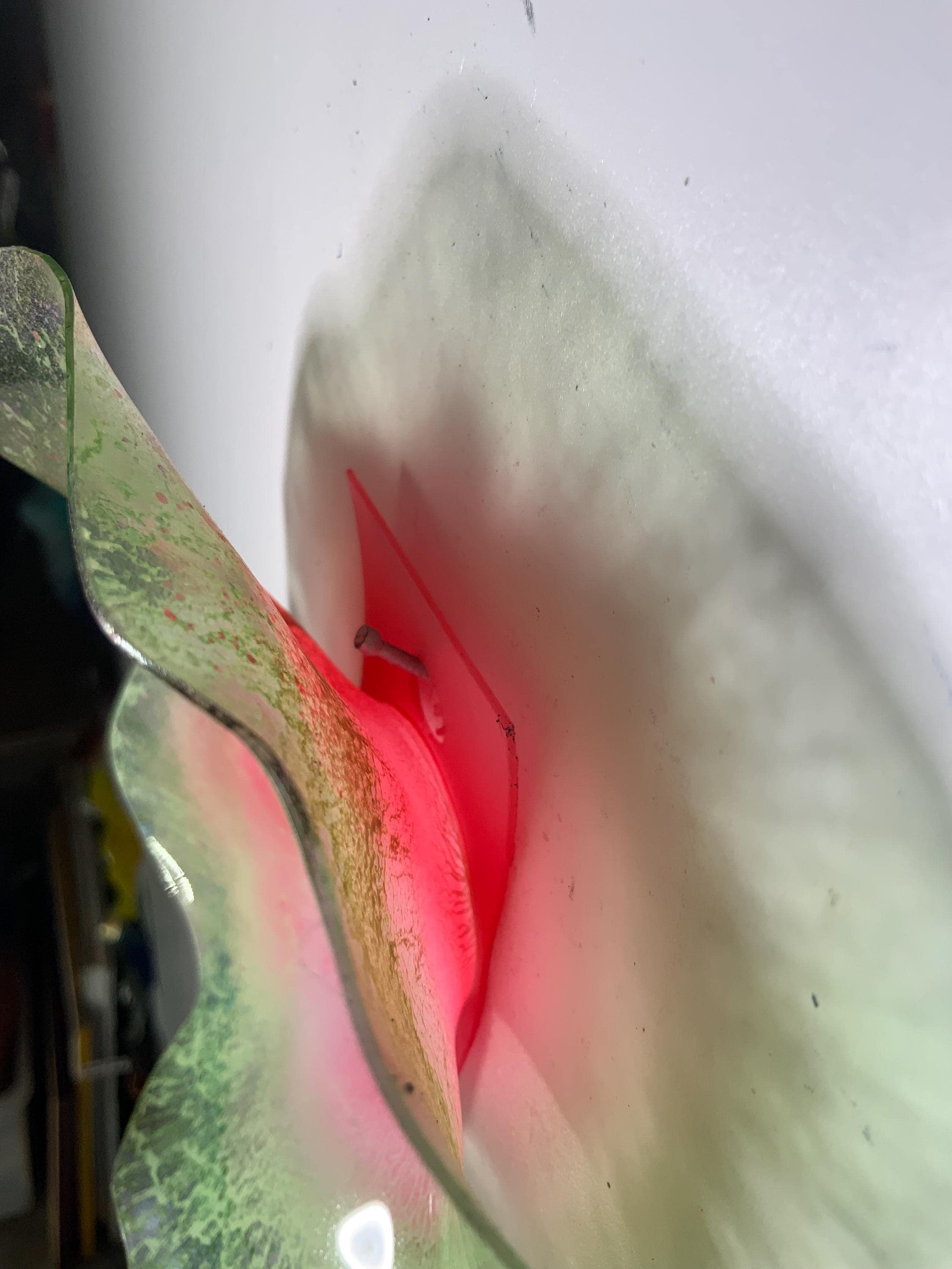 Each collectible piece is unique, no two are alike. This permanent, colorful, eye catching art looks and feels like glass. It shimmers in the light resembling water. They are very DURABLE AND LIGHTWEIGHT. This flower is easy to hang all weather and UV resistant. Great for indoor or outdoor decorating.