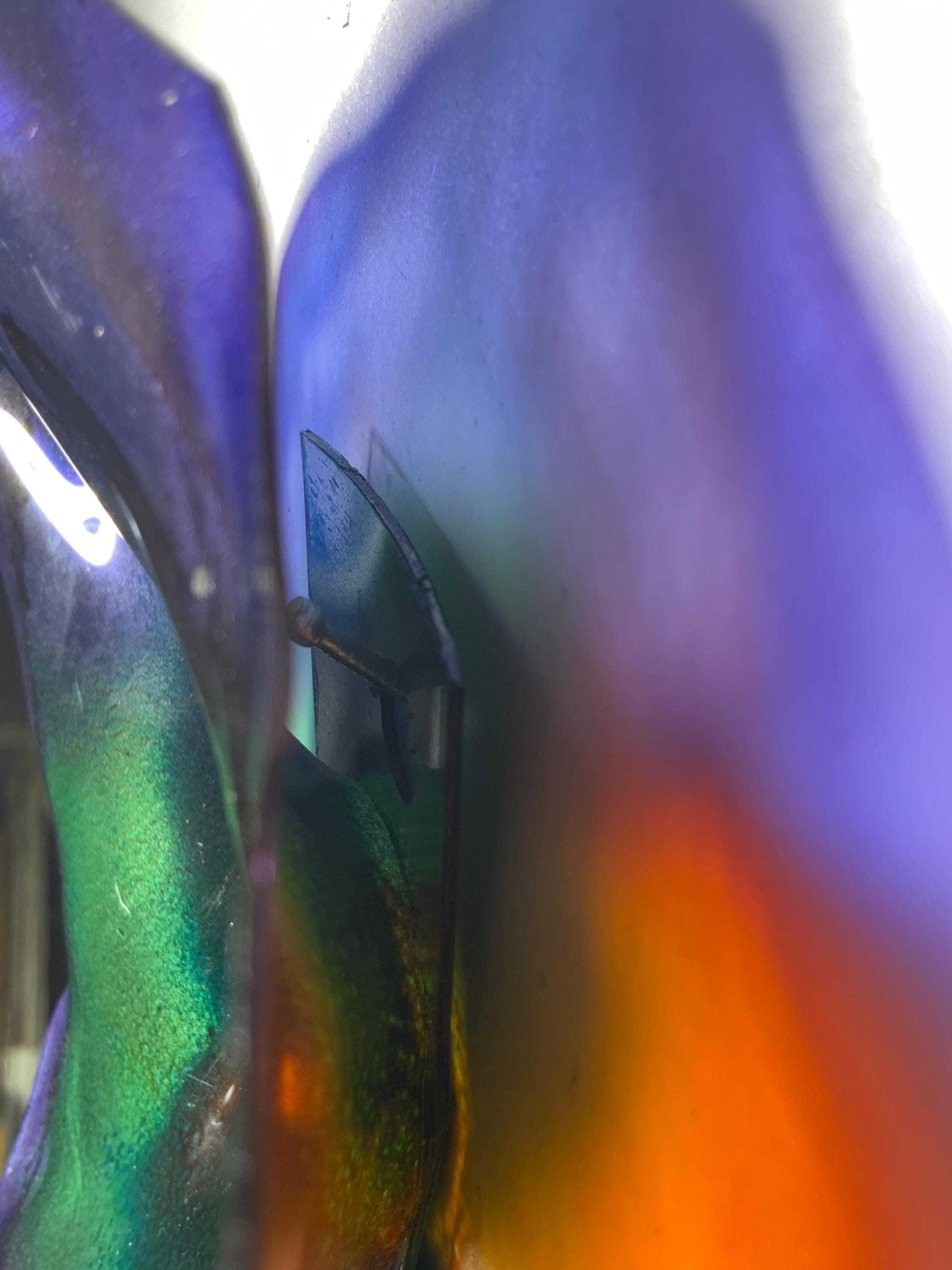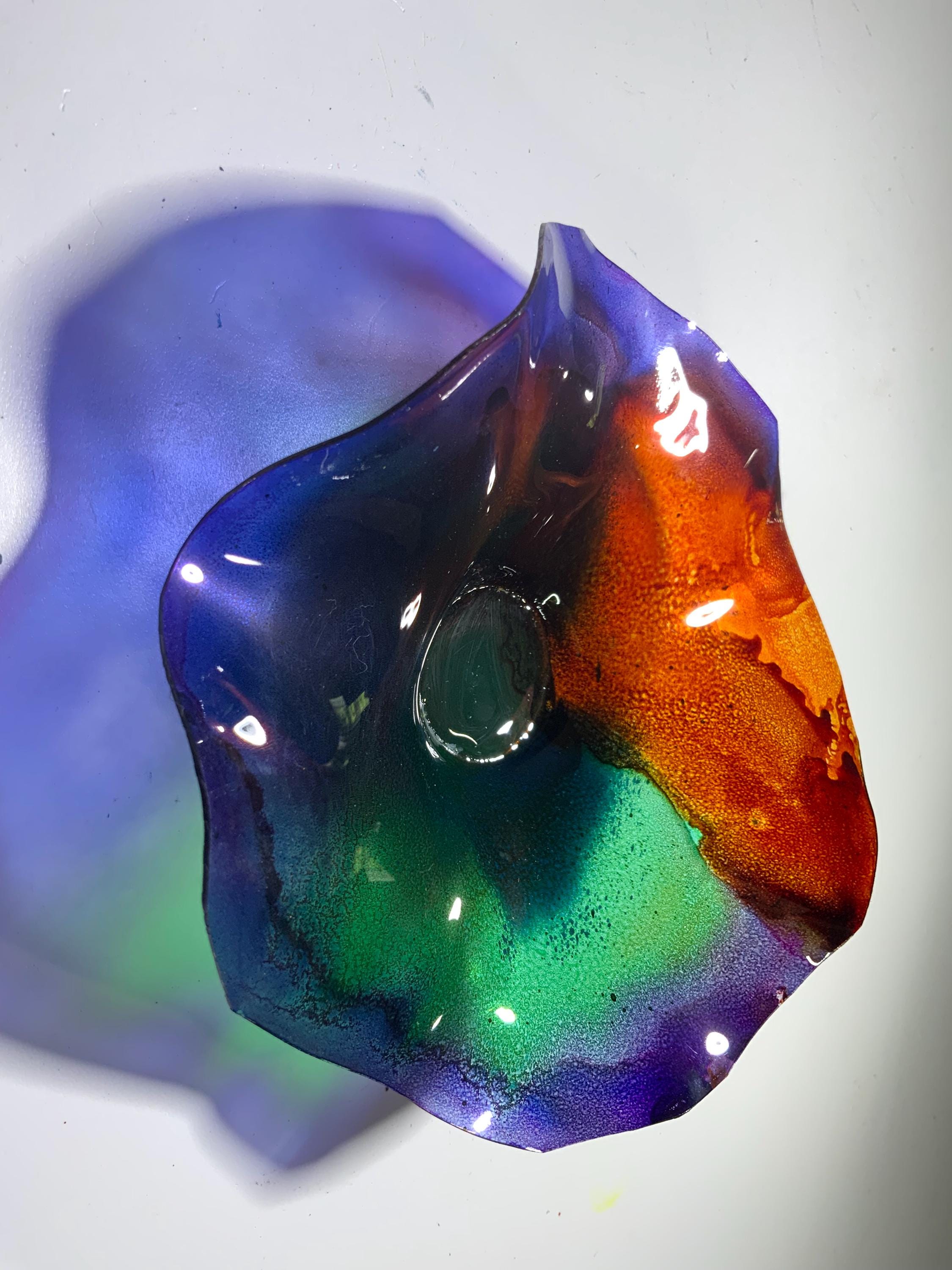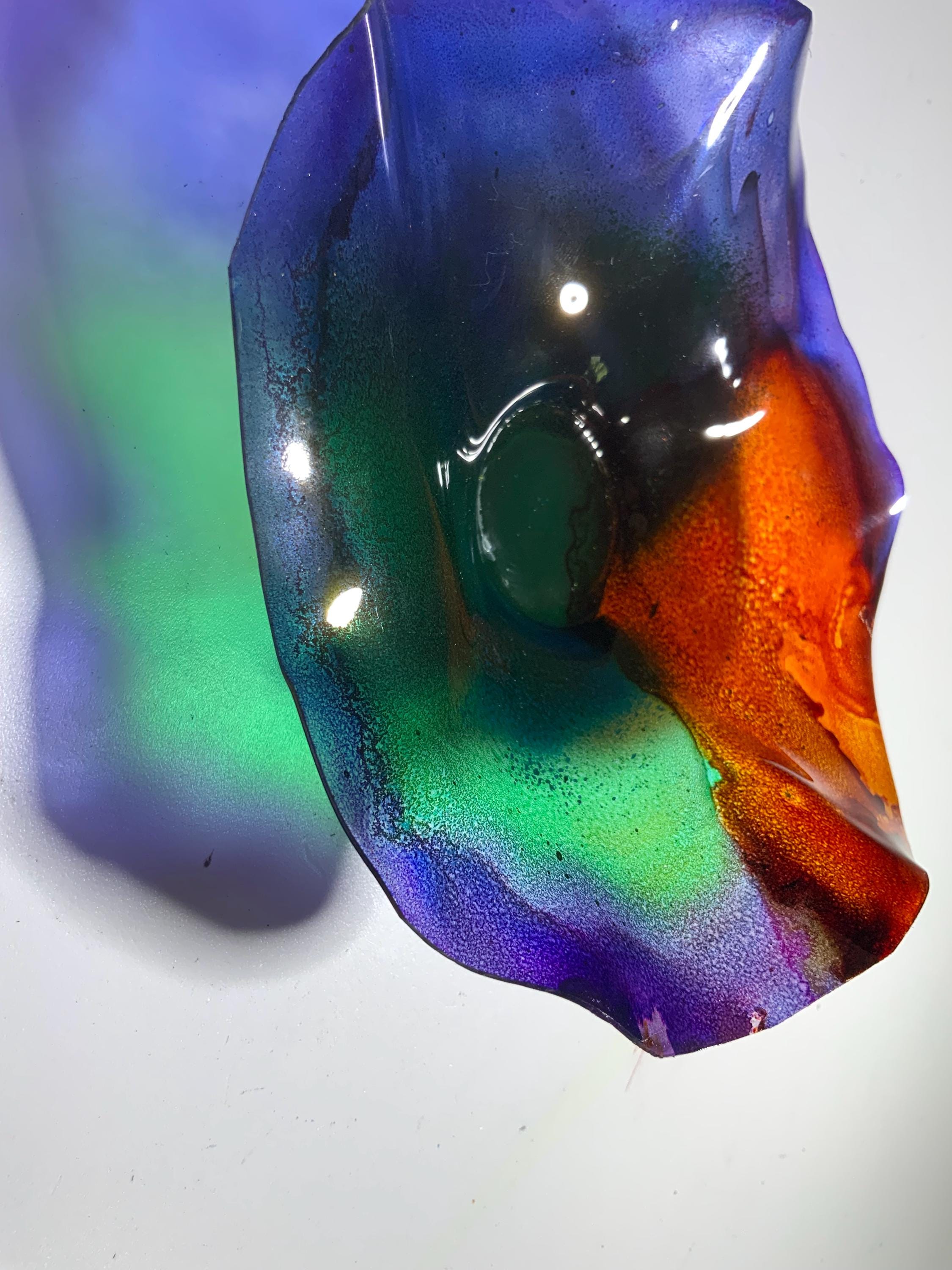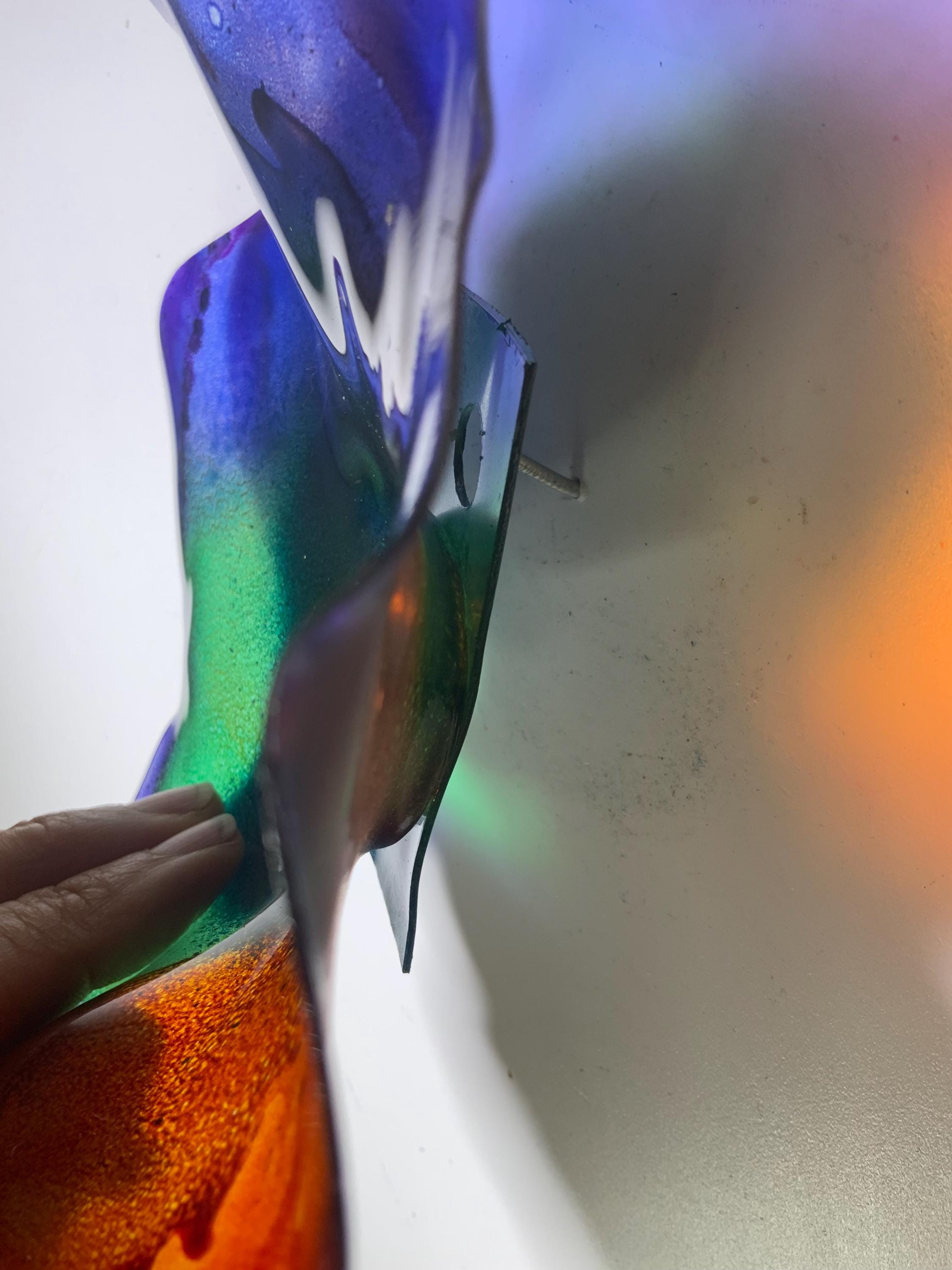 Radiant wall flower stunning shades of translucent purple, blue, green and orange. The light filters through casting a colorful glow to the hanging surface.