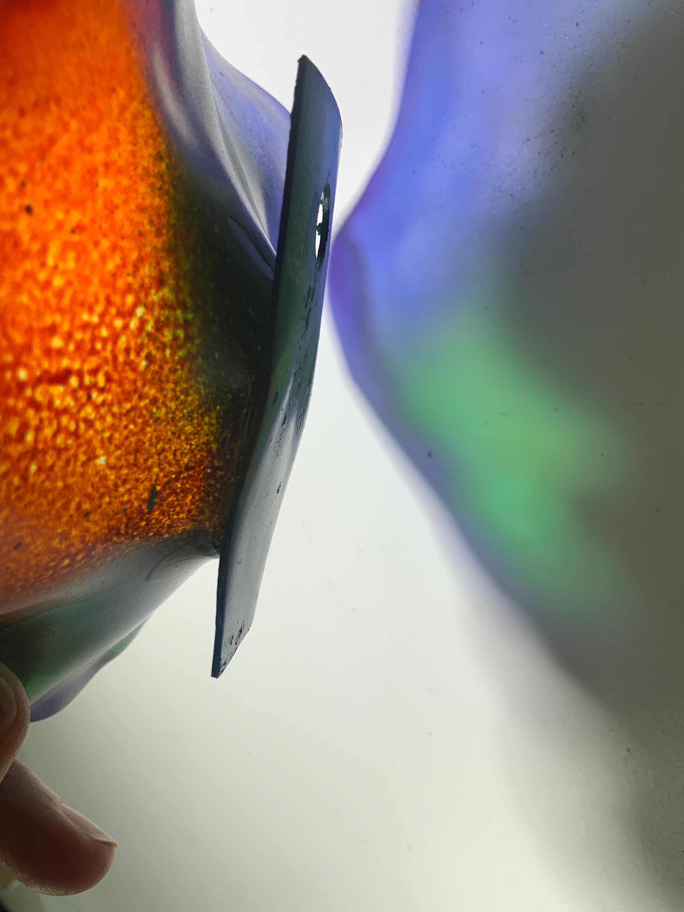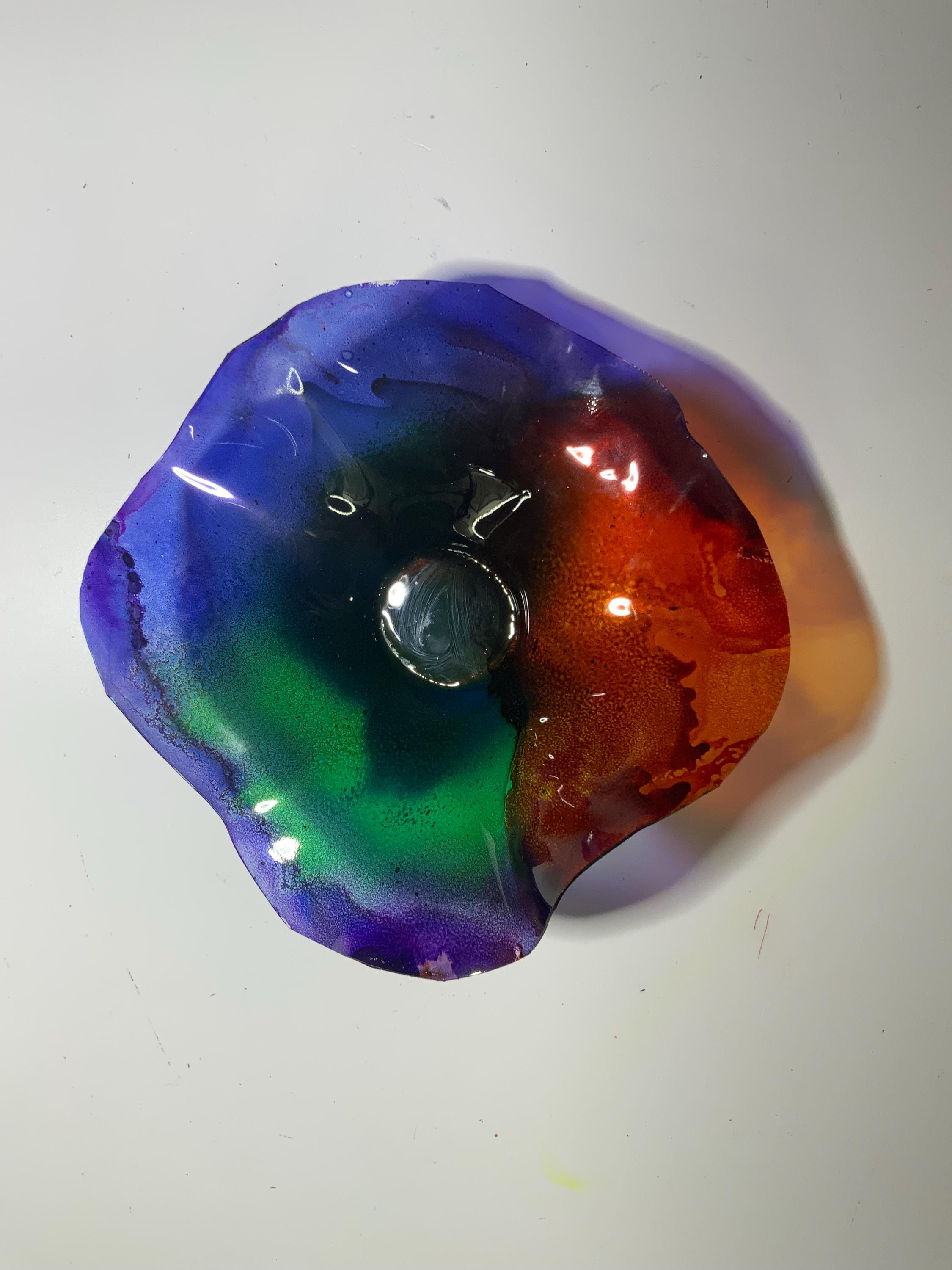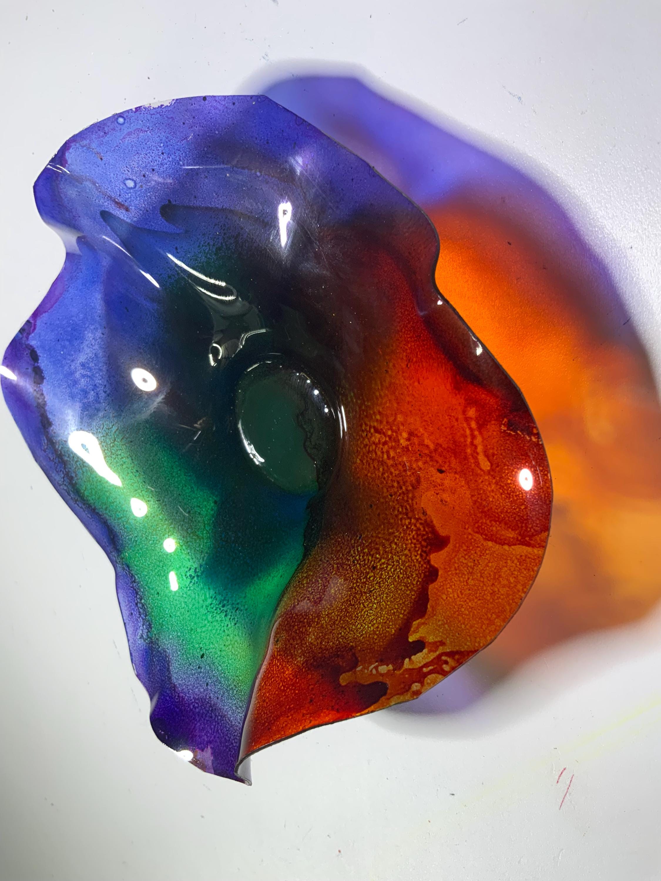 Radiant wall flower stunning shades of translucent purple, blue, green and orange. The light filters through casting a colorful glow to the hanging surface.