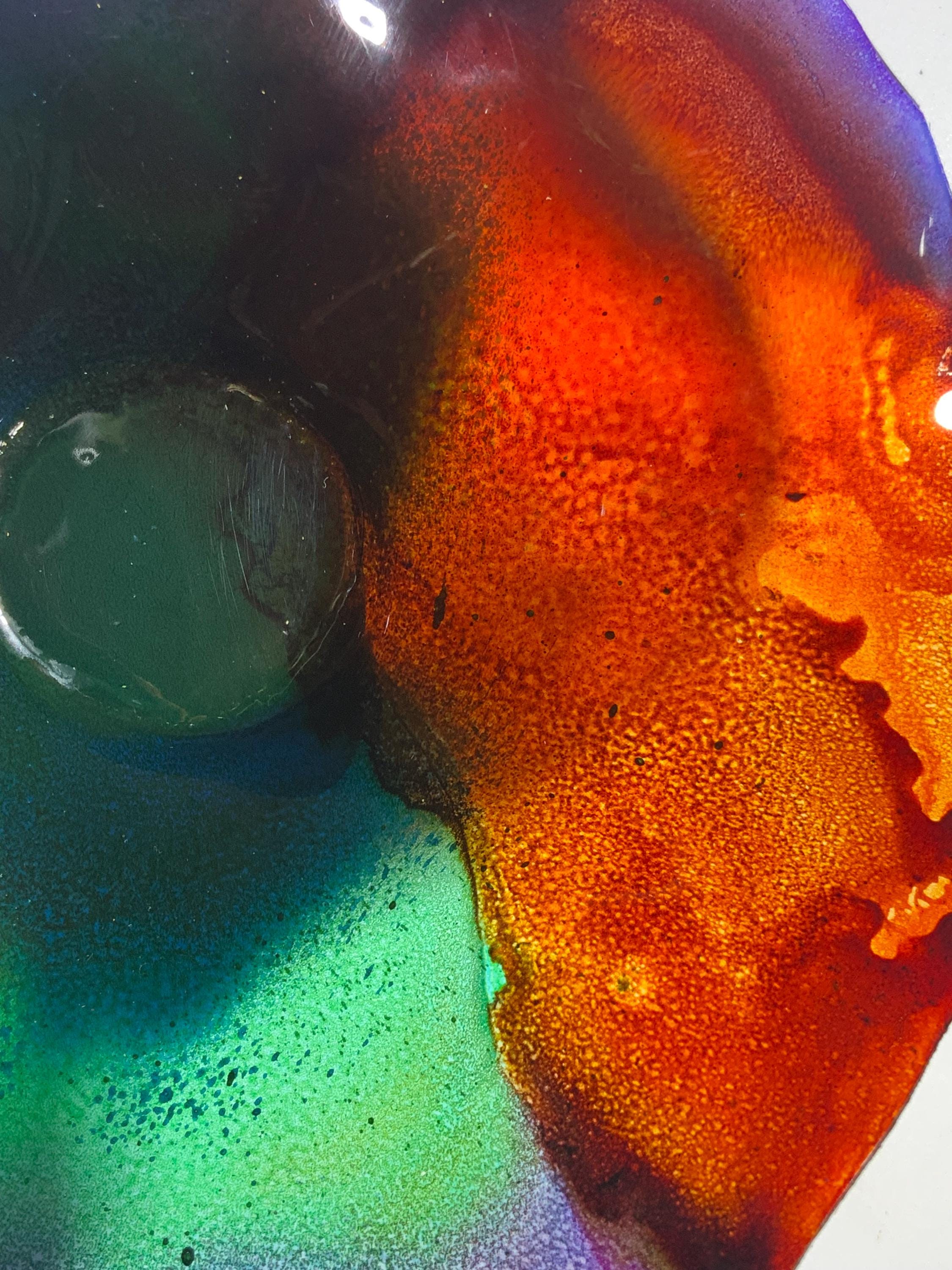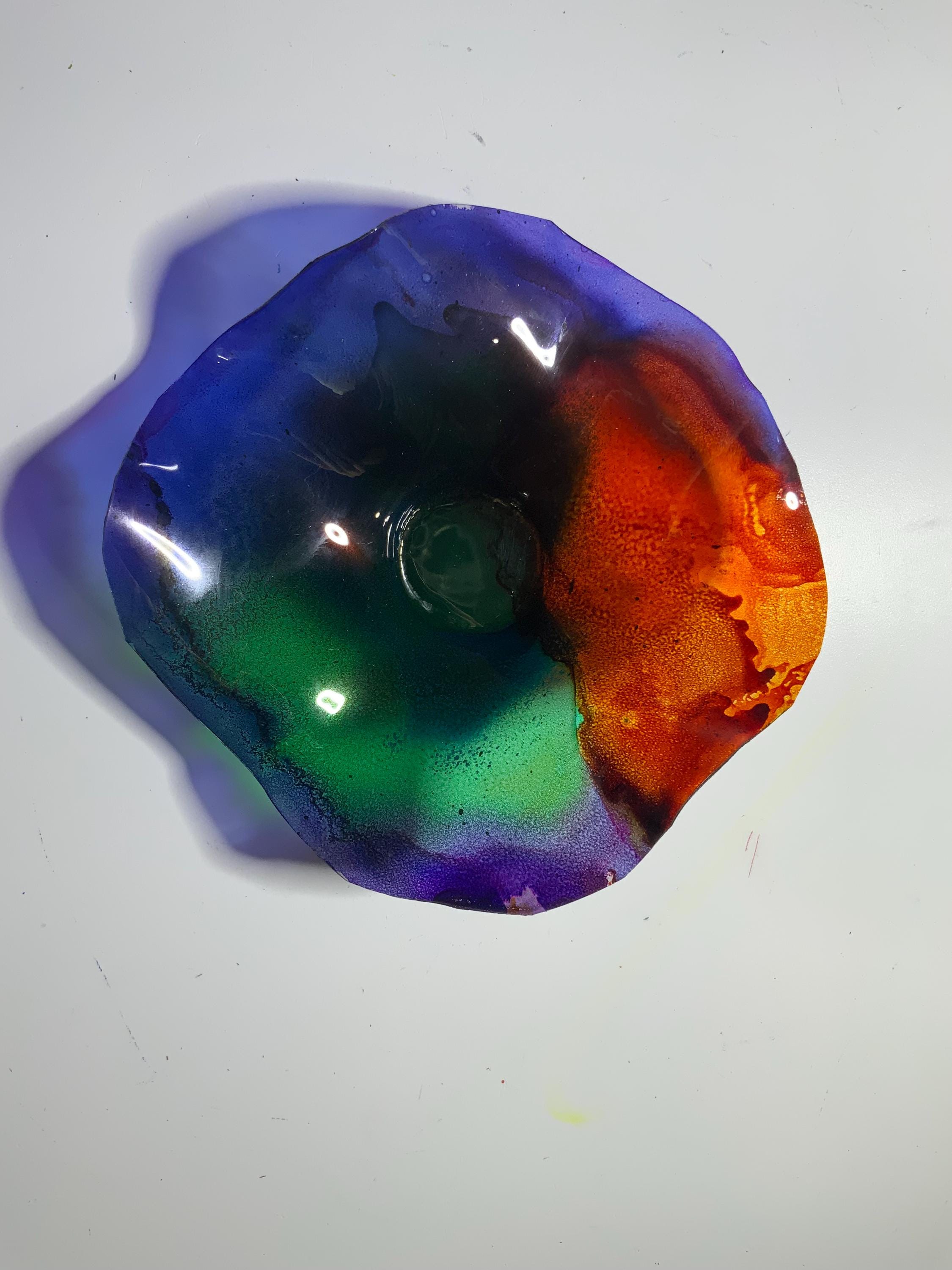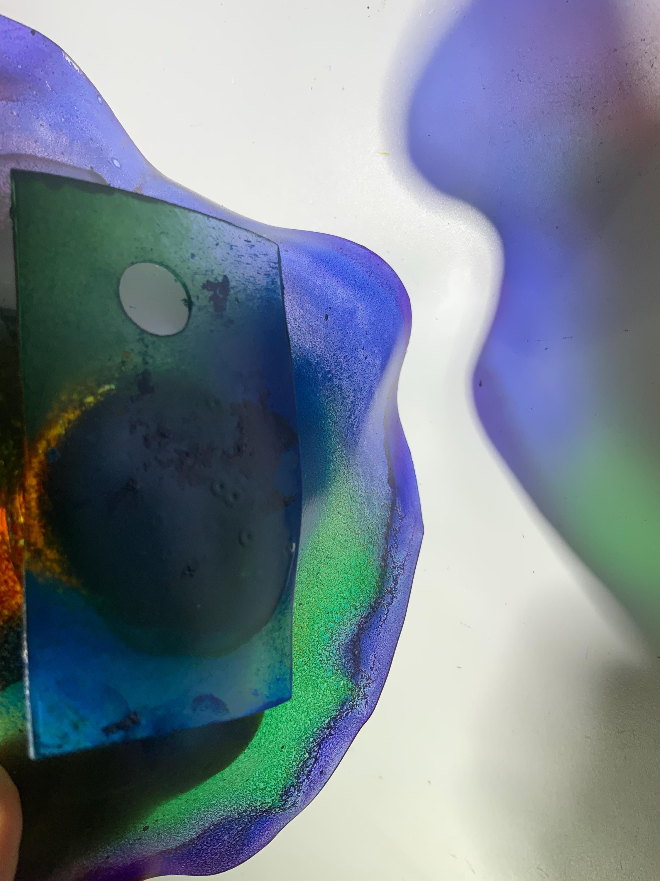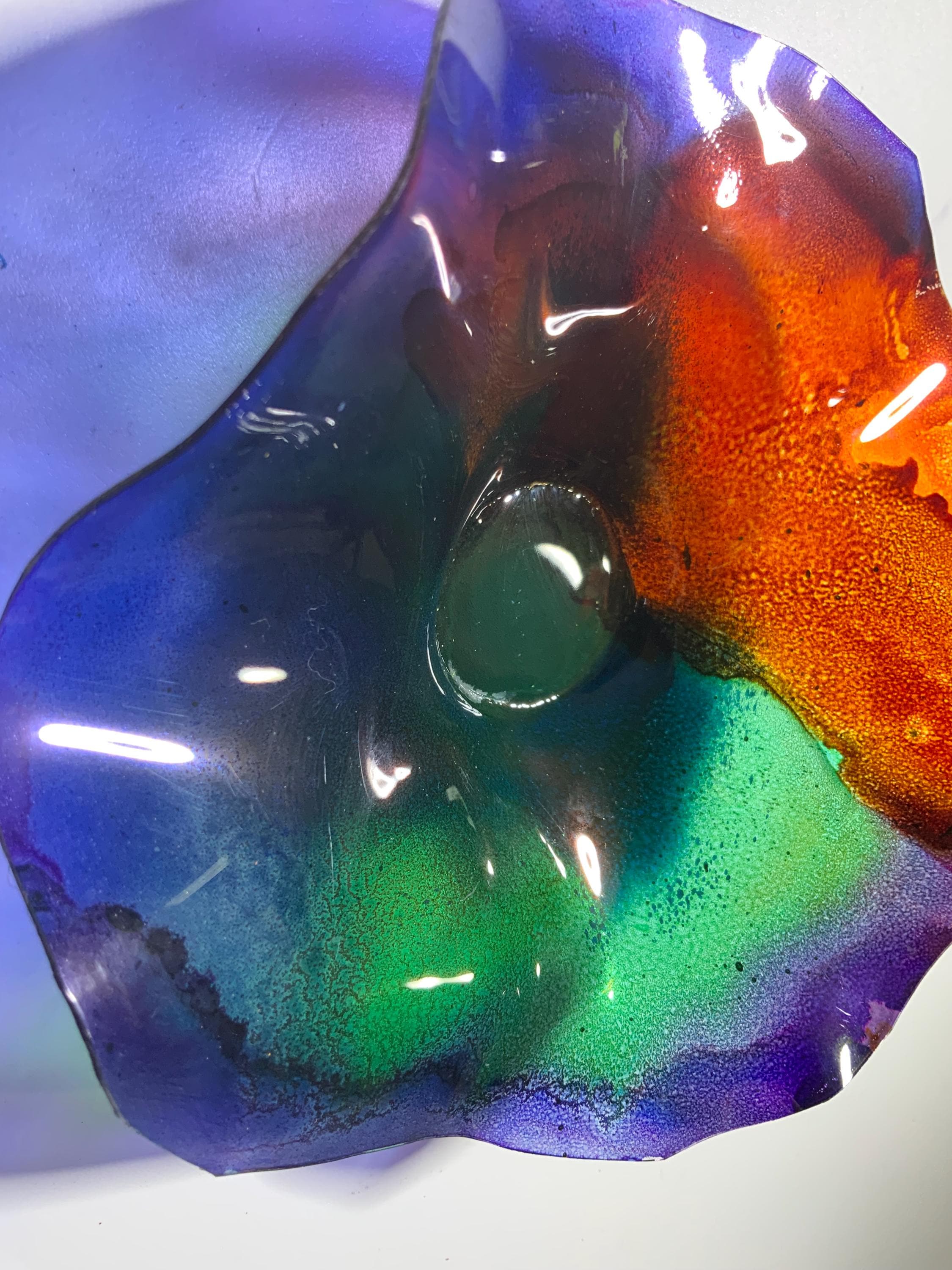 Radiant wall flower stunning shades of translucent purple, blue, green and orange. The light filters through casting a colorful glow to the hanging surface.