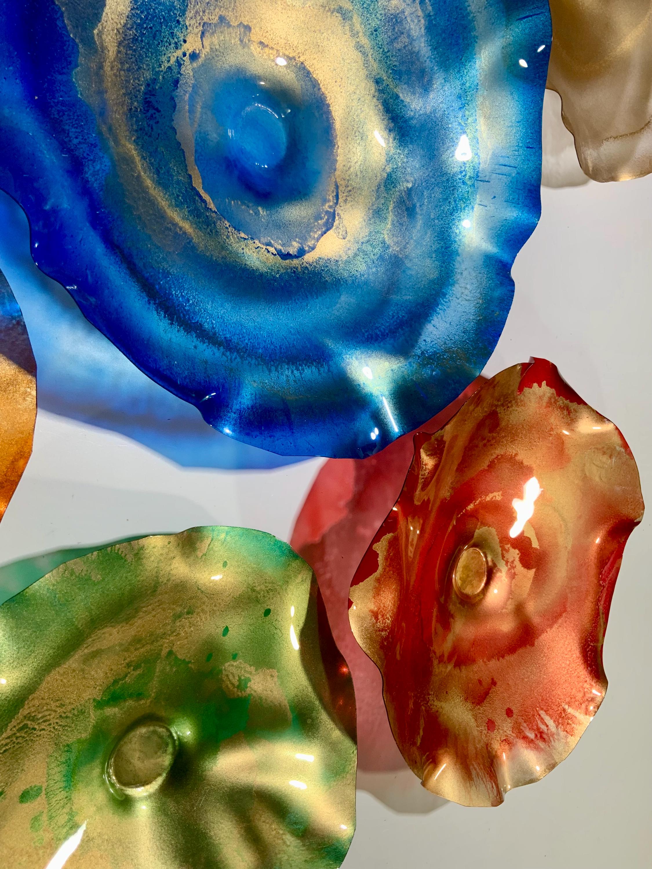 Our wall flowers are made from sustainable recycled PET as in a water bottle. Each piece contains at least 50% recycled polyethylene terphalate (rPET)