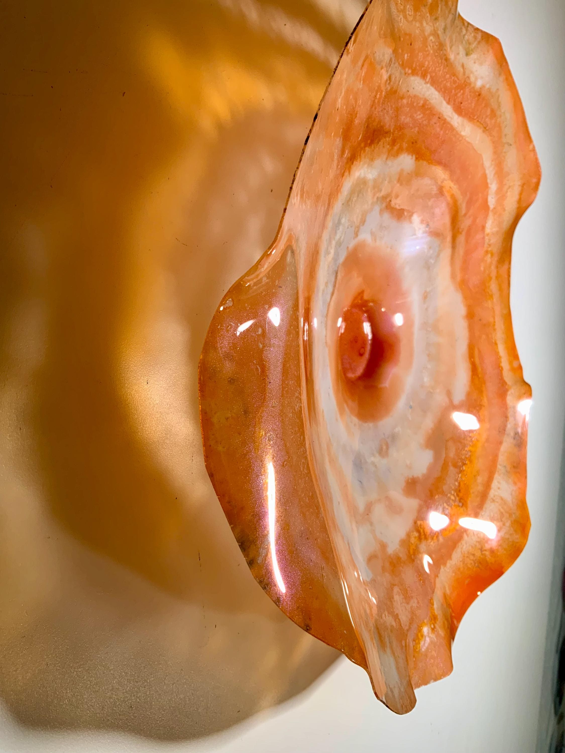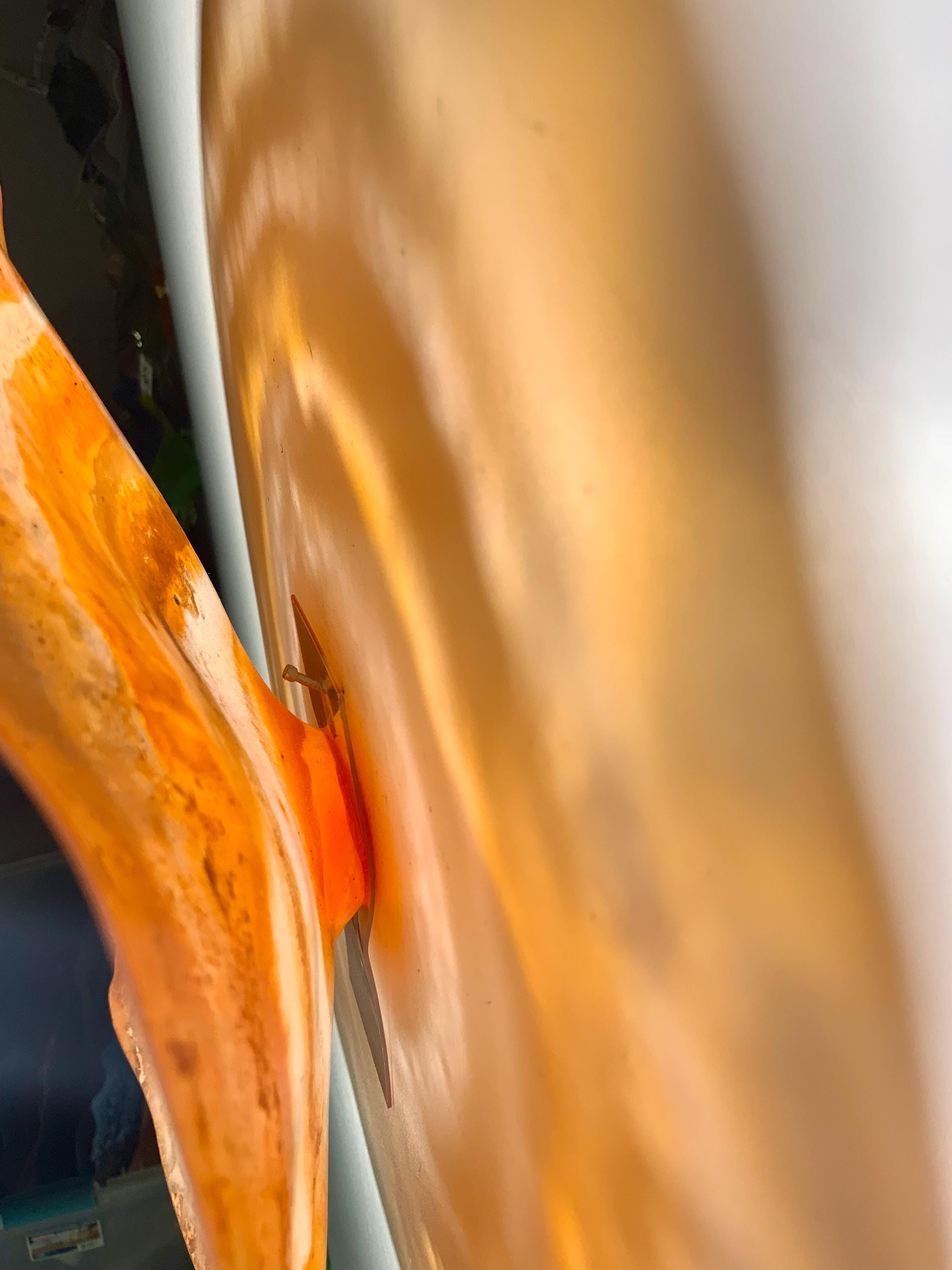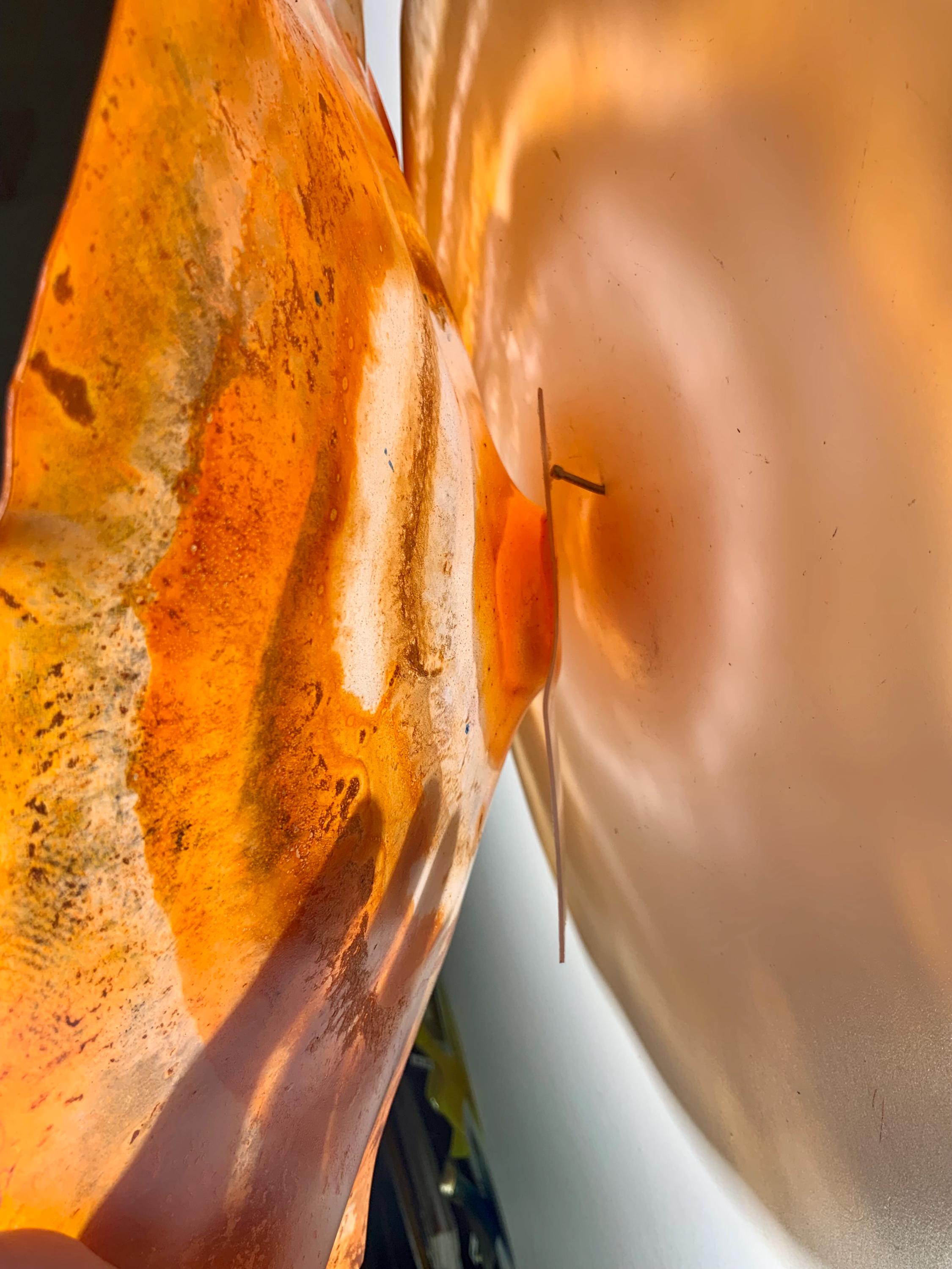 Colorful and inviting amazing one of a kind Wall flower stunning blend of orange and white. The light filters through casting a colorful effect on the hanging surface.