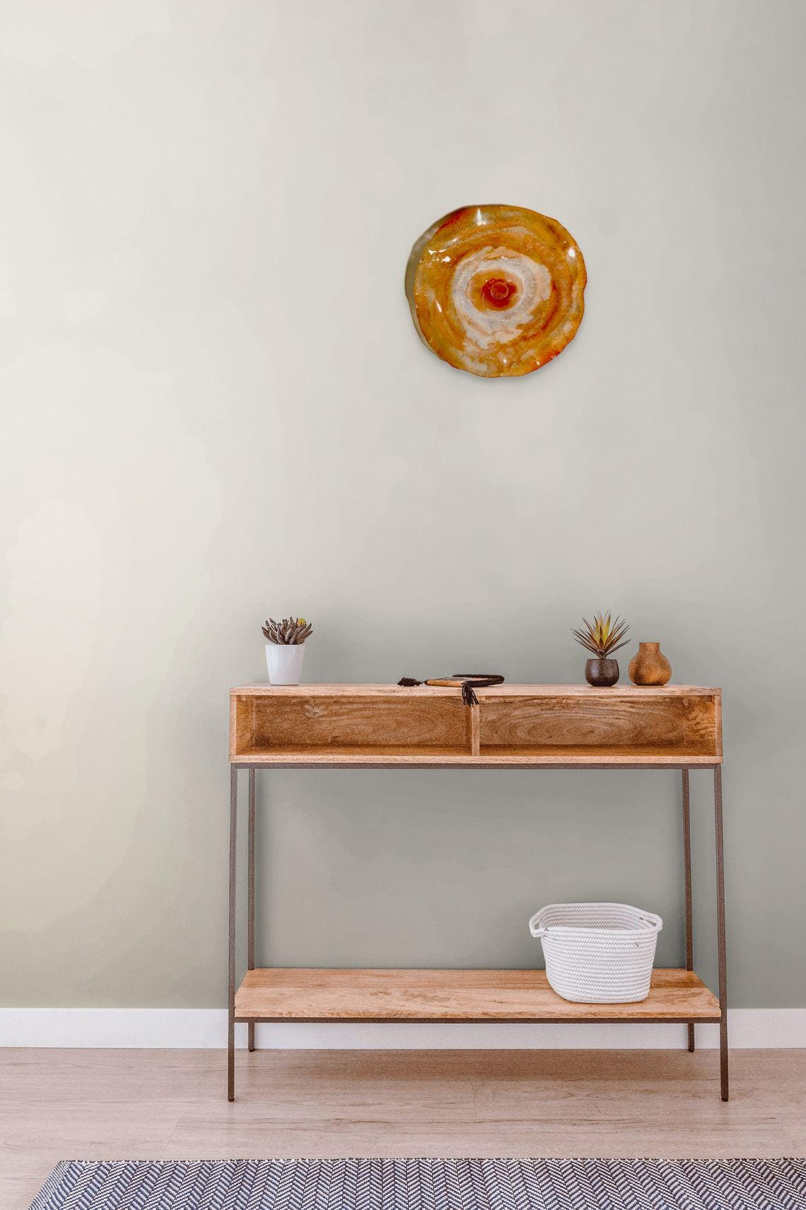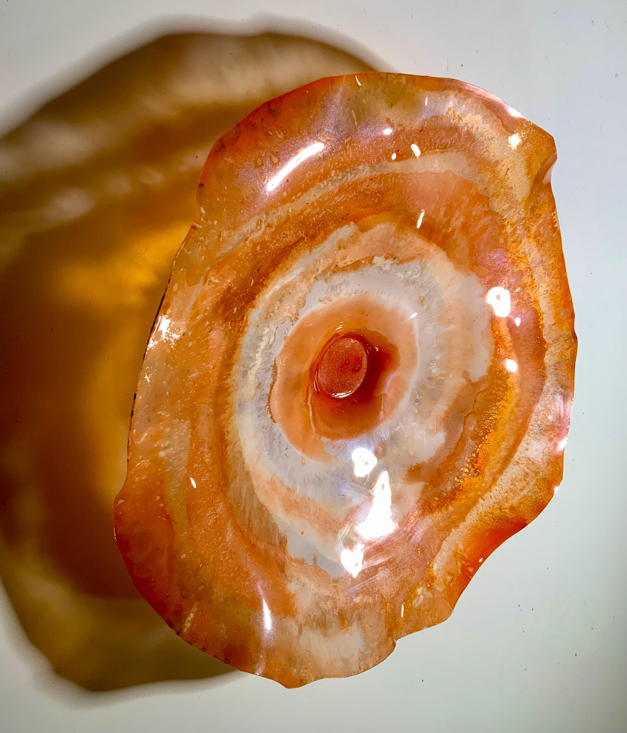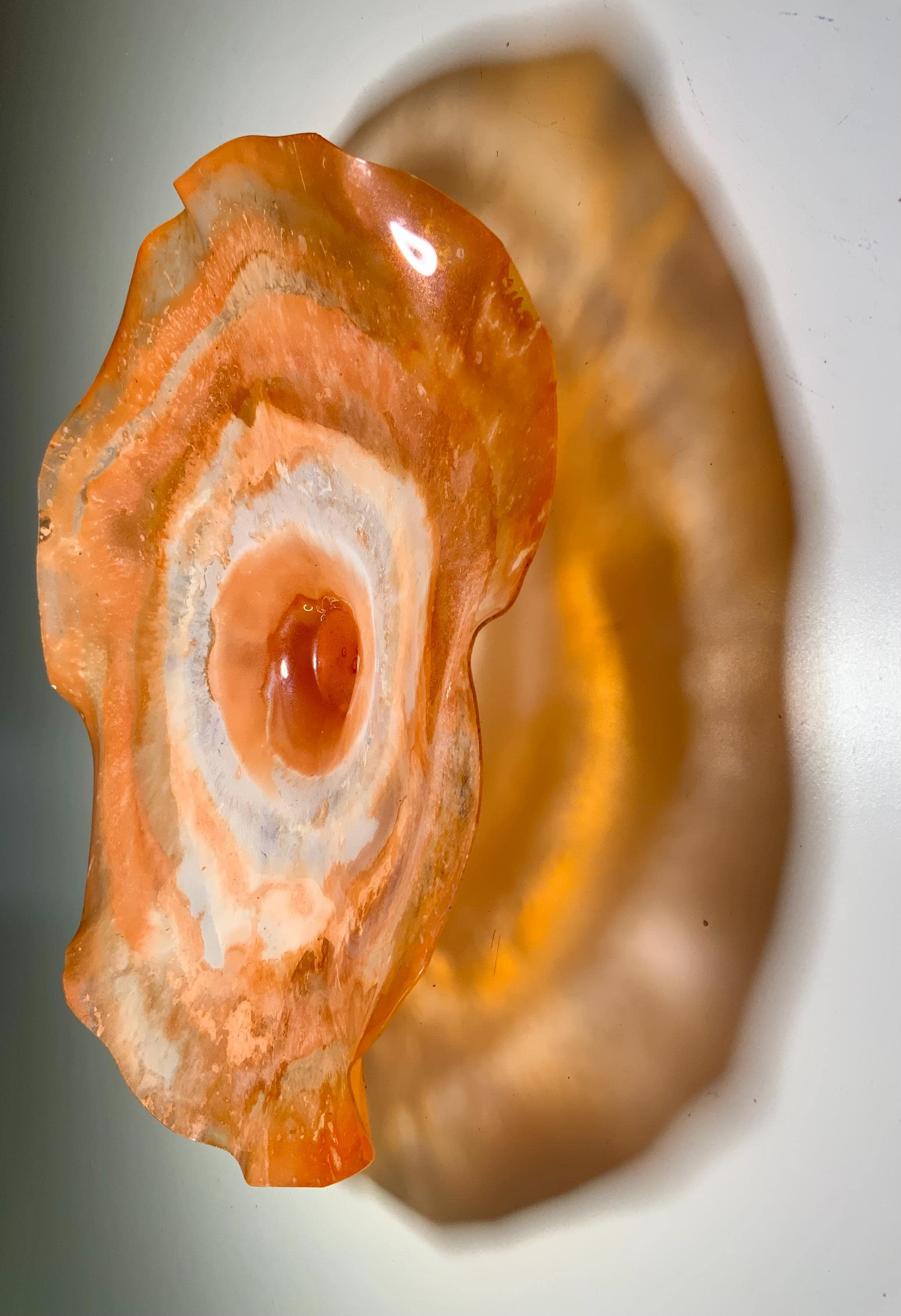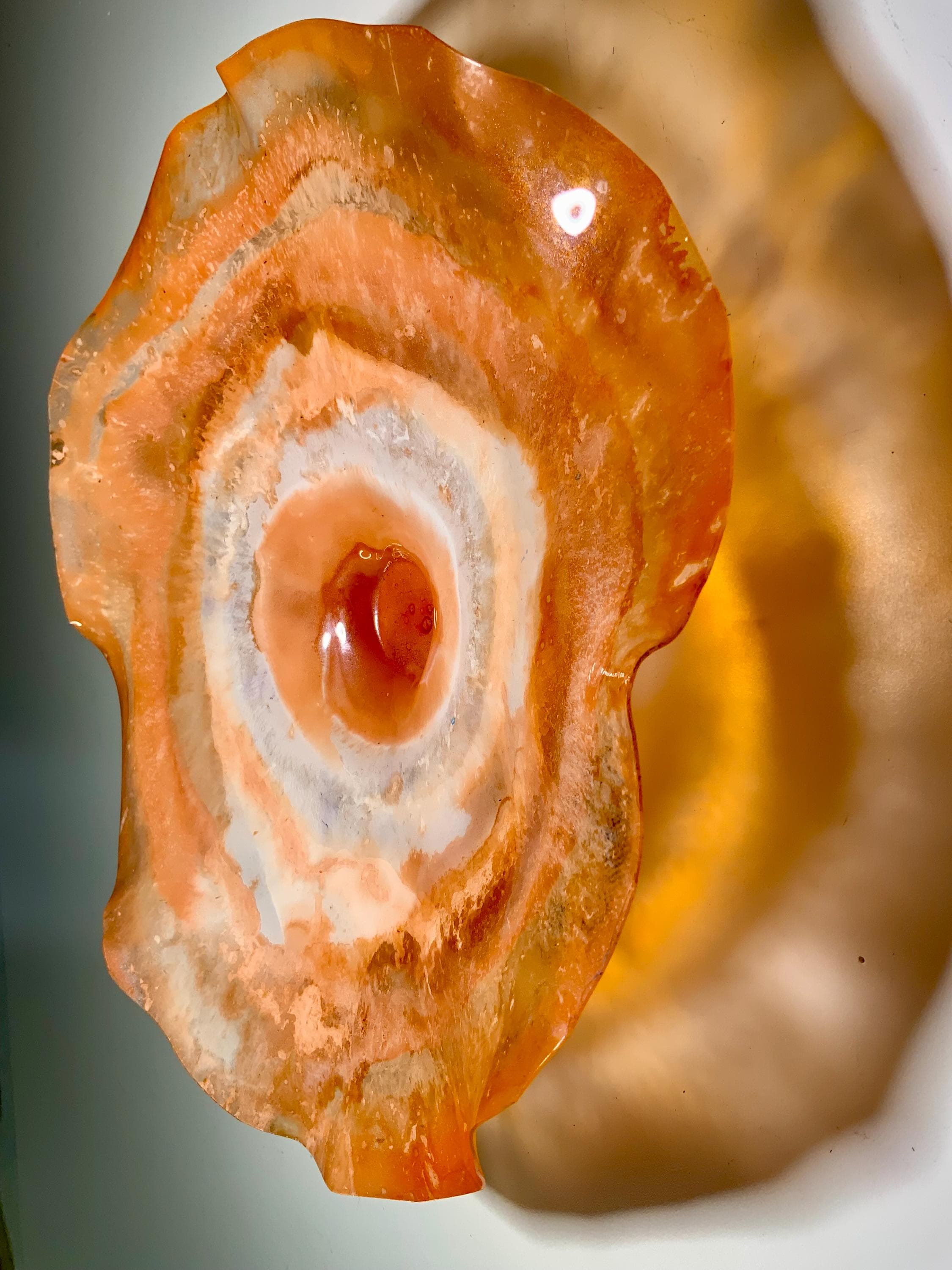 Colorful and inviting amazing one of a kind Wall flower stunning blend of orange and white. The light filters through casting a colorful effect on the hanging surface.