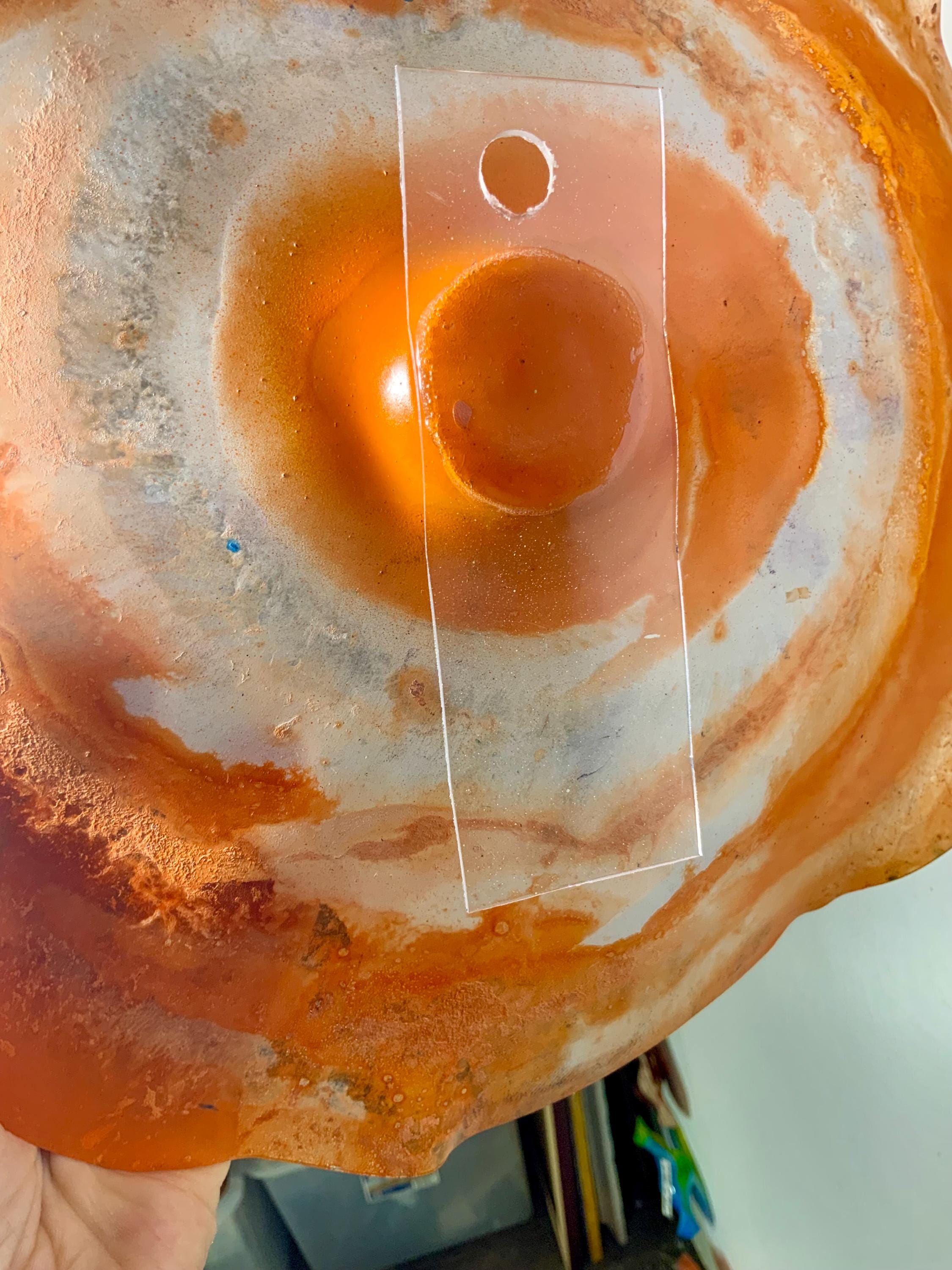 Handmade wall flower coralreeflections art 13”/up cycled plastic orange/white colorful home decor wall hanging/looks like glass