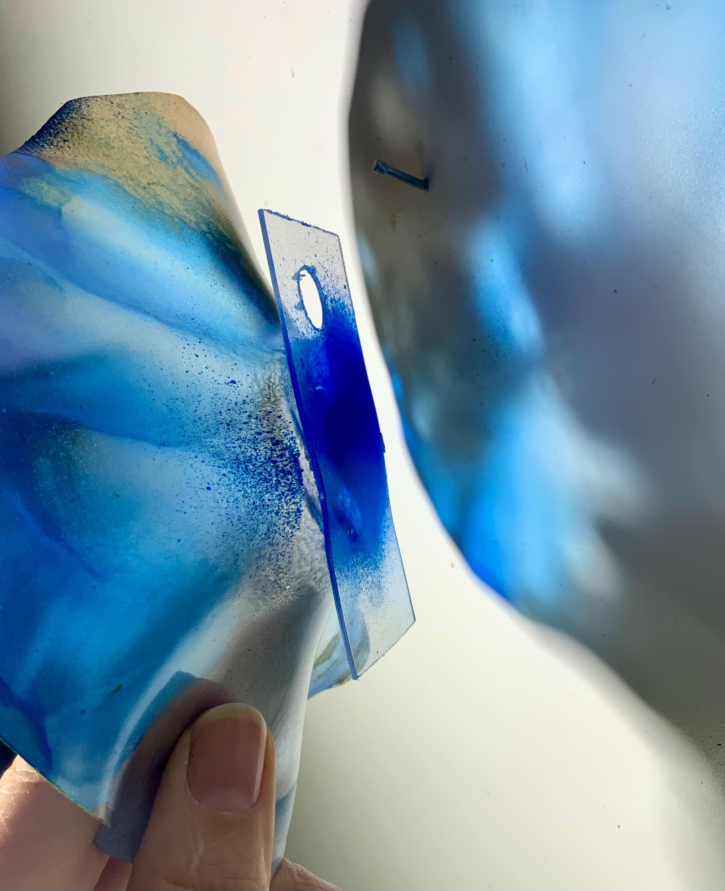 Each collectible piece is unique, no two are alike. This permanent, colorful, eye catching art looks and feels like glass. It shimmers in the light resembling water. They are very DURABLE AND LIGHTWEIGHT. These flowers are easy to hang ,are all weather and UV resistant. Great for indoor or outdoor decorating.